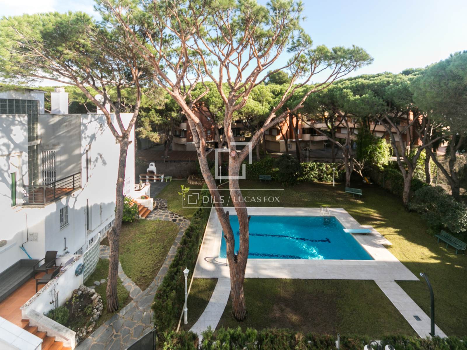 It offers a spacious living room with access to the terrace, a fully equipped kitchen with access to the pool, several bedrooms including a master suite, and versatile spaces ideal as a home cinema, gym, or additional bedrooms. It also features a terrace with views of the pine trees and a private garden with a barbecue area.
