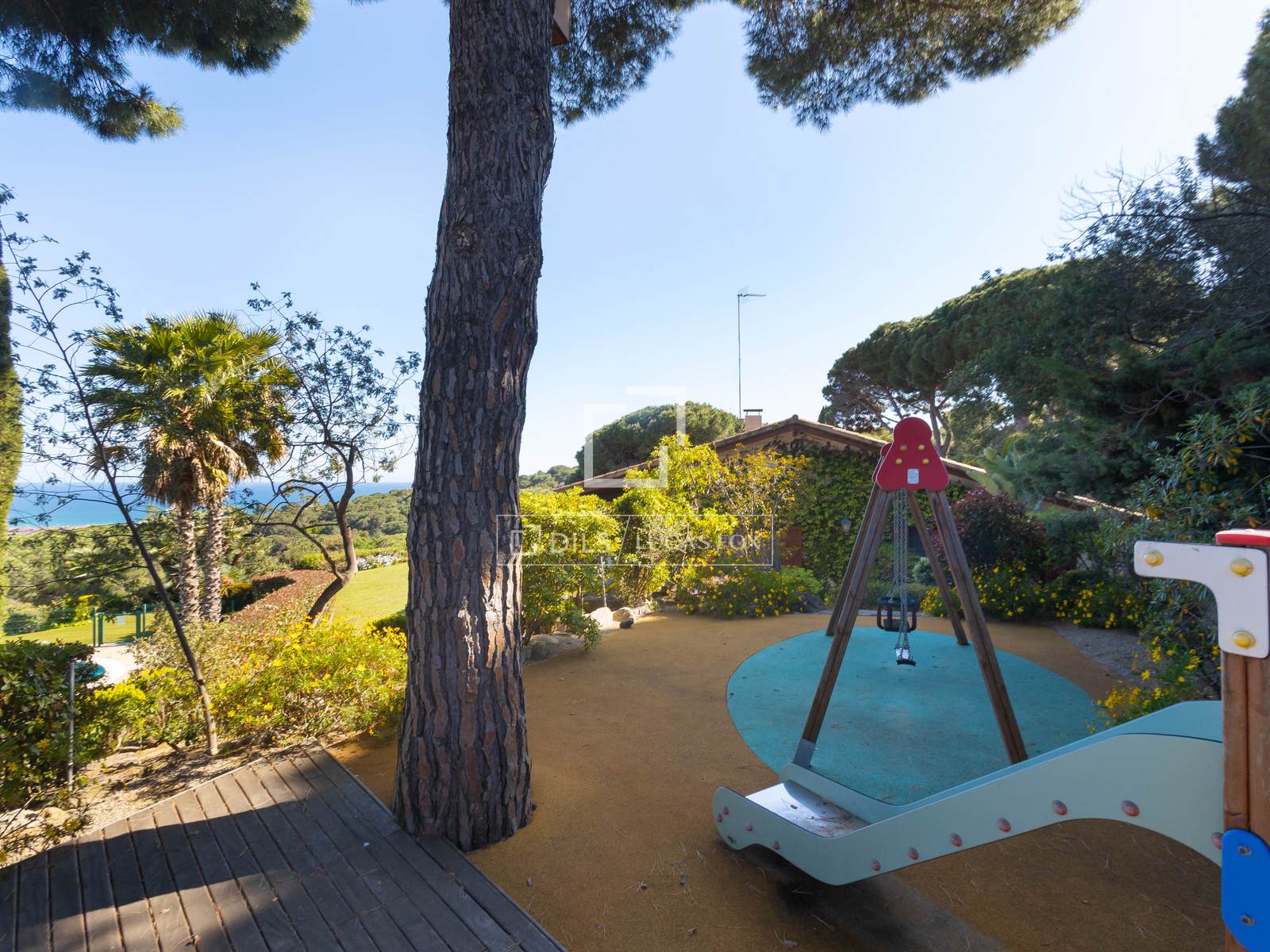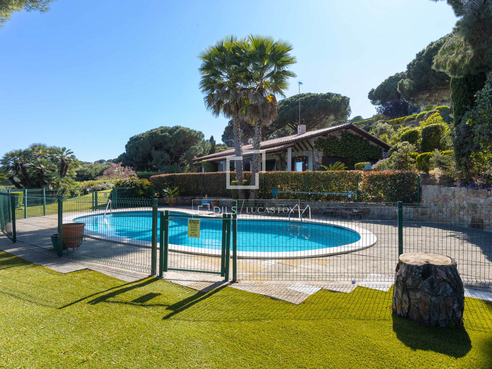 This attractive Mediterranean property was built in 1980, featuring wooden ceiling beams and wooden framed windows. It is distributed across one level overlooking a beautiful large lawn with Mediterranean plants. The built area measures 300 m² and sits on a 4,553 m² plot where you can find a large kidney-shaped pool that is secure and fenced, a kids' playground, and a sauna. Continuing down the path, there is a tennis court, a changing room. Furthermore, you can stretch your legs to walk around the property in the middle of a mature garden. There is a separate guest apartment used as a gym with a single bedroom and full bathroom. Perfect to set up a studio, gym or guest apartment.