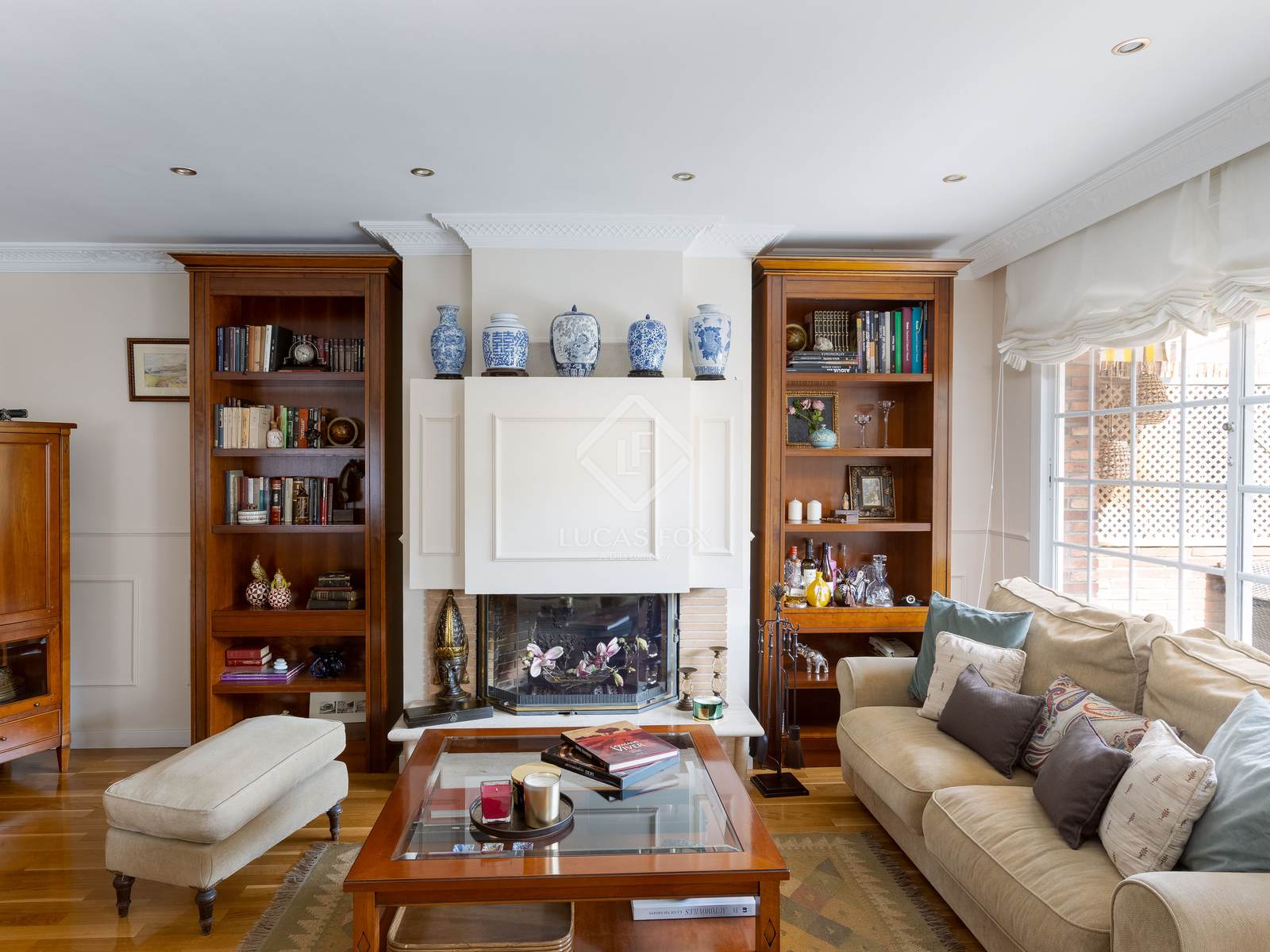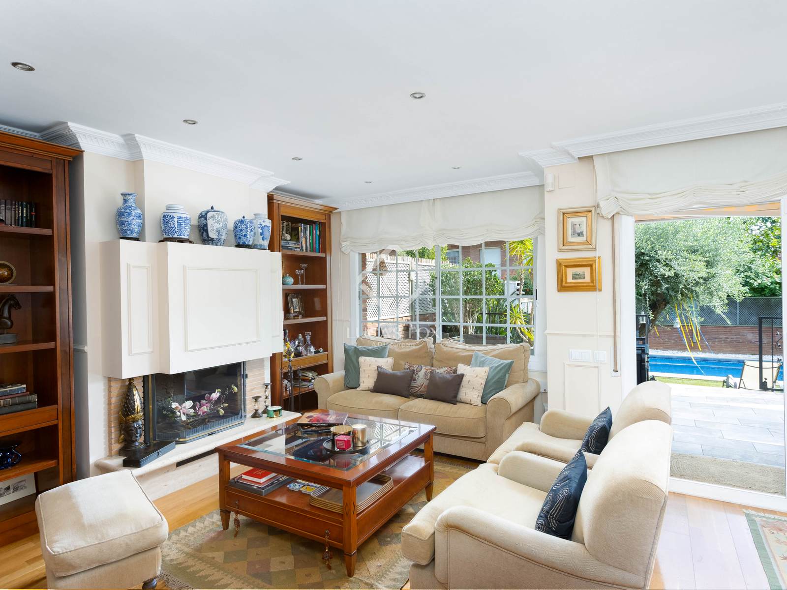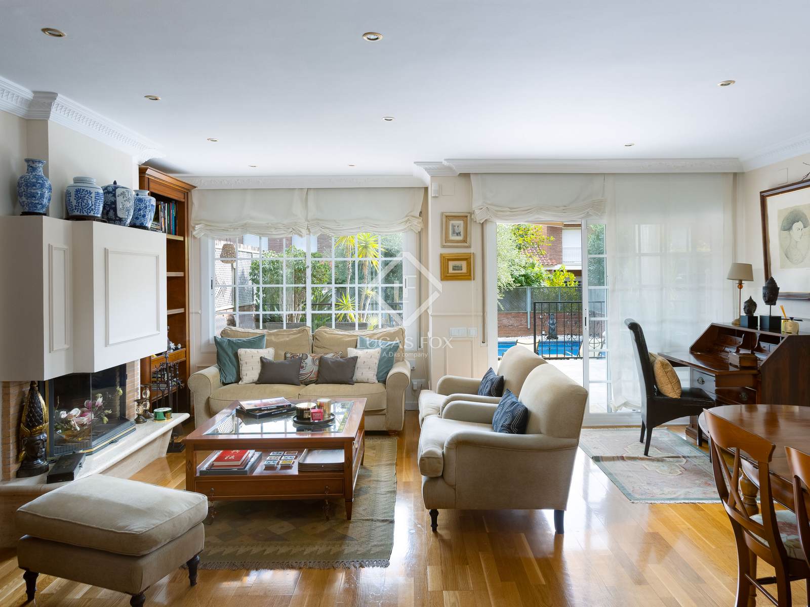 - living-dining room with fireplace and access to the private garden with swimming pool.