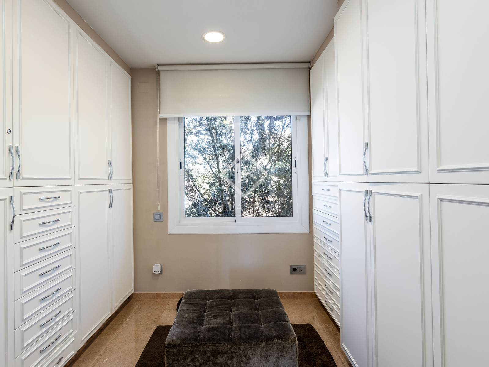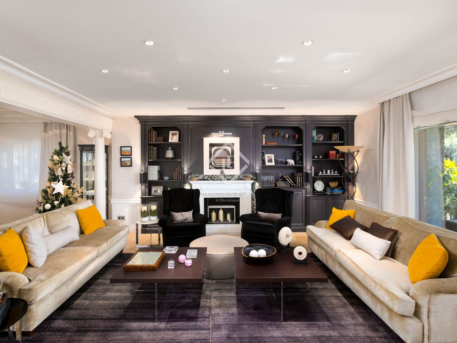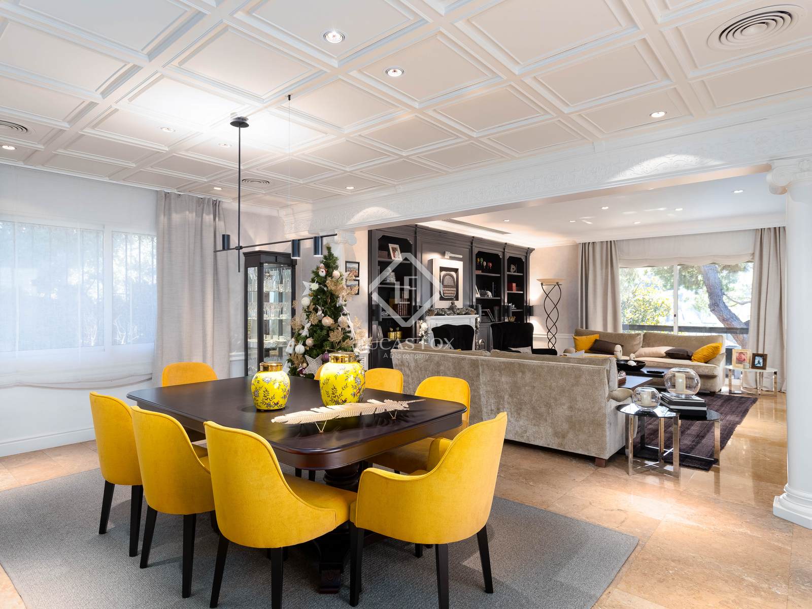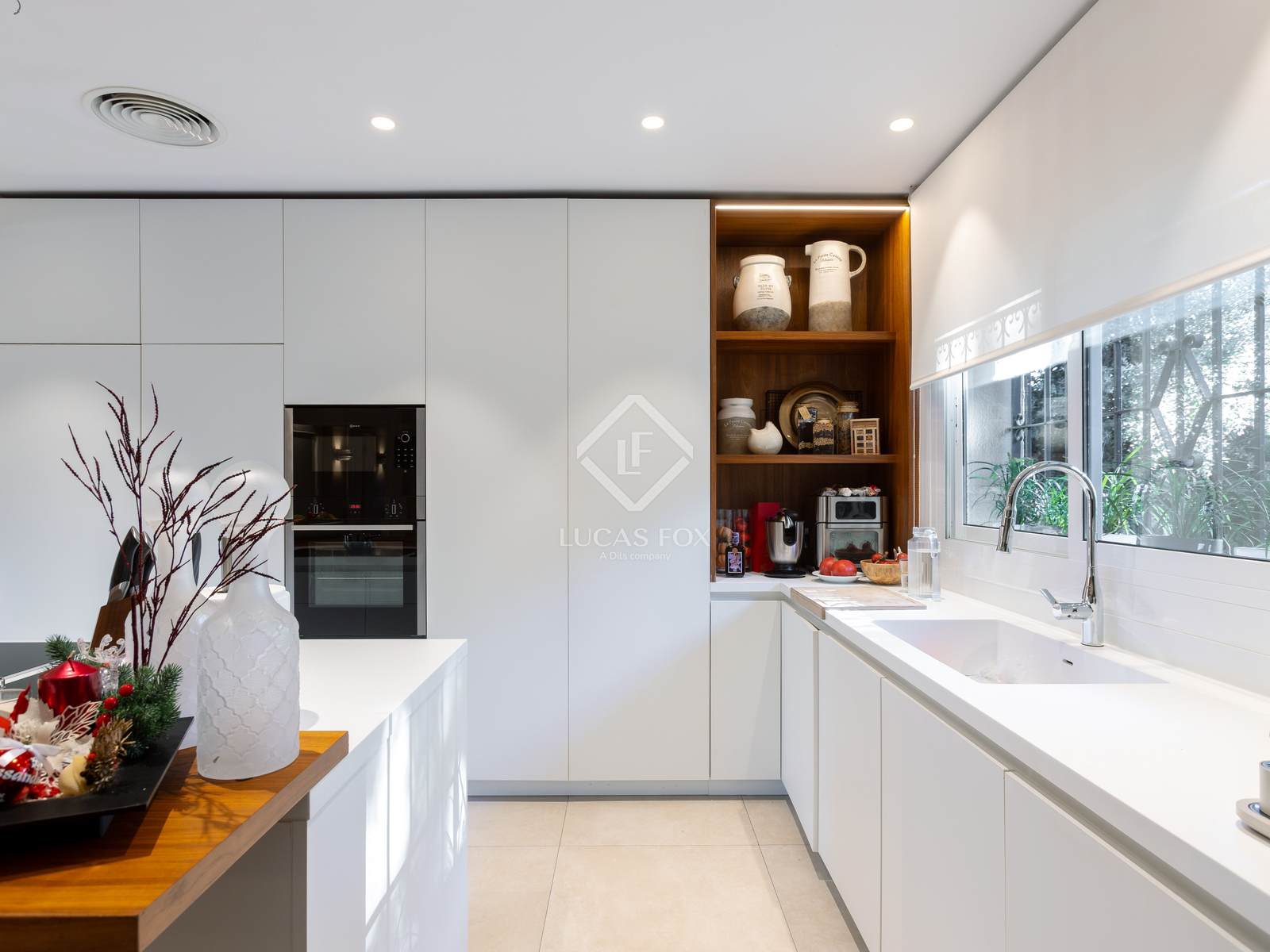 The day area, also with direct access from the hall, stands out for its generous dimensions and natural light. It features a large dining area and living room, an open and inviting space with abundant sunlight, a fireplace, and direct access to the main porch overlooking the garden. From here, you can also enter the kitchen, which is equipped with high-quality appliances — induction hob, griddle, wine cooler — extensive storage space and a remarkable sense of openness. The kitchen incorporates a cosy family sitting area with sofas and a television. This space connects directly to a large terrace with a barbecue area.