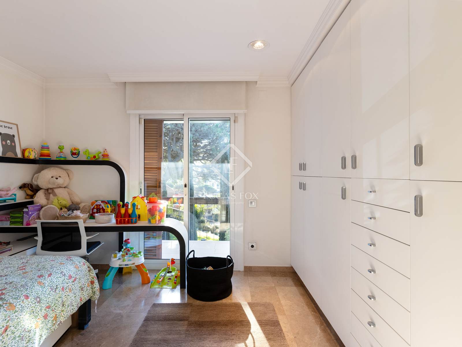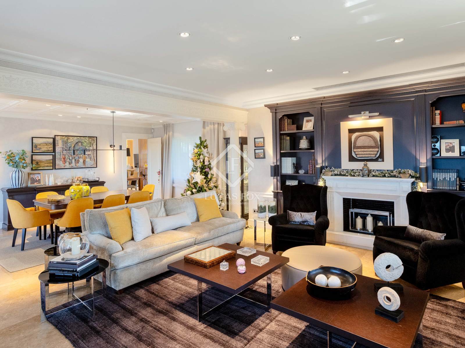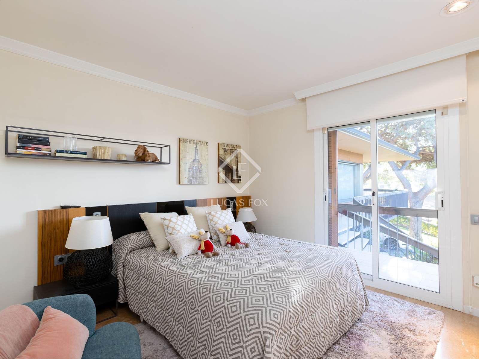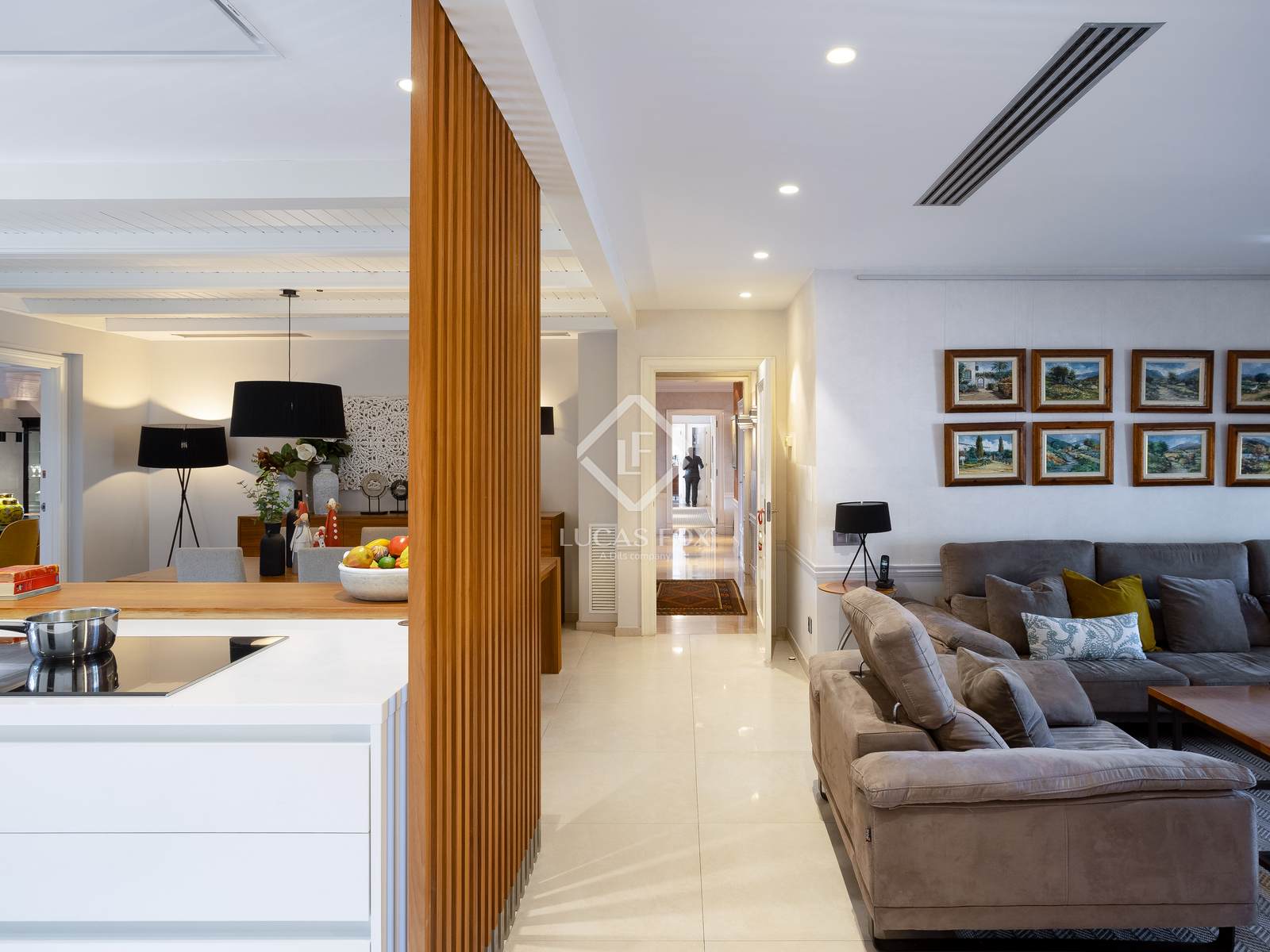 The day area, also with direct access from the hall, stands out for its generous dimensions and natural light. It features a large dining area and living room, an open and inviting space with abundant sunlight, a fireplace, and direct access to the main porch overlooking the garden. From here, you can also enter the kitchen, which is equipped with high-quality appliances — induction hob, griddle, wine cooler — extensive storage space and a remarkable sense of openness. The kitchen incorporates a cosy family sitting area with sofas and a television. This space connects directly to a large terrace with a barbecue area.