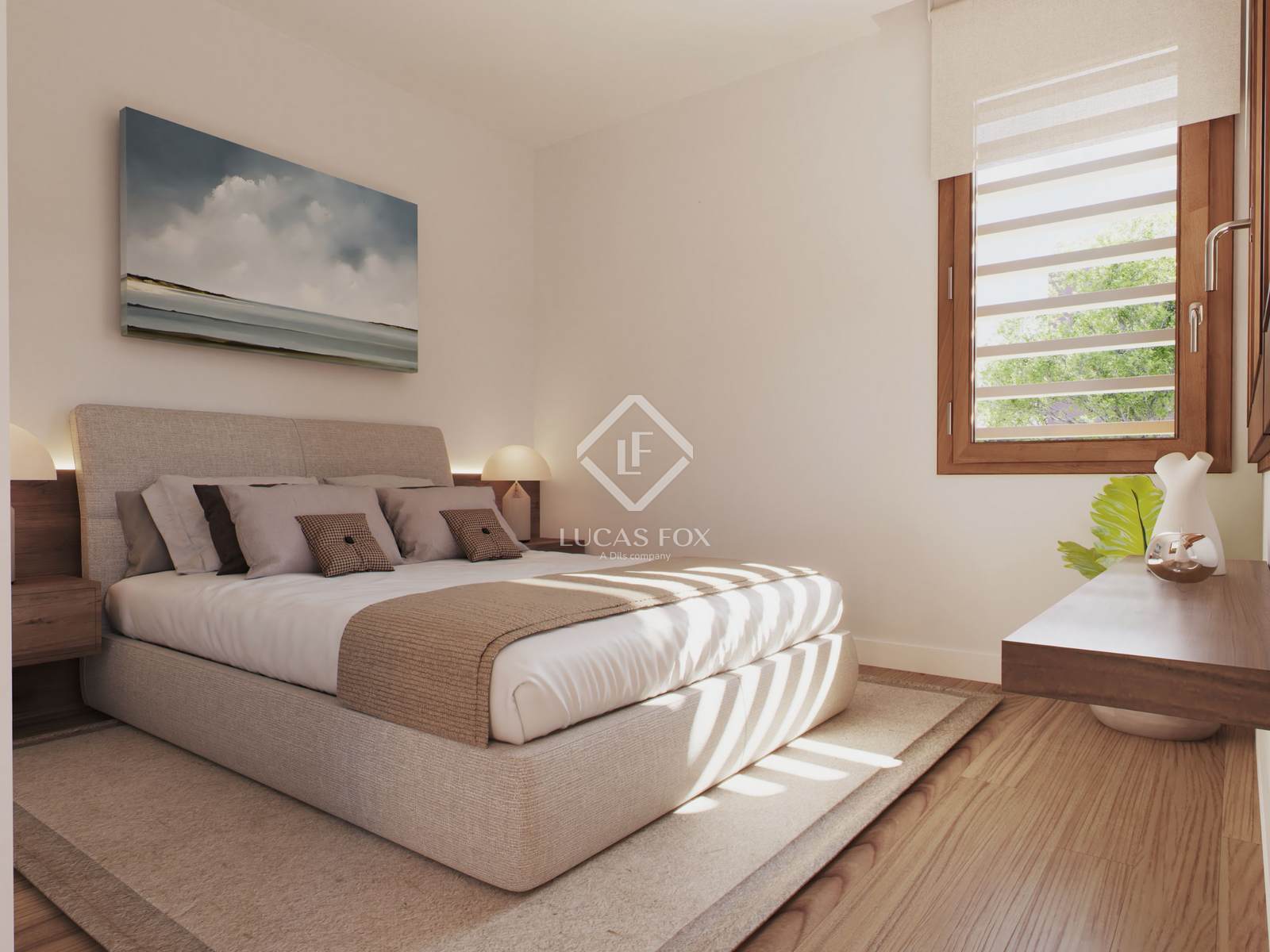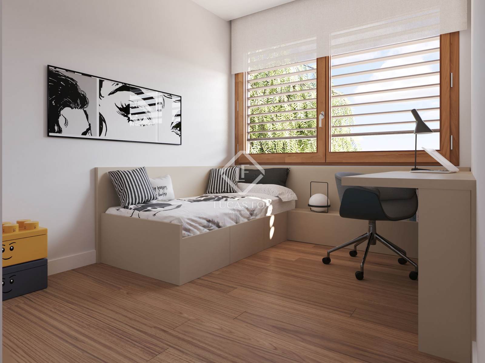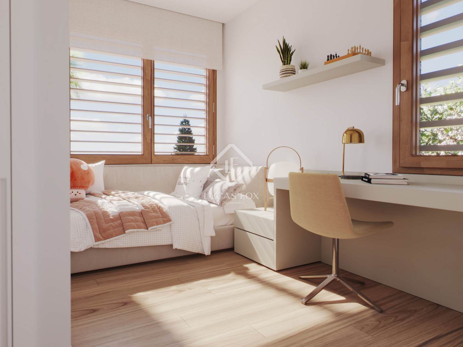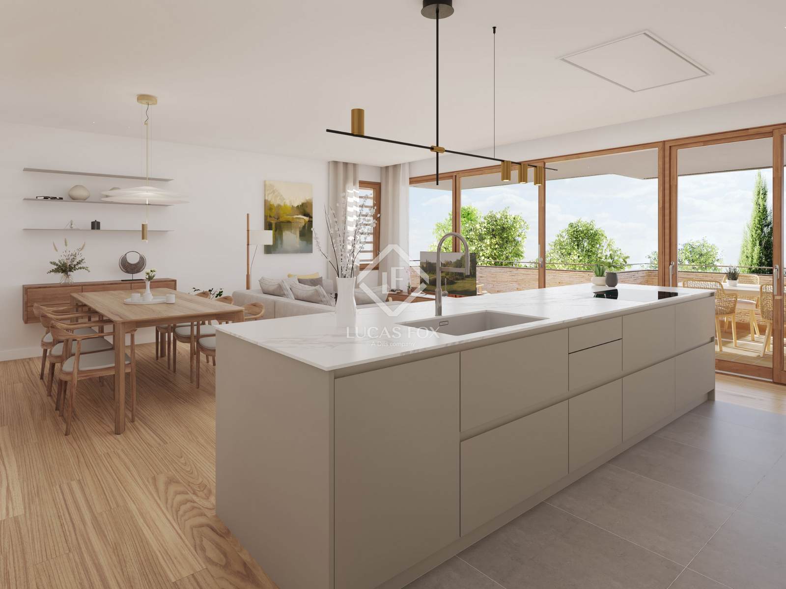 Exclusive new build 118m² apartment with an 18m² terrace. It features 4 bedrooms, 3 parking spaces, and a garden area with a communal pool. For sale in Sant Just Desvern.