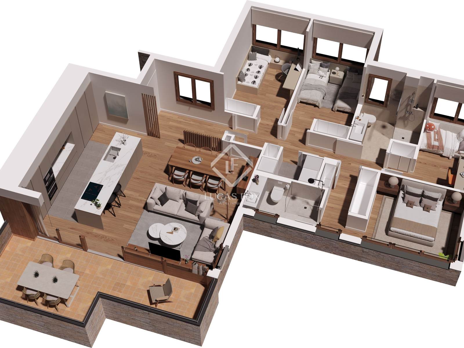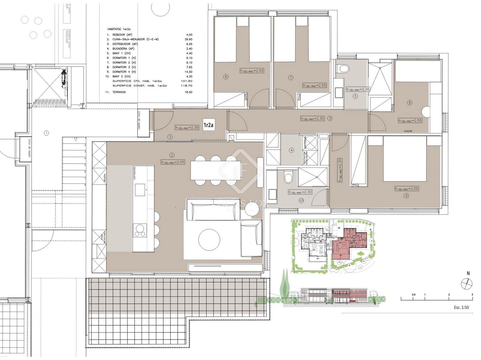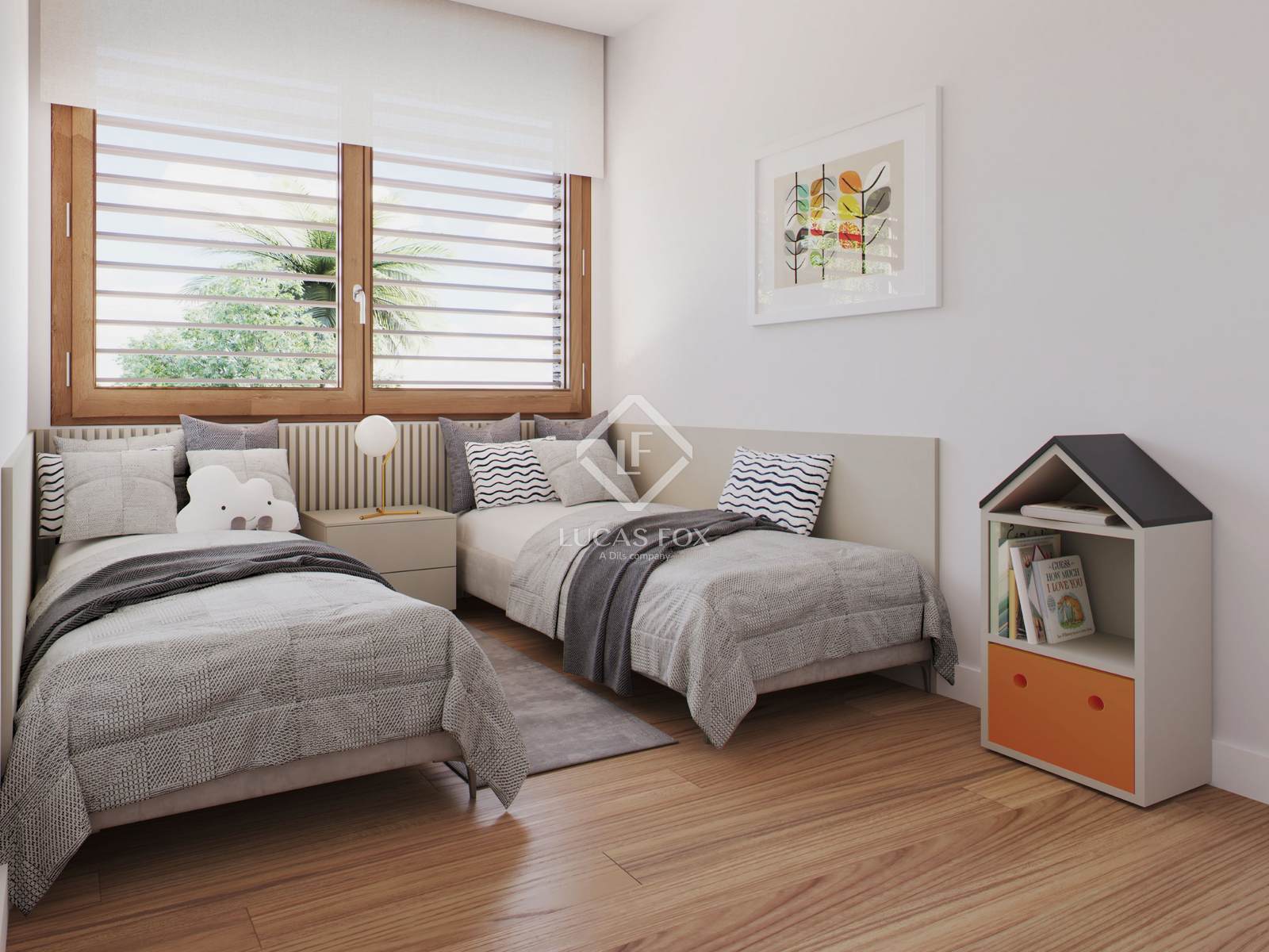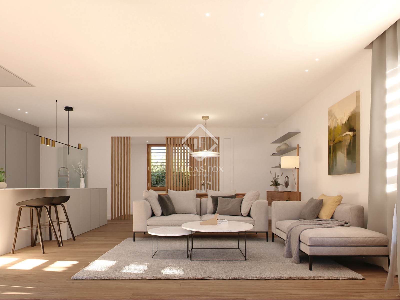 Exclusive new build 118m² apartment with an 18m² terrace. It features 4 bedrooms, 3 parking spaces, and a garden area with a communal pool. For sale in Sant Just Desvern.