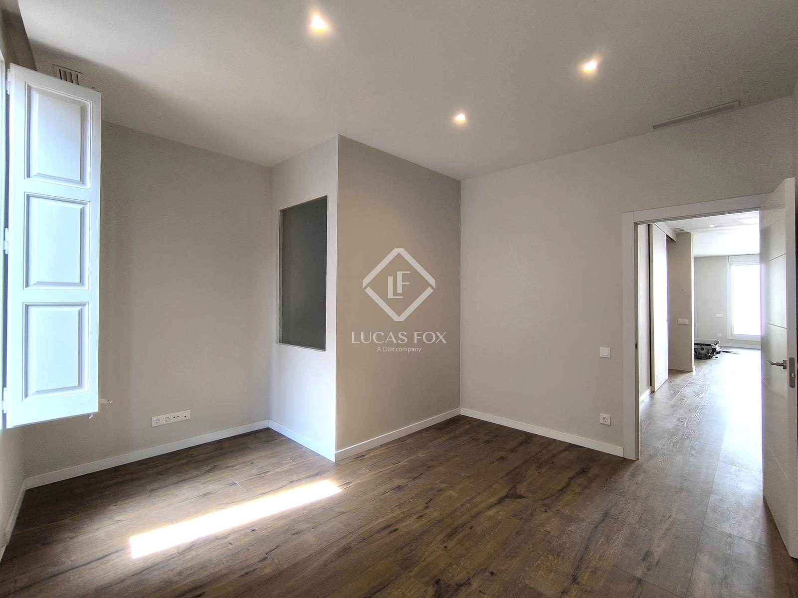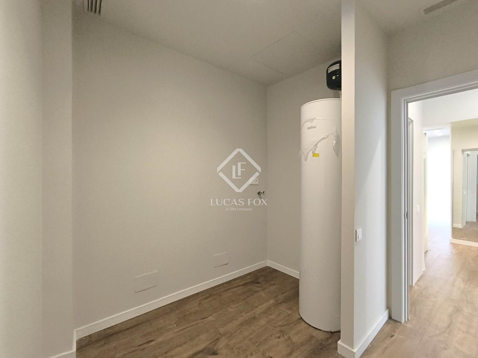 The apartment is accessed from the ground floor floor via a space of approximately 9 m2, comprising the lobby, staircase, and a storage room room with the possibility of installing a service elevator to the upper floor . On the upper floor , the staircase leads to a hall, to the right of which are two large double bedrooms with west-facing French windows, one of which has an additional window. Both have space for built-in wardrobes and a desk area. If a service elevator is installed, it would take up space in one of the double bedrooms, becoming a spacious single bedroom . Opposite the hall , next to the bedrooms, is a bathroom with a shower and micro-cement floor and walls, and a separate room ideal for additional closet space or a work area. To the left, the hall opens onto the open-concept day area . The L-shaped kitchen with elegant white cabinets includes Bosch appliances (induction hob, extractor hood, oven, and microwave), space for the refrigerator and a paneled dishwasher (not included). This layout allows for the installation of a central island or the placement of a dining room or office table. Next comes the spacious, square living room with large sliding French doors access to the 45m2 terrace, allowing natural light to enter and creating a seamless connection between the interior and exterior spaces. The large and private L-shaped terrace is ideal for a chill-out area with exterior furniture and plants. Opposite the kitchen, a hall leads to a guest toilet, a room with a glass window above the stairs, ideal for an study, and which includes a wardrobe with the aerothermics equipment and a laundry area for the washer and dryer. The master suite completes the floor with an open-concept bathroom and a large sink shelf, an area for built-in wardrobes , and a spacious and bright double bedroom opening onto the large south-facing terrace, with the possibility of adding more wardrobes.
