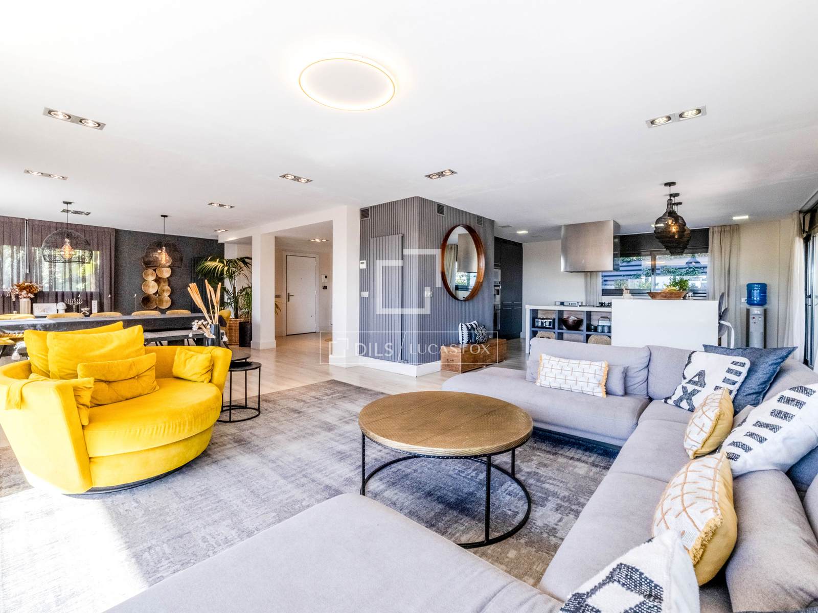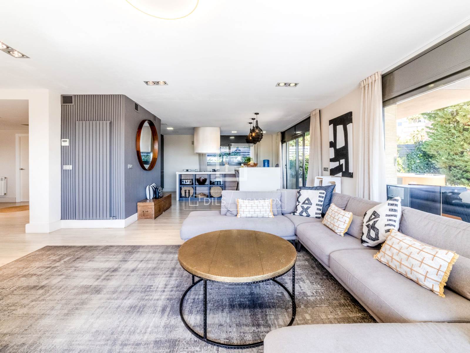 On the ground floor, there is an entrance hall that leads to a spacious and elegant 100 m² living room that merges with a modern kitchen with an island, creating an elegant and functional atmosphere. The abundant natural light and connection to the outside enhance the feeling of comfort and exclusivity.