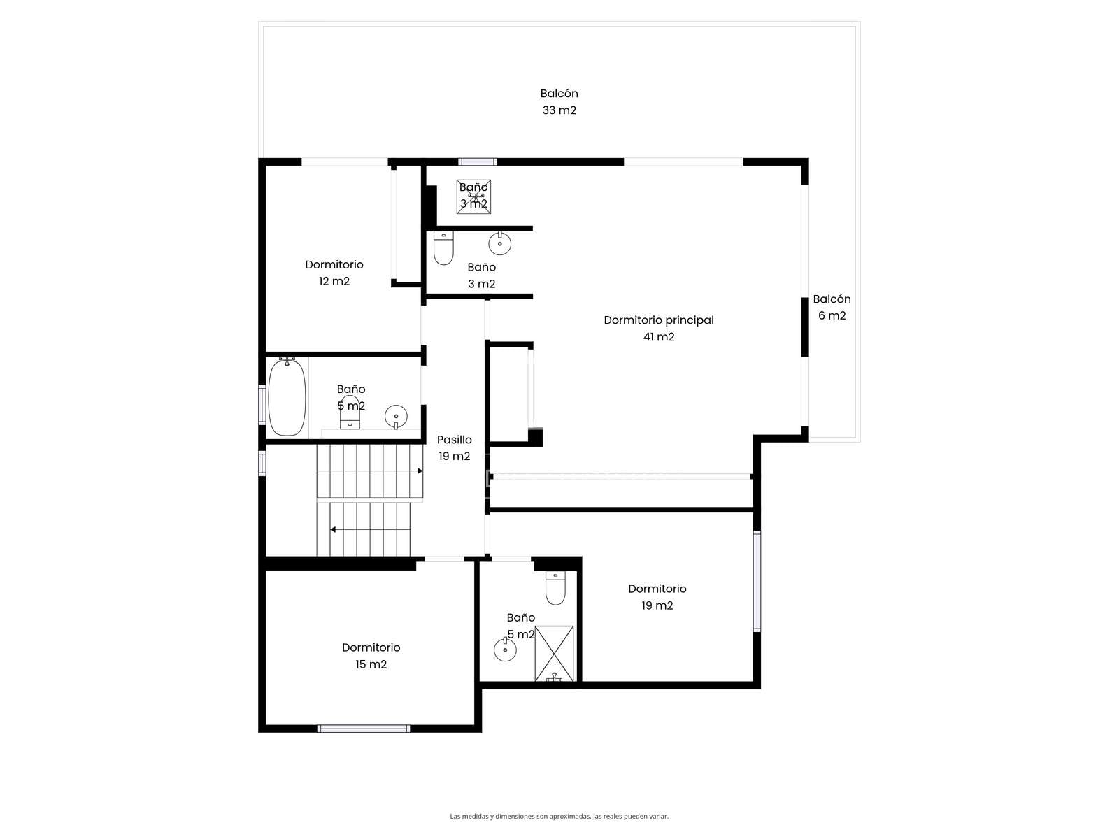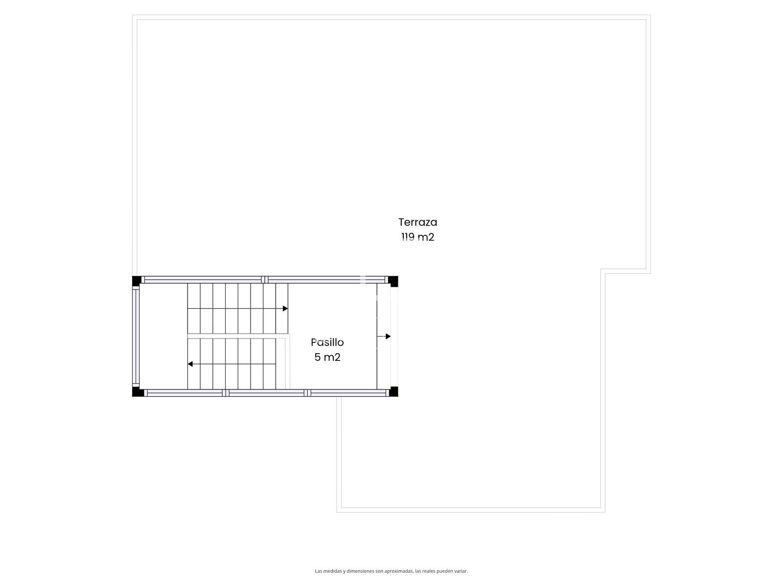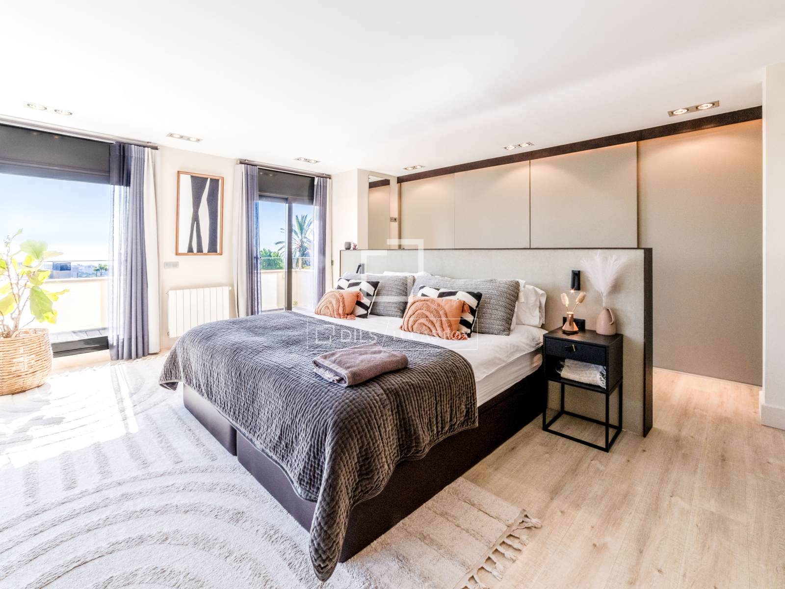 On the first floor is the sleeping area, with two spacious suites. One of them has modern gray built-in wardrobes, a full bathroom, and a 50 m² terrace with sea views. On this same floor, there are two more bedrooms, one double and one single, both with access to the terrace.