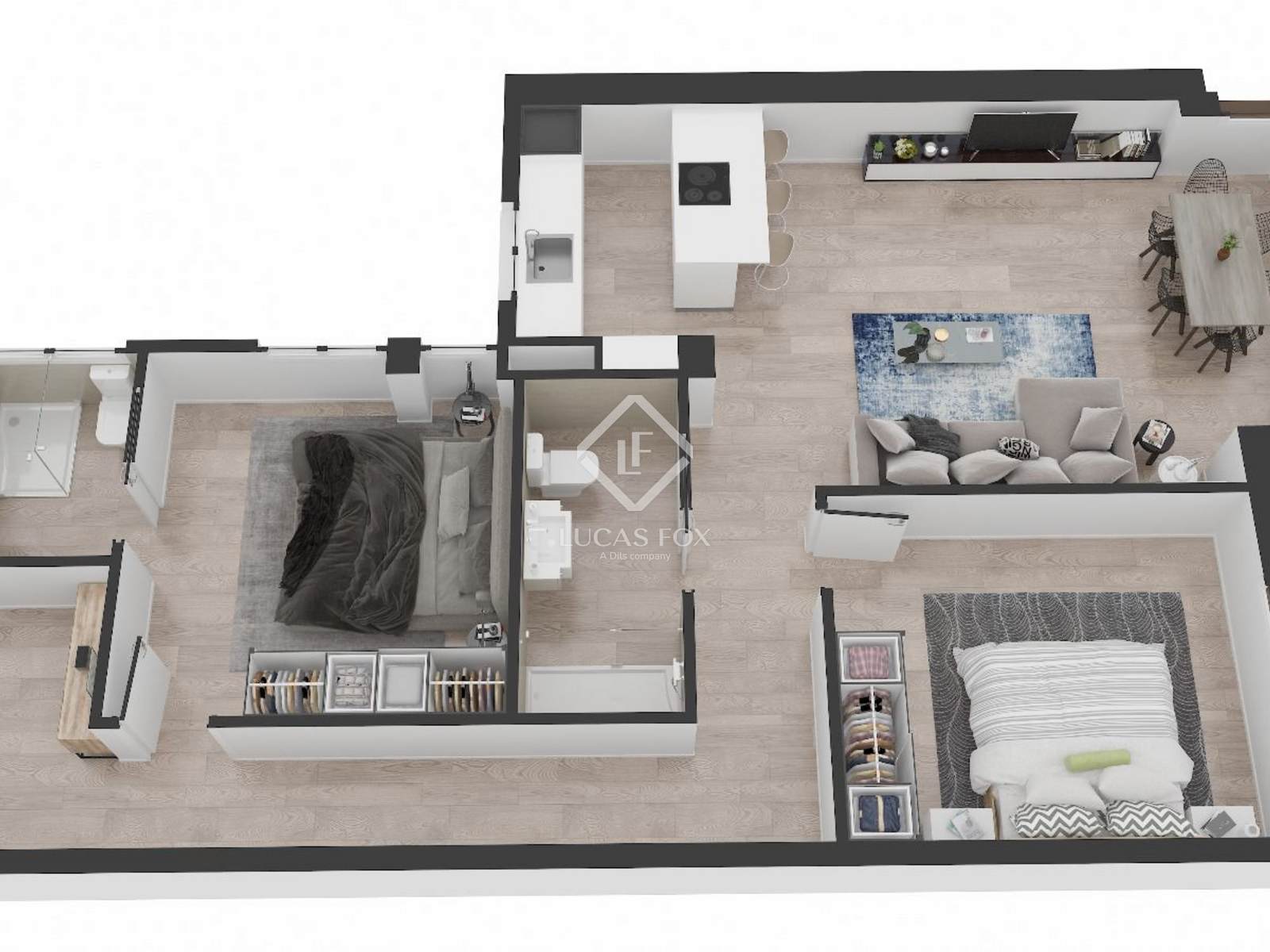 El gran espacio de salón comedor, diseñado con una cocina abierta, crea un ambiente moderno y acogedor que favorece la interacción y el disfrute diario. La cocina, completamente equipada, se integra visualmente al salón, aumentando la sensación de amplitud y confort.