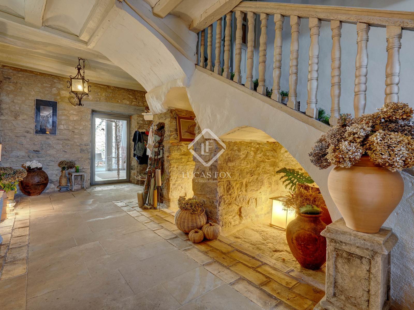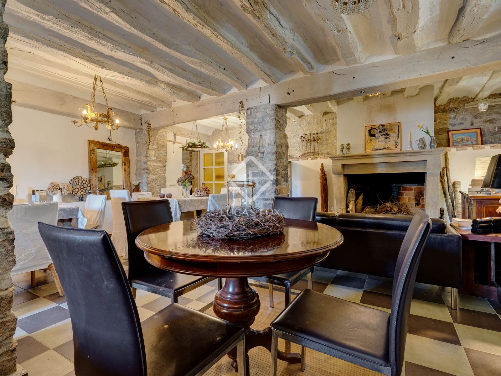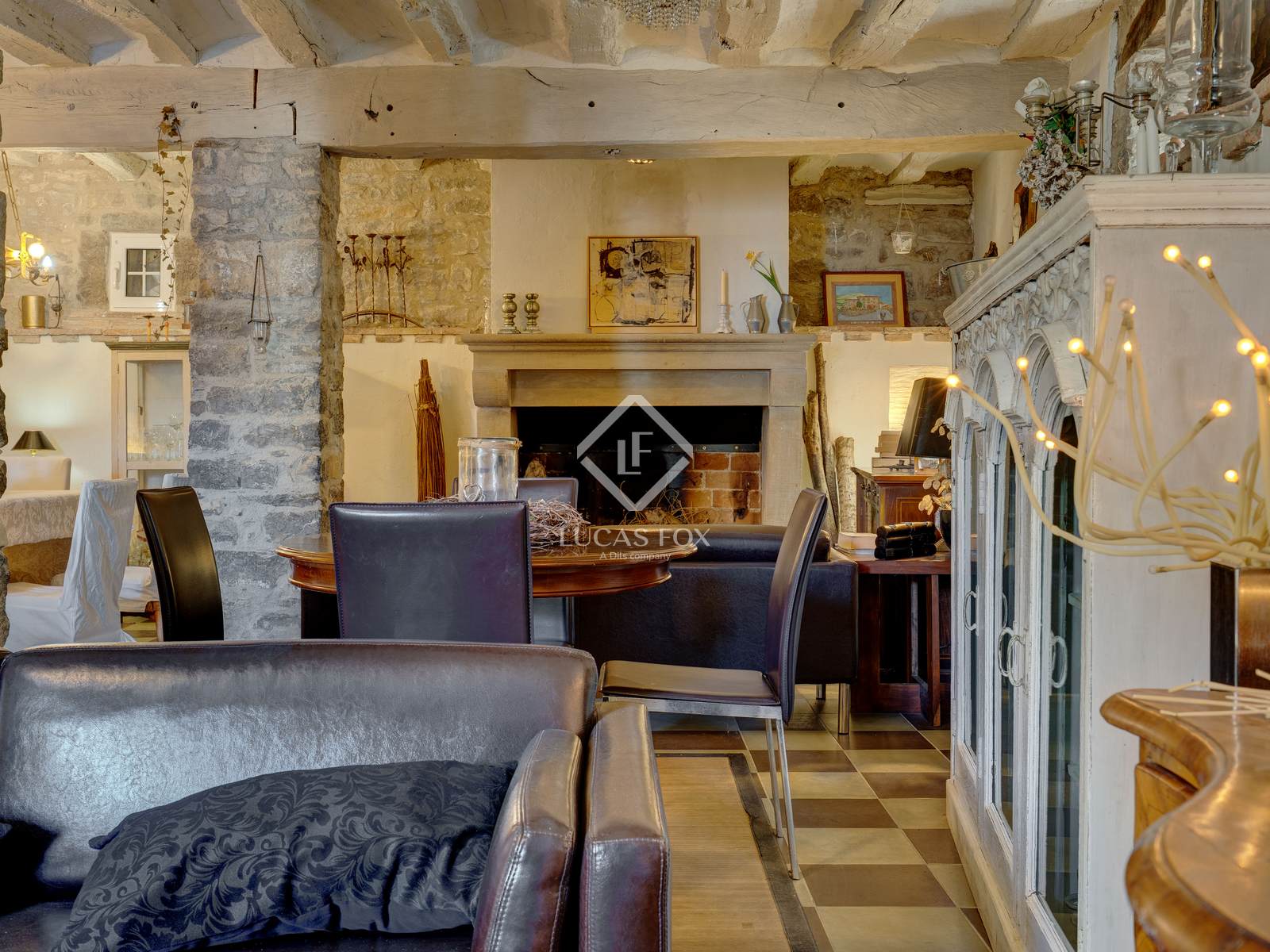 The property features high-end details such as the main living room with its fireplace , the wine cellar , and the professionally equipped kitchen. The interior decor combines white walls and ceilings with the warmth of stone and natural wood details.