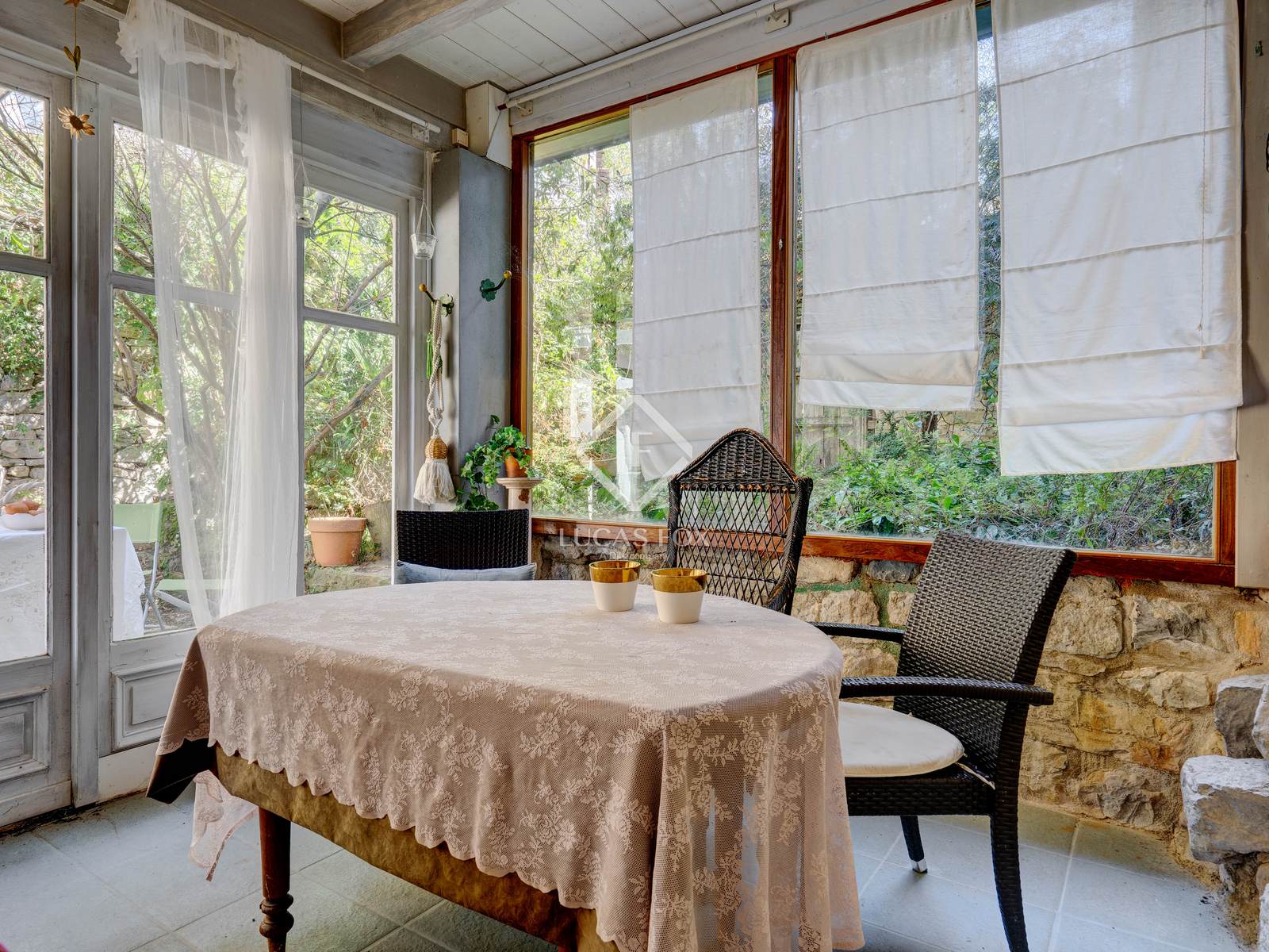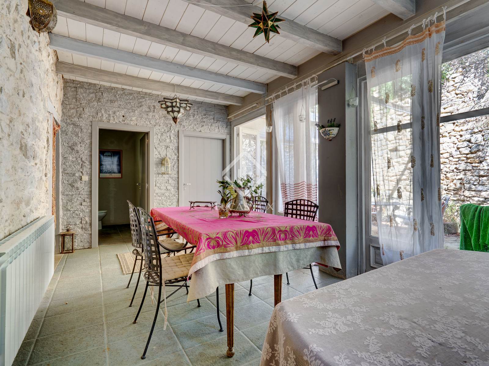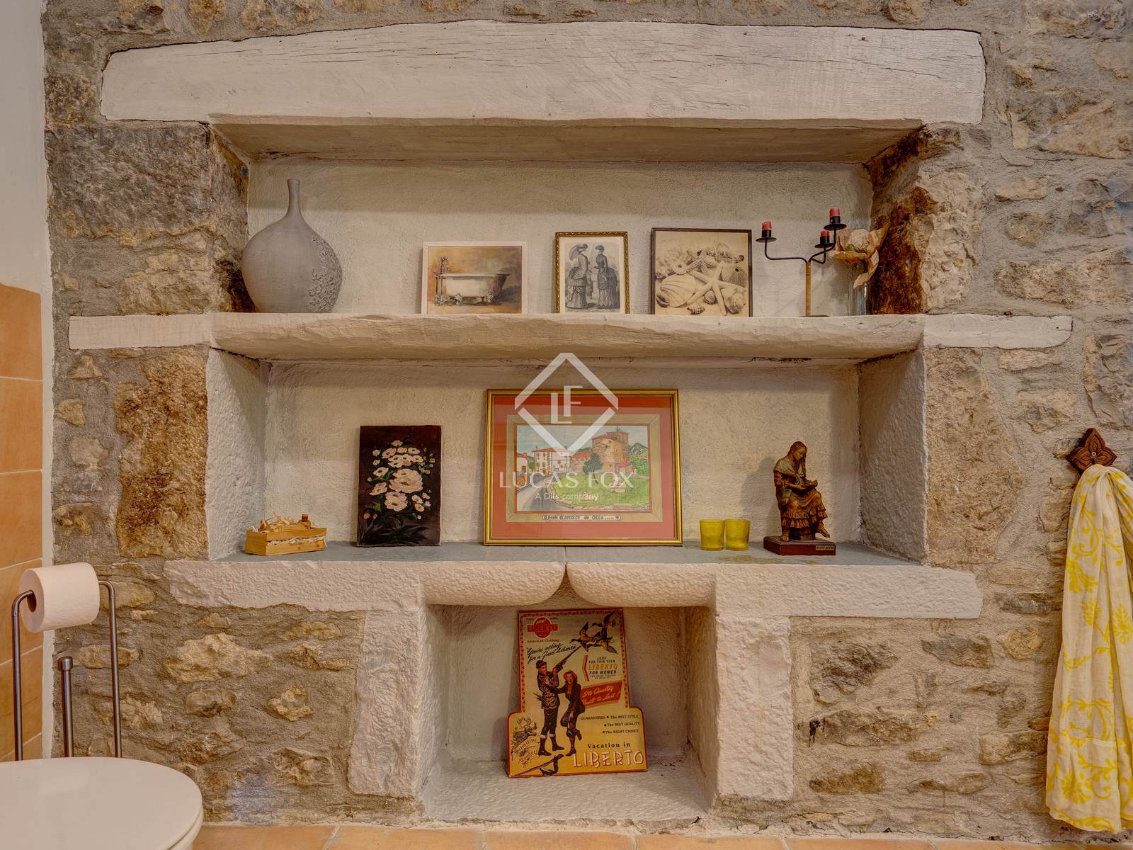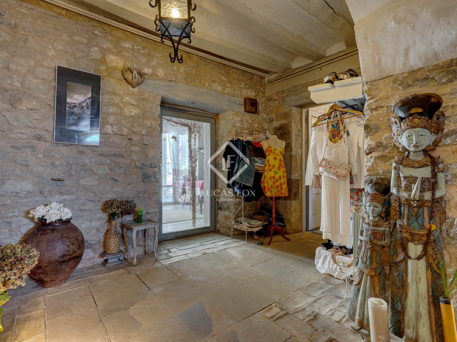 The property features high-end details such as the main living room with its fireplace , the wine cellar , and the professionally equipped kitchen. The interior decor combines white walls and ceilings with the warmth of stone and natural wood details.