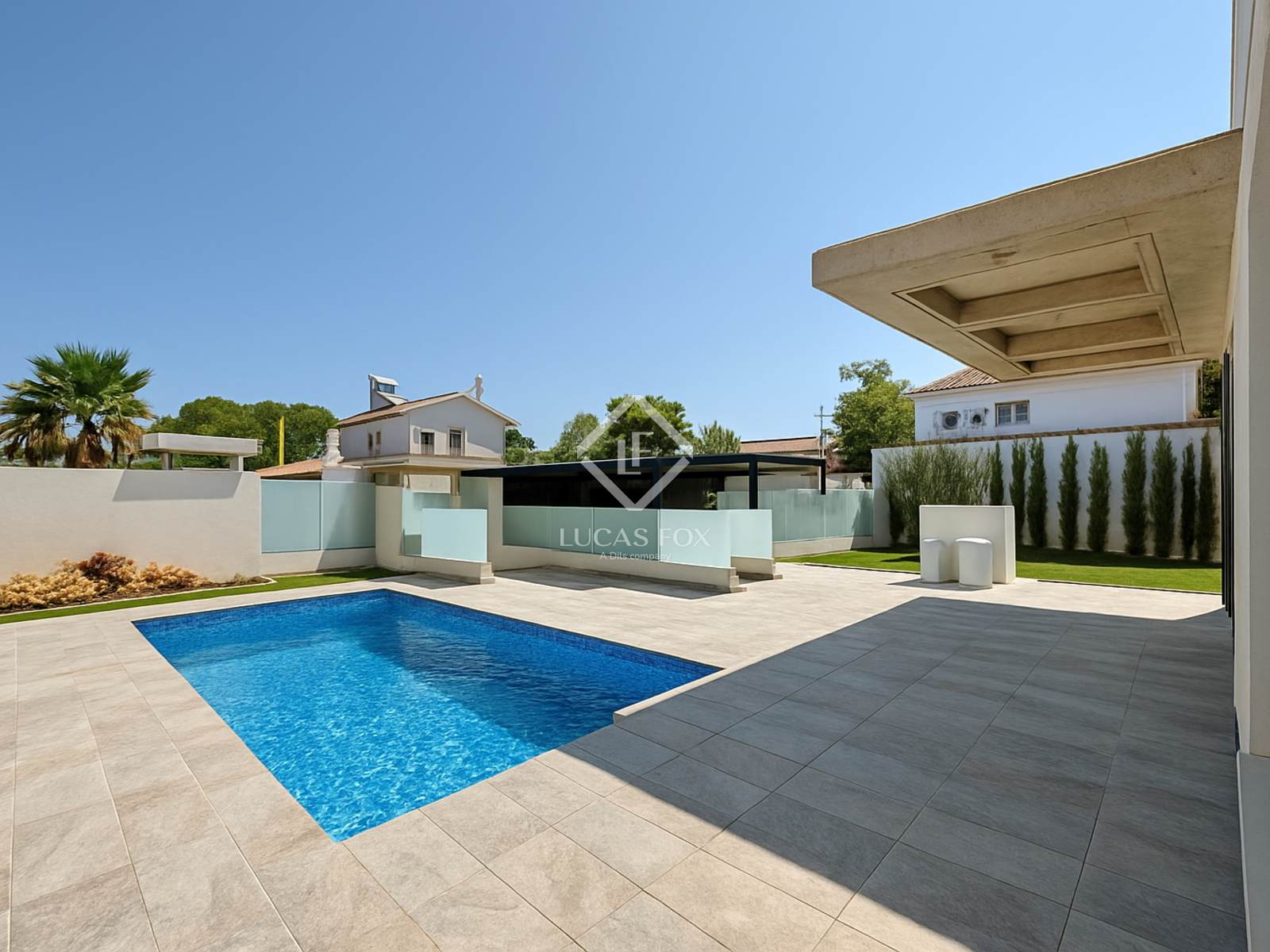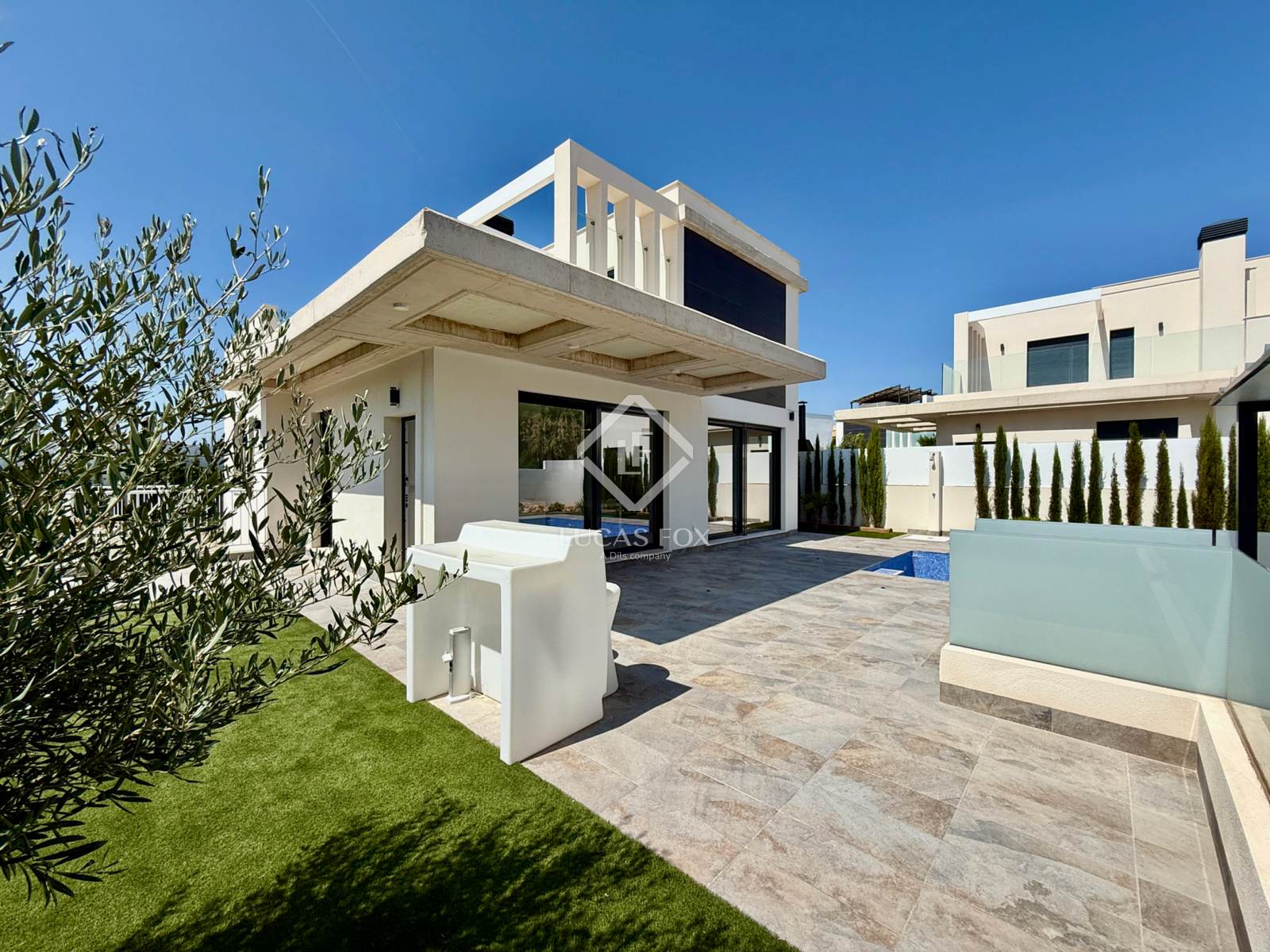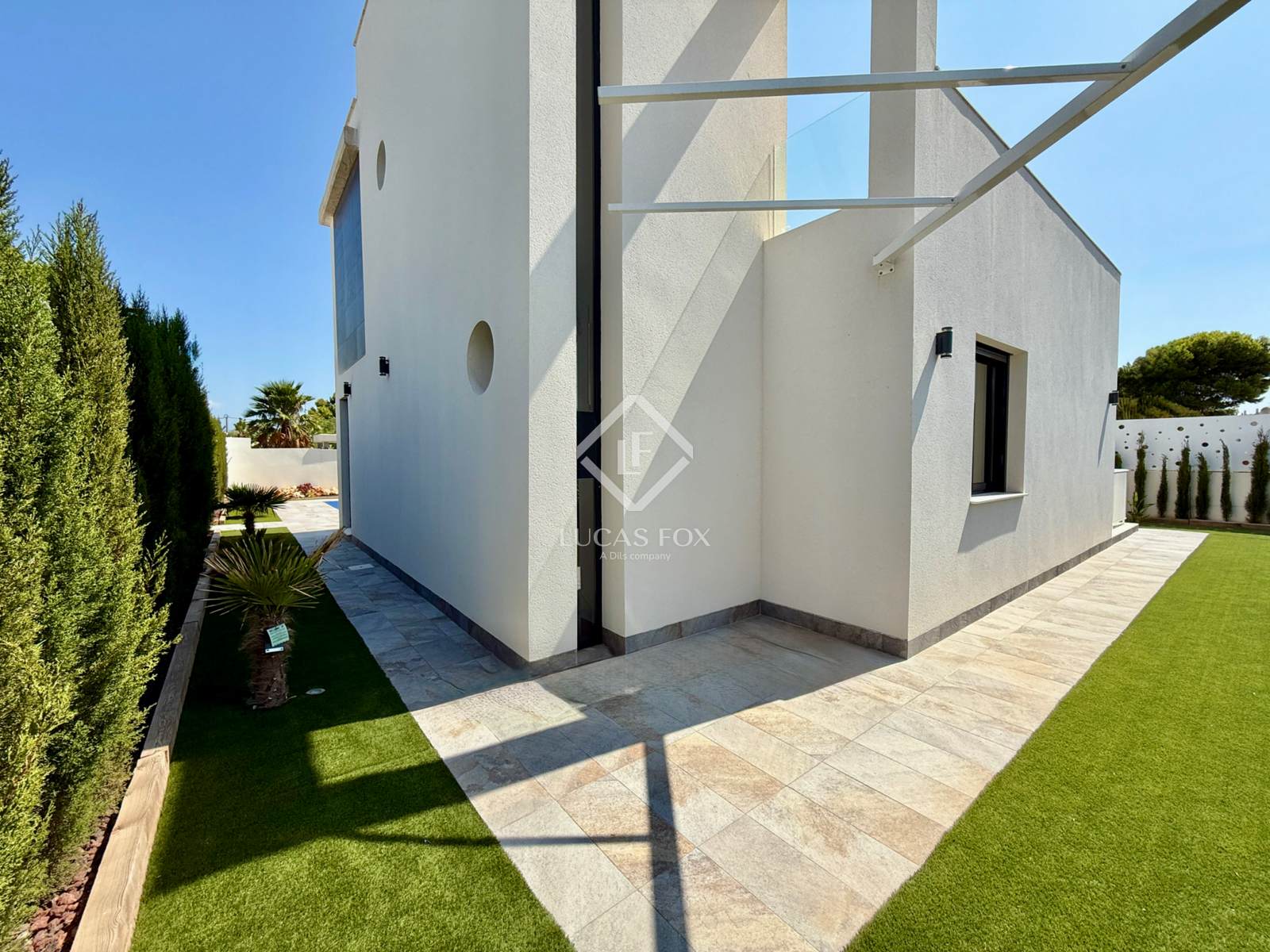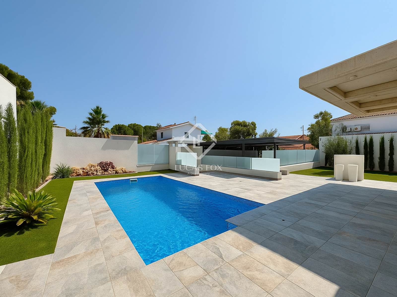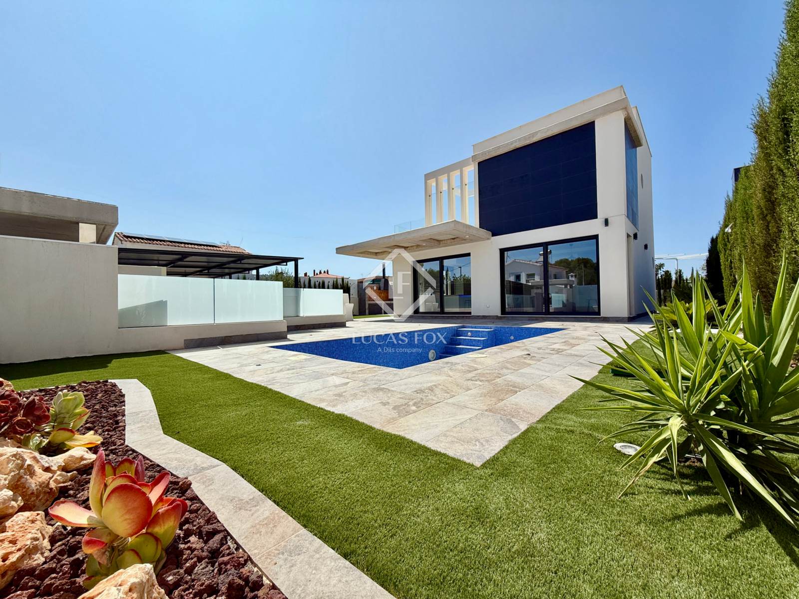 It sits on a spacious 485 m² plot featuring a garden and pool. Upon entering the property, the covered parking area is on the left, while the pool is on the right. Finally, in front of us is the magnificent villa, ready to move into.