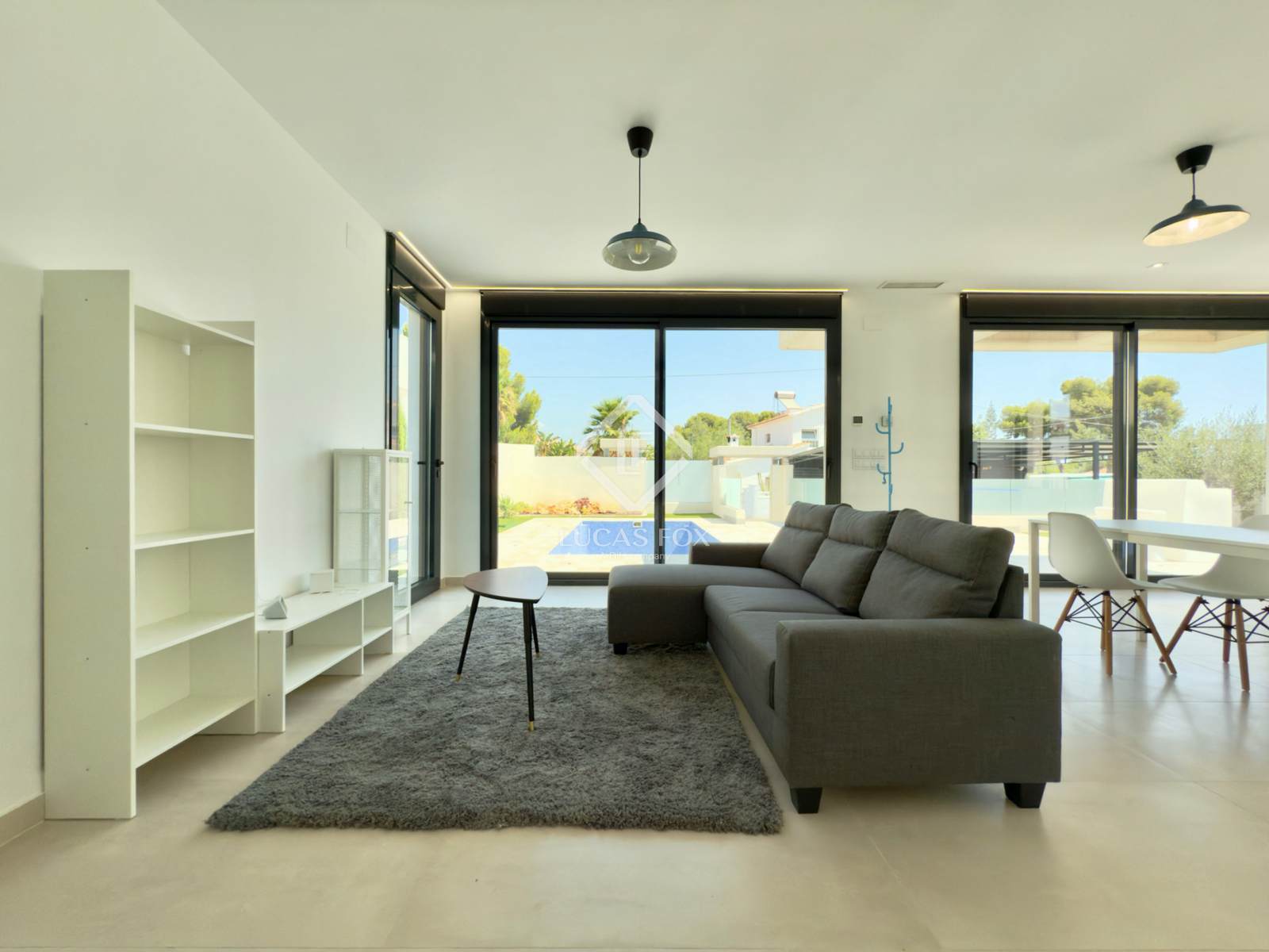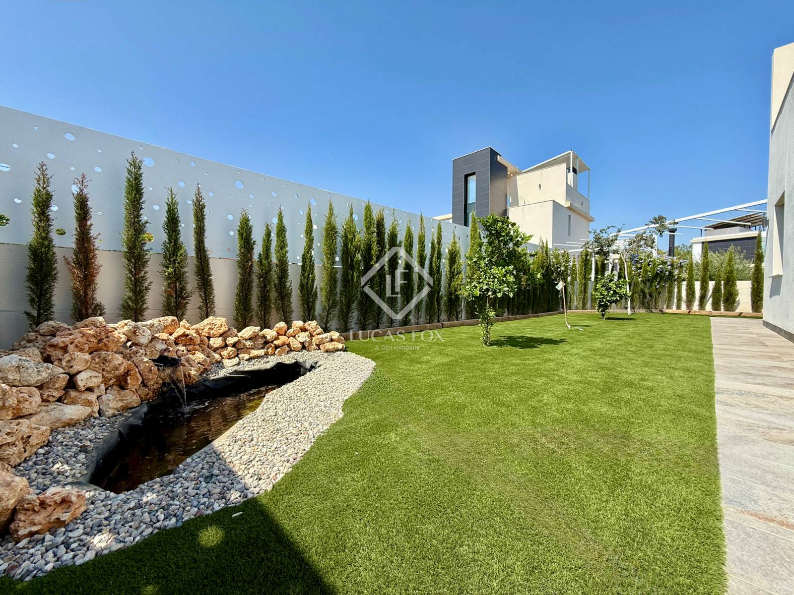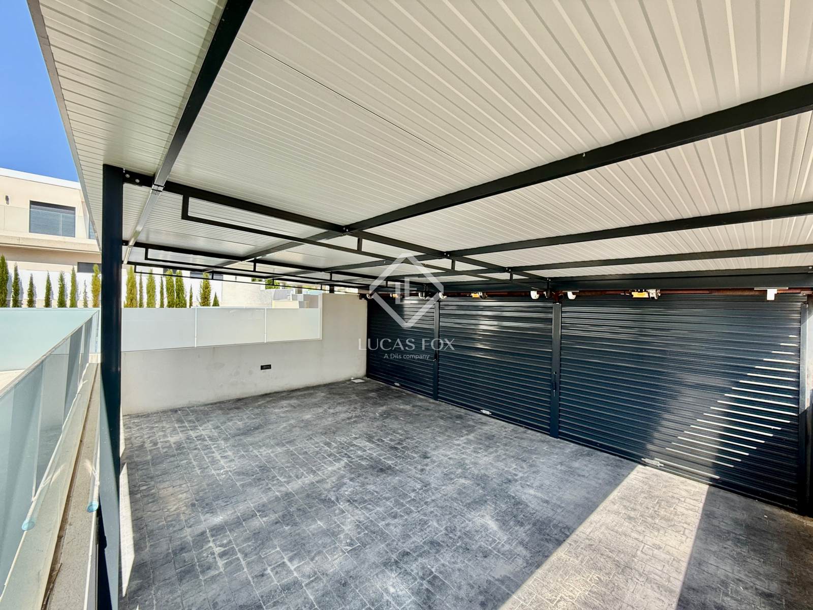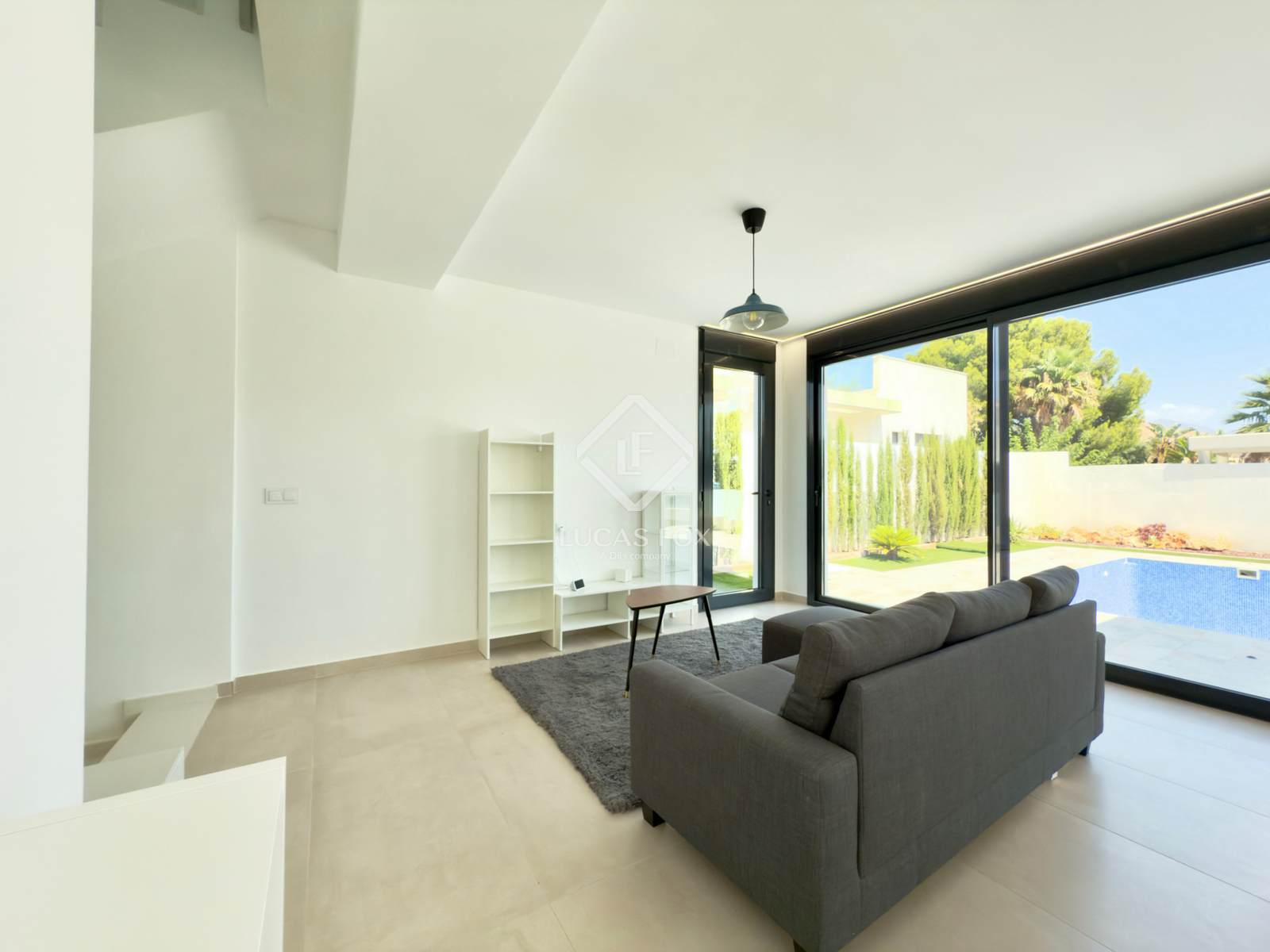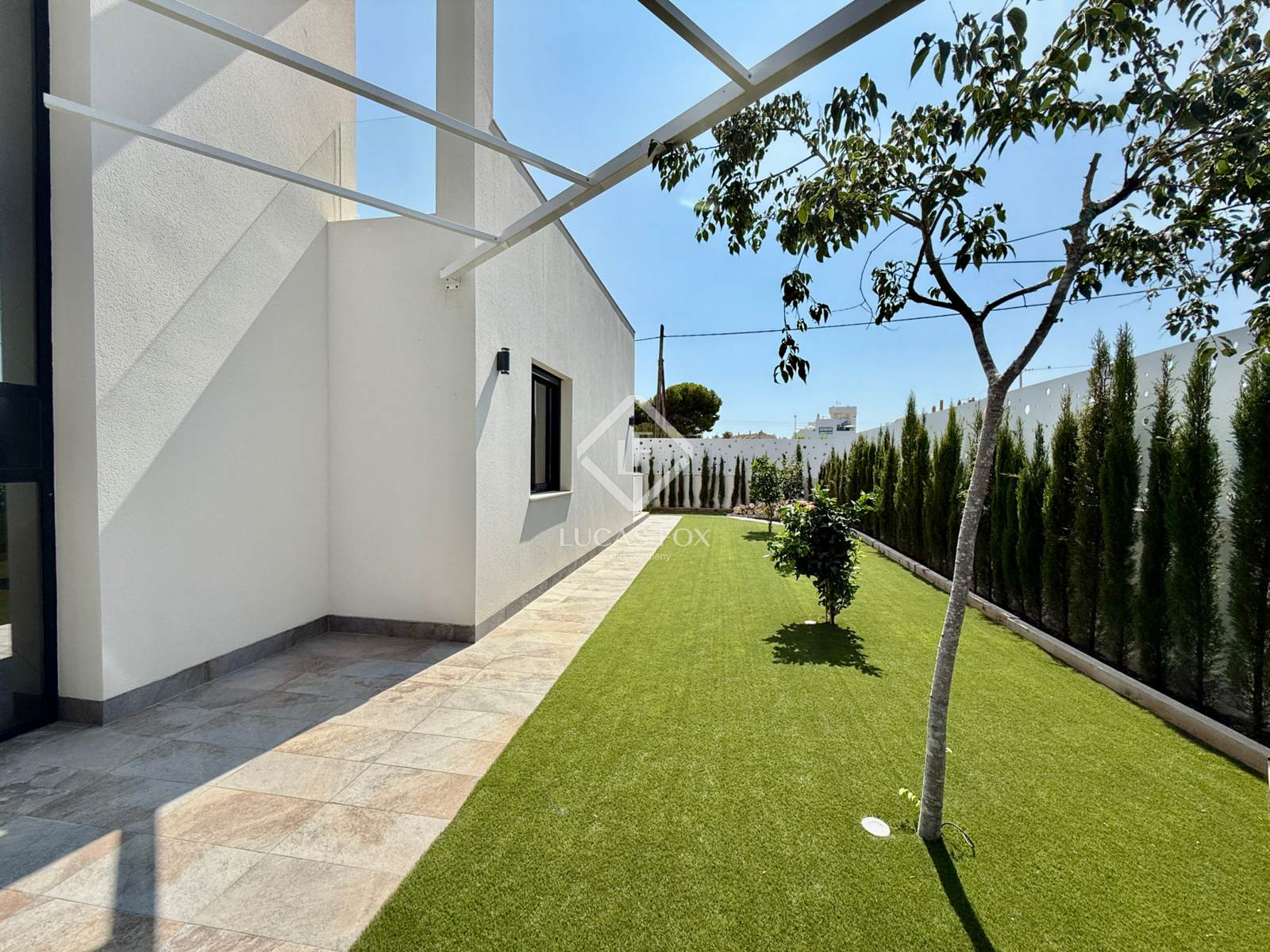 It sits on a spacious 485 m² plot featuring a garden and pool. Upon entering the property, the covered parking area is on the left, while the pool is on the right. Finally, in front of us is the magnificent villa, ready to move into.