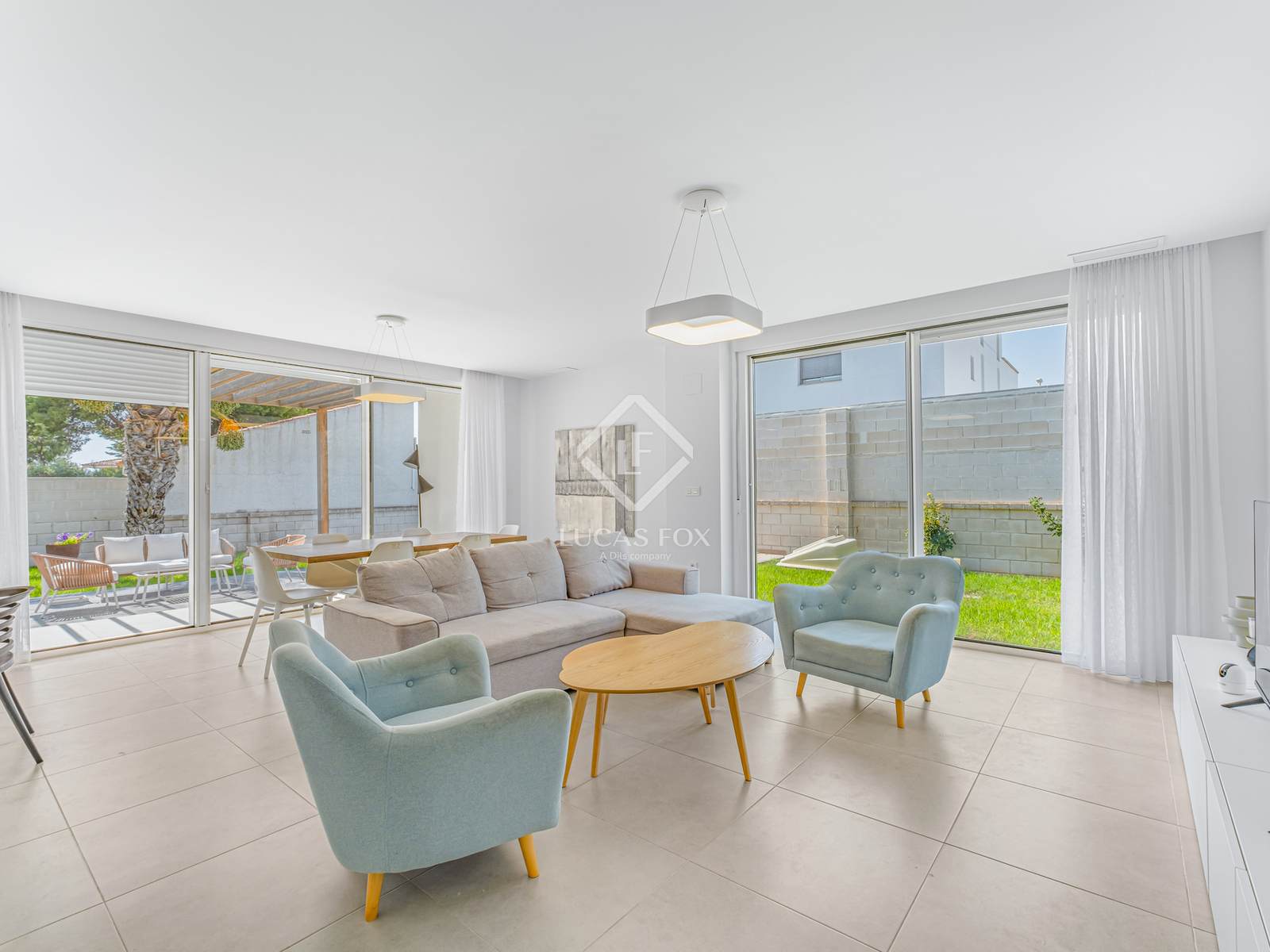 Elegant villa in La Font offering a bright open-plan kitchen, three spacious bedrooms, a main suite with en-suite and wardrobes on one main floor, plus a large lower ground floor with a cinema/playroom and extra bedroom.