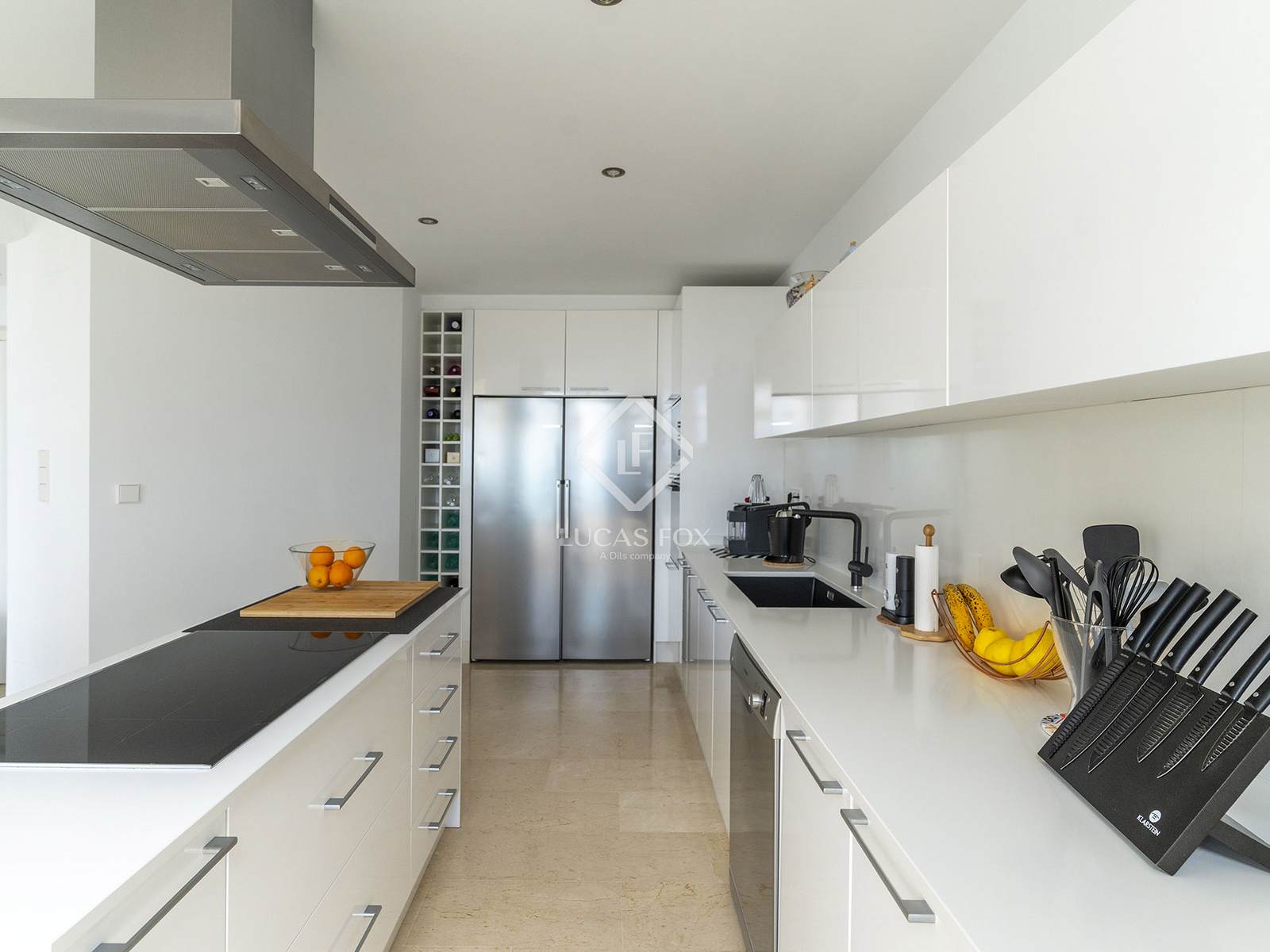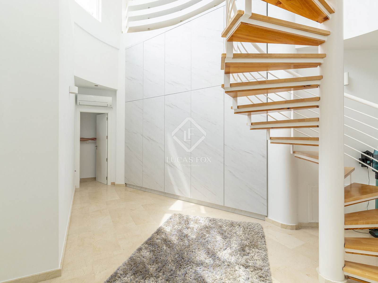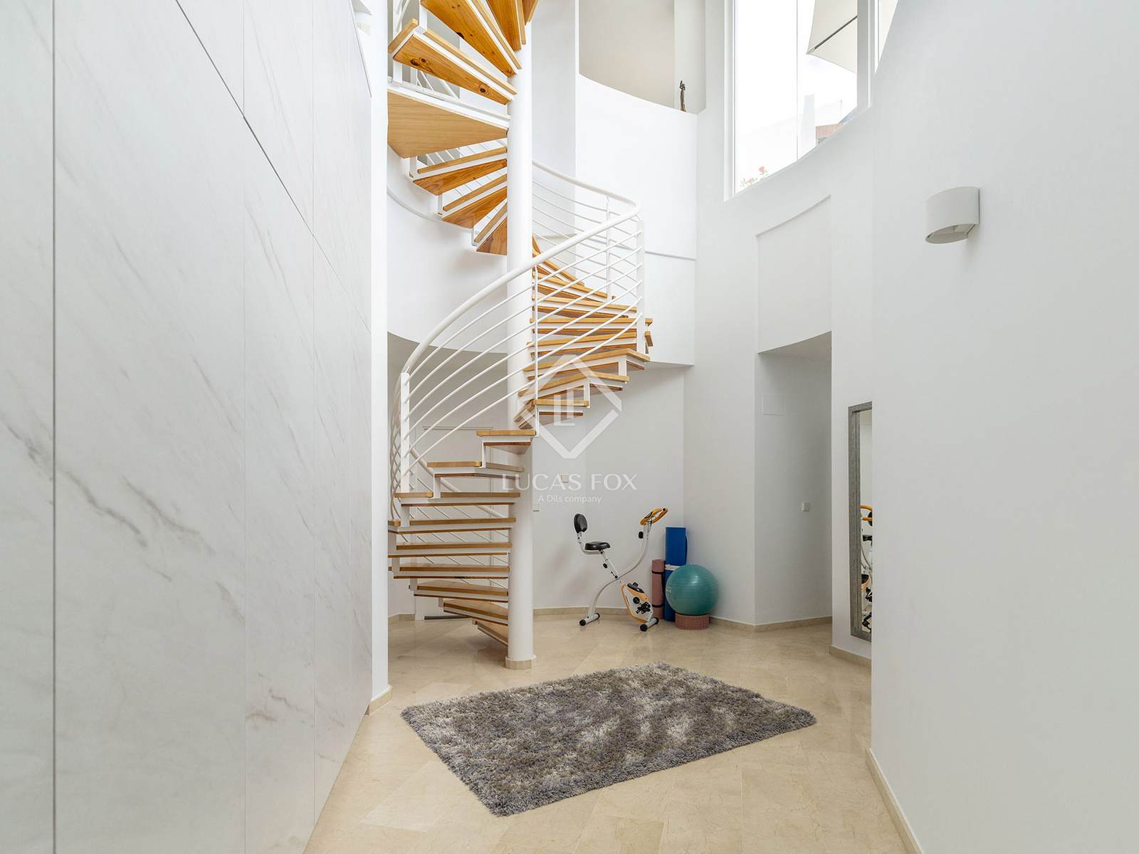 Spread across three levels, the home welcomes us on the upper floor with a spacious entrance hall, direct access to a private two-car garage, a guest suite with en-suite bathroom, and a terrace where you can enjoy the magnificent landscape.