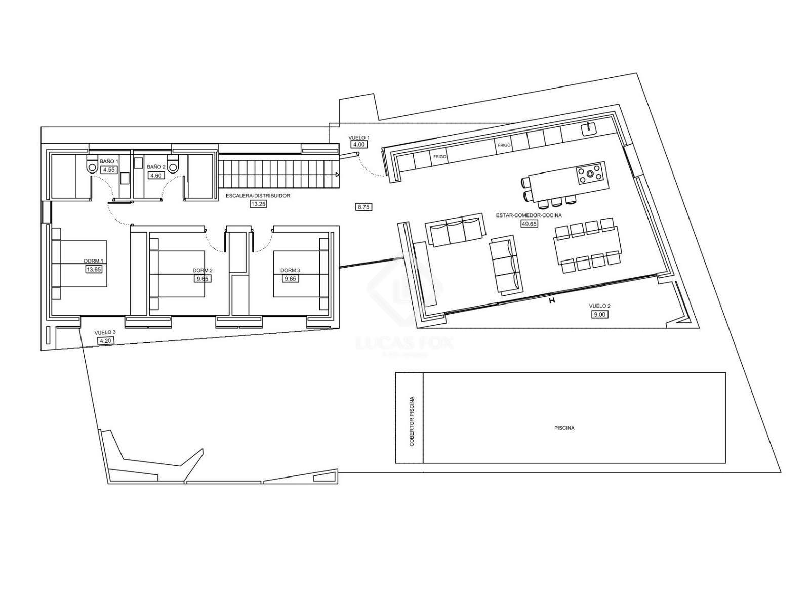 Floor is the main living area, which includes a spacious and bright open-plan dining room living room connected to a fully equipped modern kitchen. From here, there is direct access to a large exterior terrace with a private pool and bedroom area, ideal for enjoying the sun and al fresco dining. This floor also features three bedrooms and two bathrooms. One of the bedrooms has an en-suite bathroom , while the other two share a full bathroom . All three bedrooms have direct access to the pool terrace.