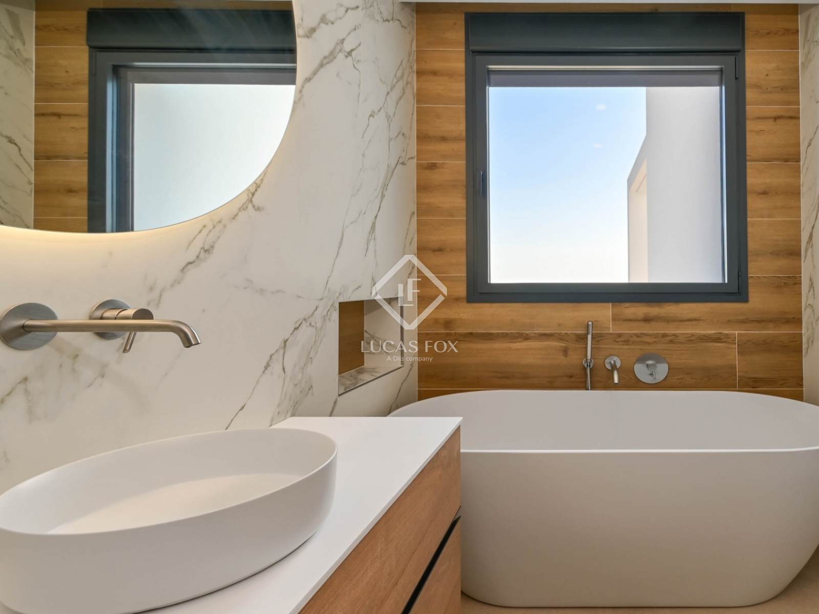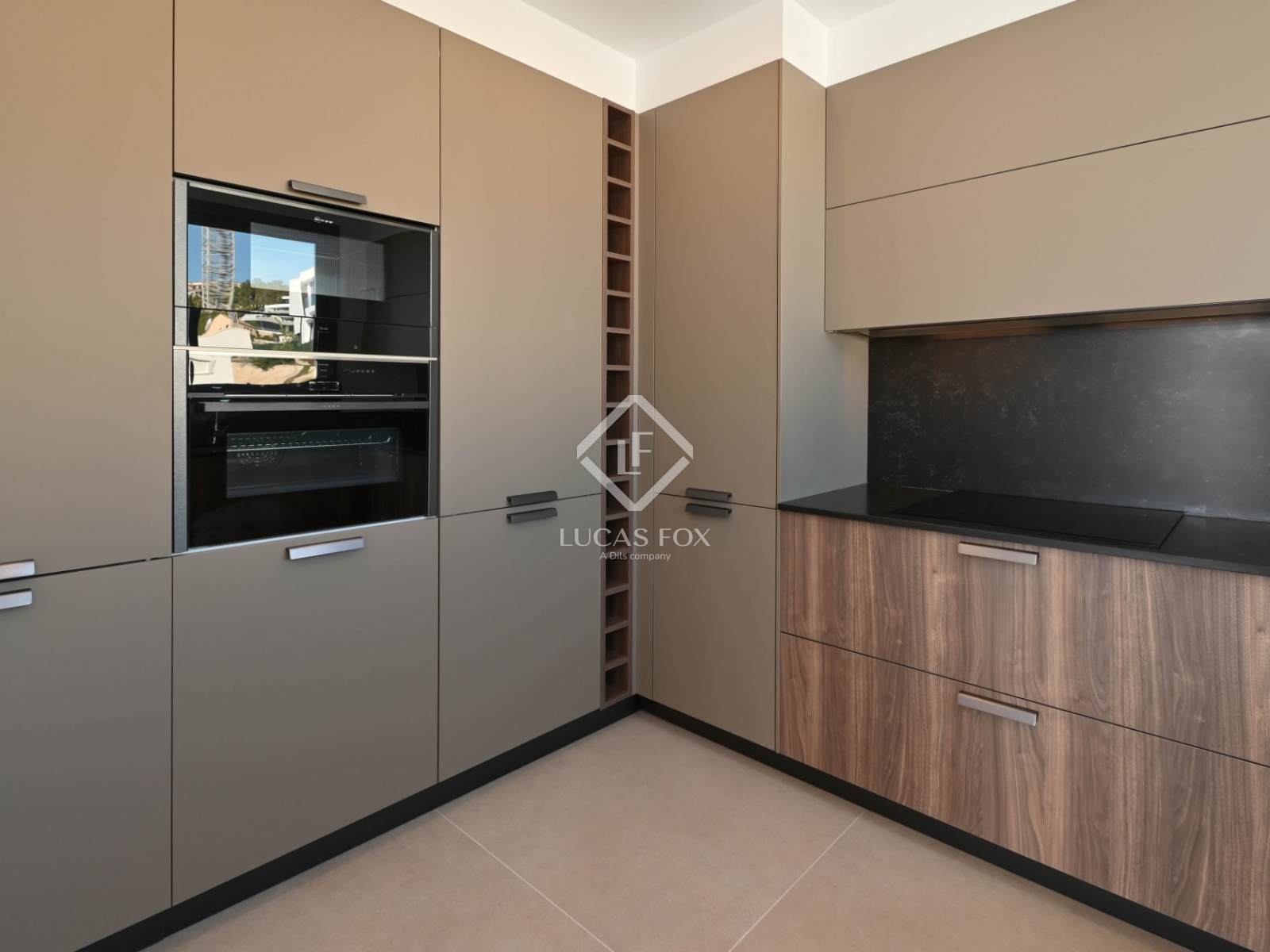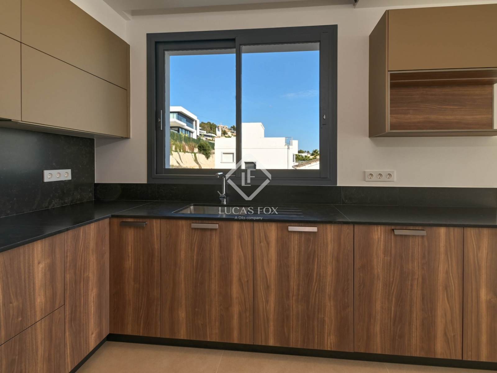 The lower level incorporates a cinema room, wine cellar, leisure spaces and direct access to the barbecue area and the pool terrace that seems to merge with the blue of the sky.