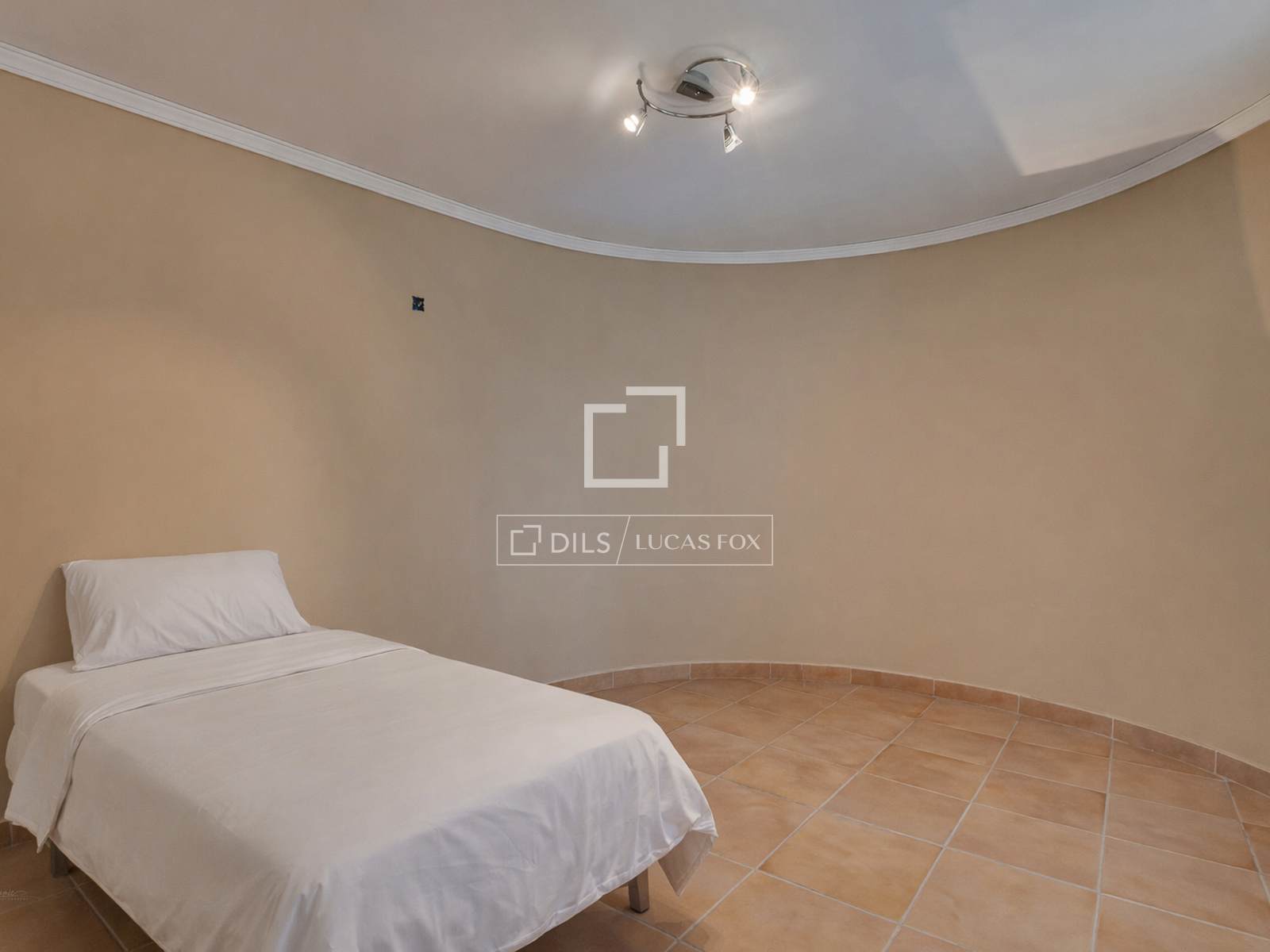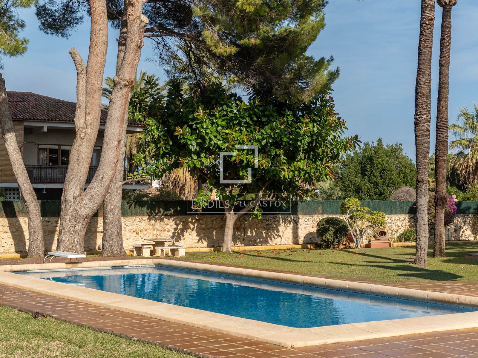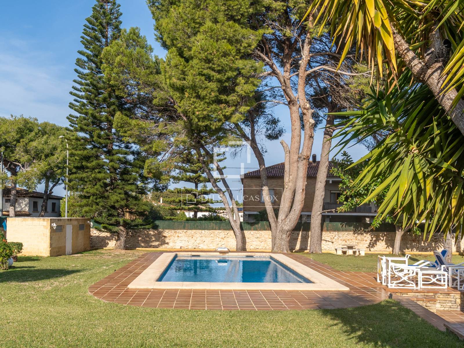 Beautifully maintained villa set on a flat 2,400 m² plot in a quiet cul-de-sac, just minutes from the beach and town centre. Featuring 6 bedrooms, guest accommodation, mature gardens, a large swimming pool, and open views towards Dénia Castle.