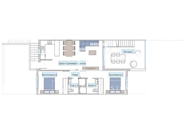 This beautiful 2-storey house of 97 m² with a terrace, garden and pool facing the Mediterranean Sea is located in the elegant Finestrat area on a plot of 362 m². The spacious, bright house has two bedrooms and two bathrooms.