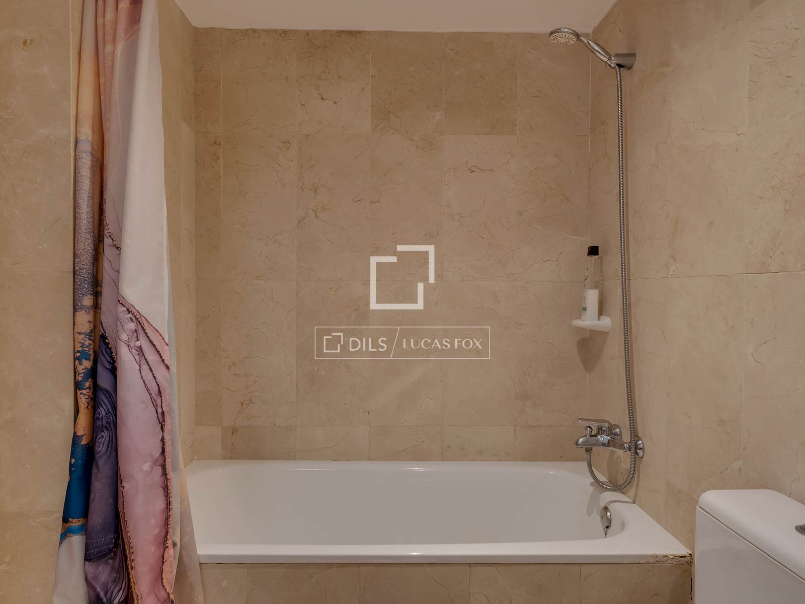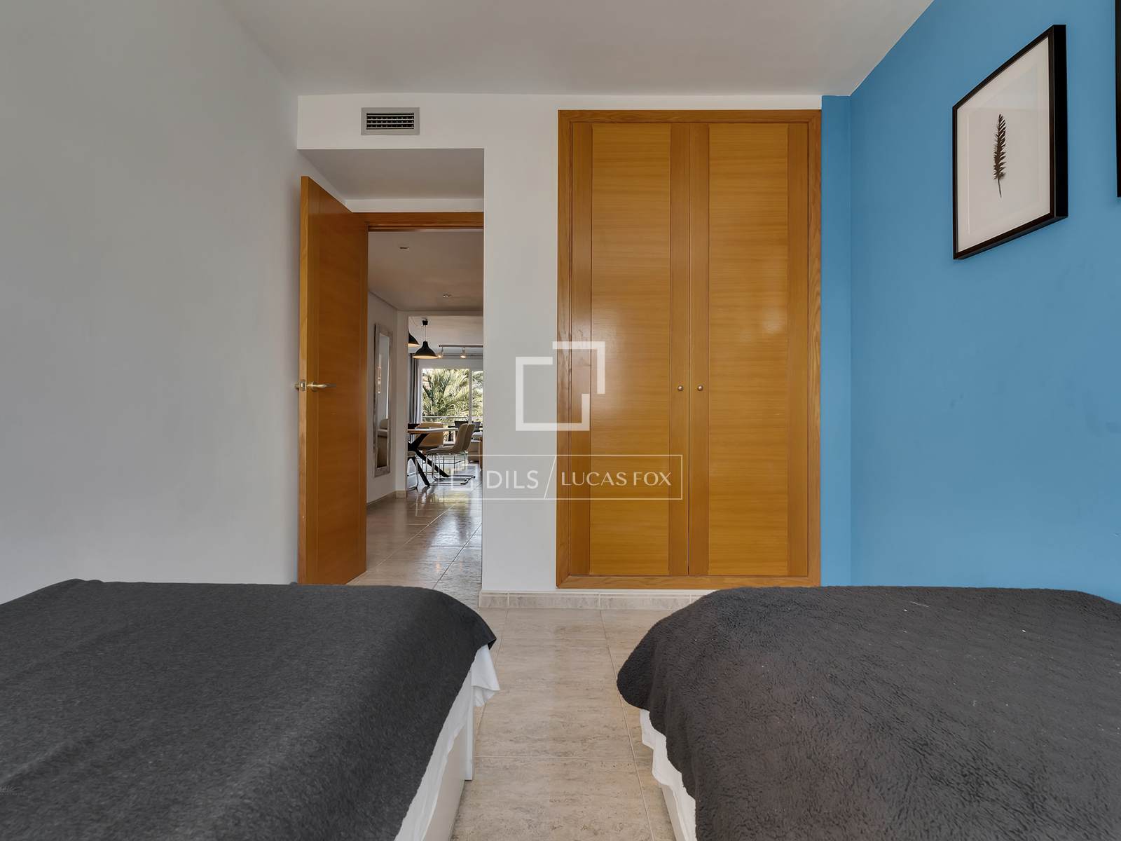 Upon entering, the entrance leads opens up into the spacious and bright open-plan living and dining area, with fully-equipped kitchen with breakfast bar. This inviting space opens directly onto a wide, east-facing terrace with pleasant views over the communal pool, and even a glimpse of the sea on the horizon. The perfect place for enjoying morning sun and outdoor dining. The apartment comprises two generous double bedrooms, both with built-in wardrobes, and a large family bathroom with bathtub. There would also be the possibility to create a second bathroom if desired.