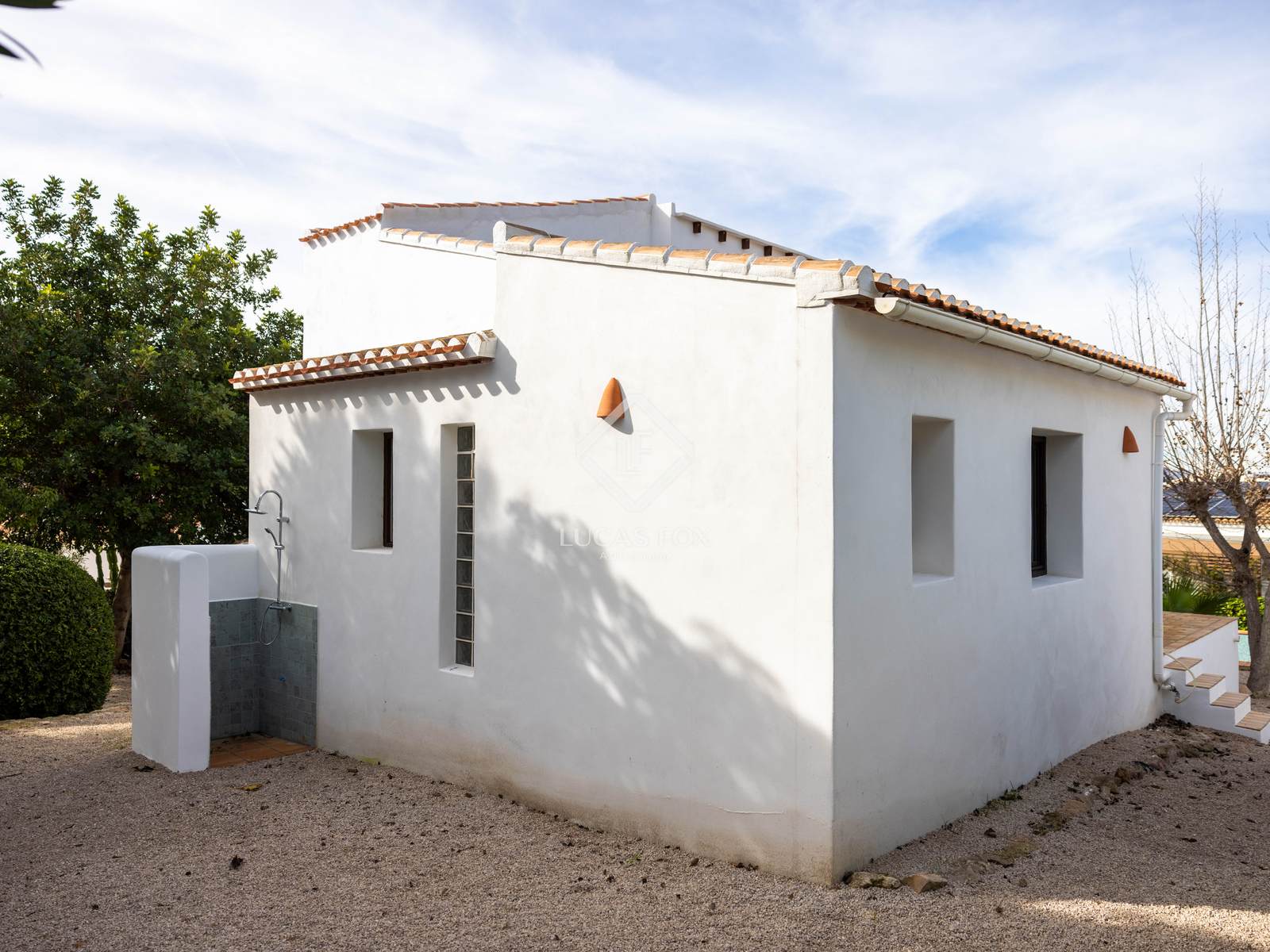 At the rear of the house, there is an outdoor shower, and just around the corner, a closed toilet room with a sink. Adjacent to this is a separate space that can be used as an office, studio, or bedroom.