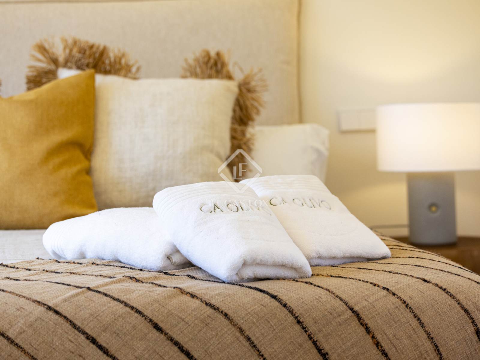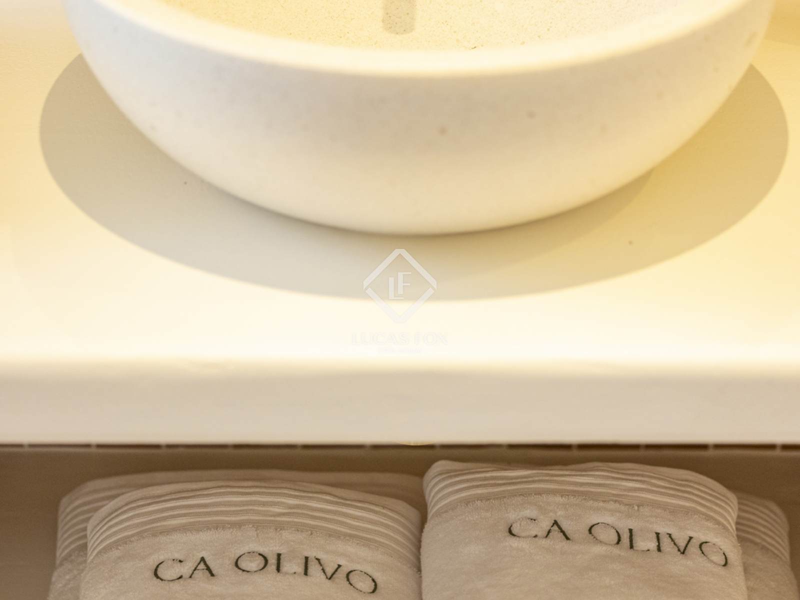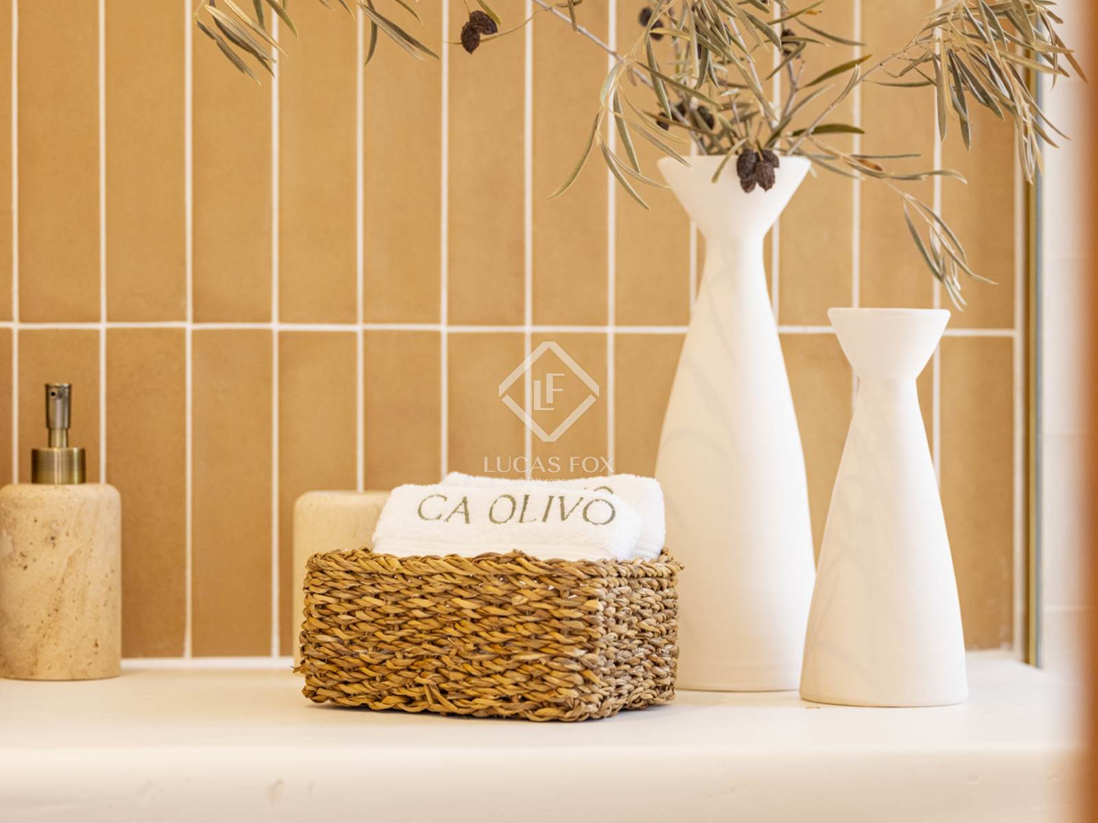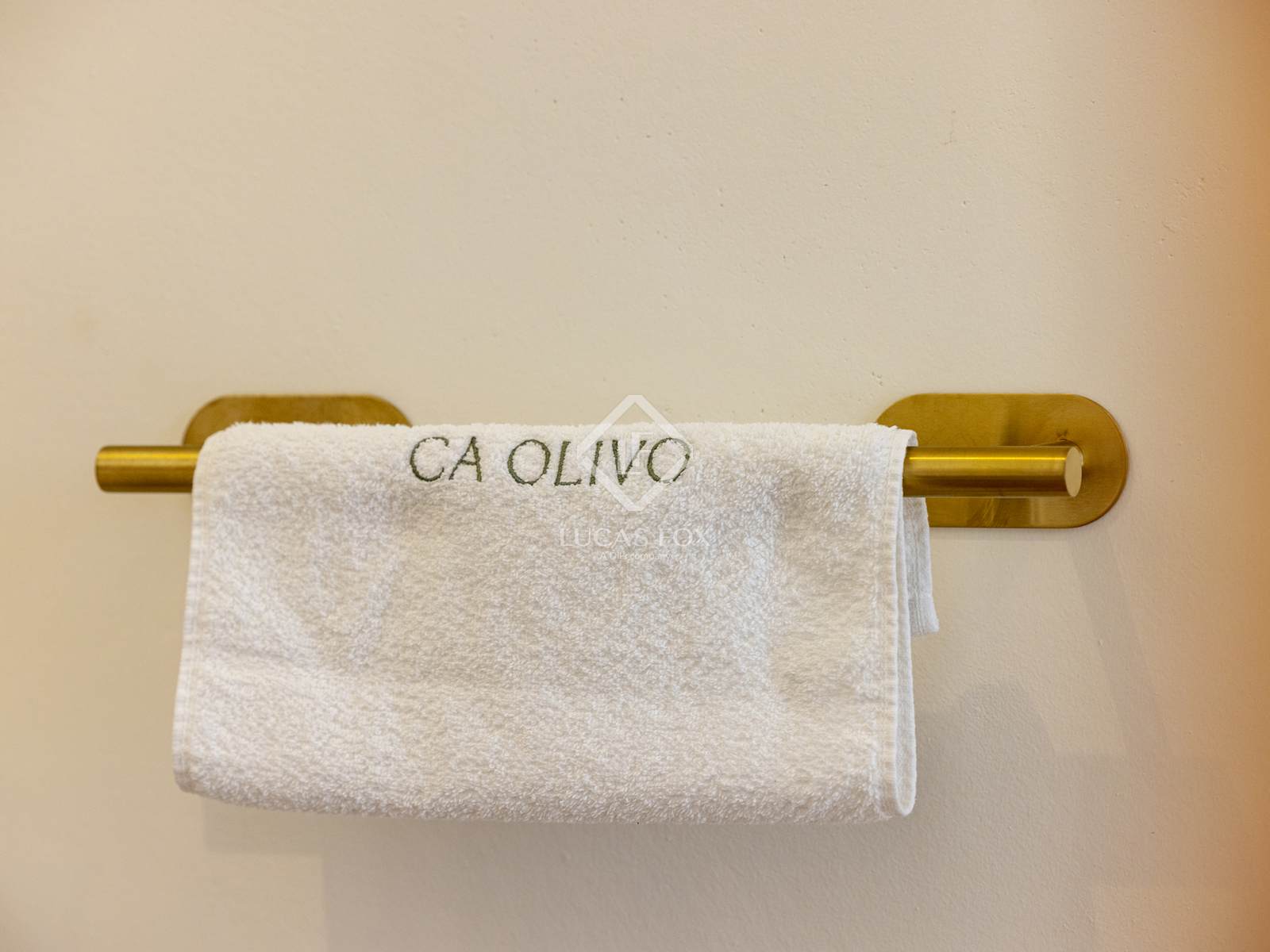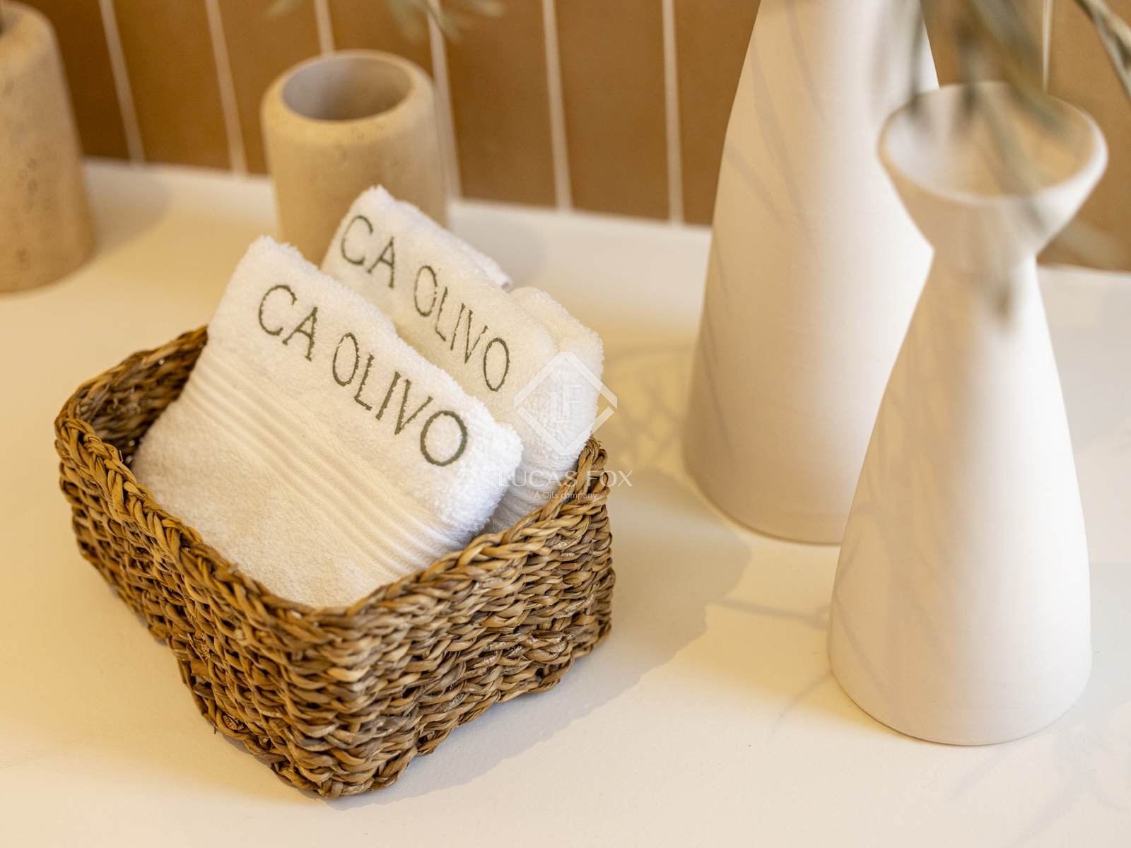 The construction of Ca Los Olivos, has a southwest orientation. Inspired by Mediterranean and Ibiza styles, it is characterized by its rounded corners, exposed beams, and vaulted ceilings adorned with beams, echoing the curves of the Mediterranean landscape. Its clay tile roof and large windows equipped with shutters ensure optimal natural light, making this home a haven of tranquillity.