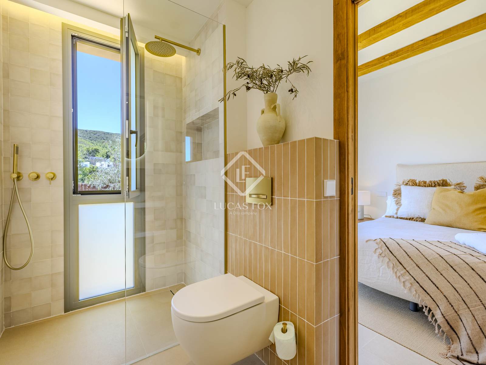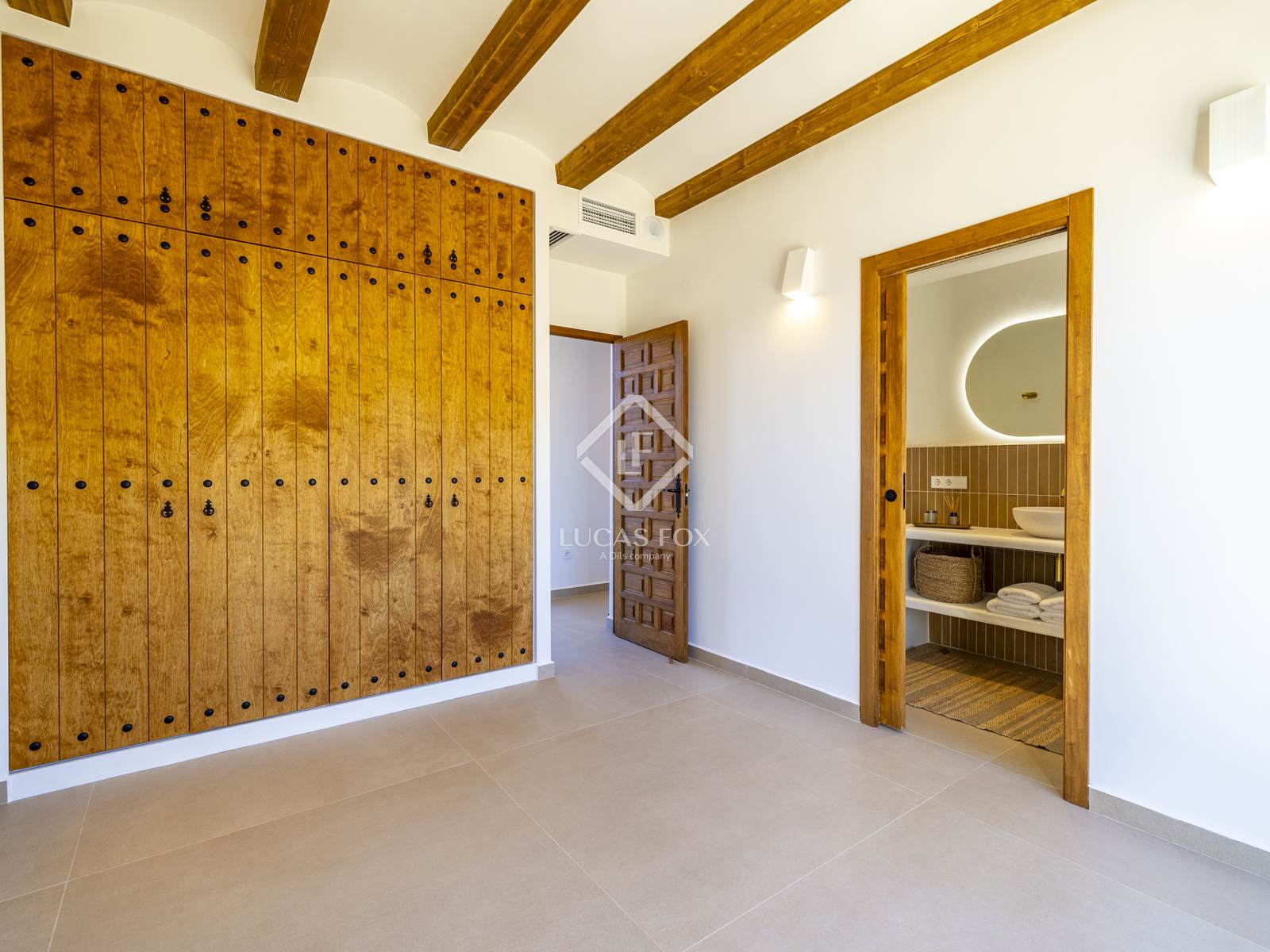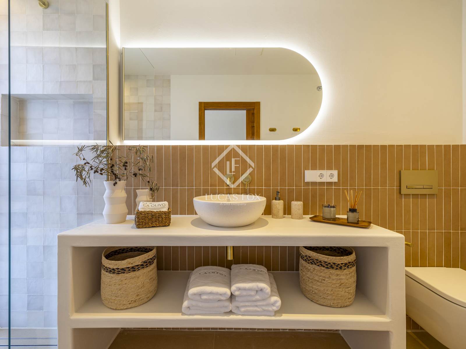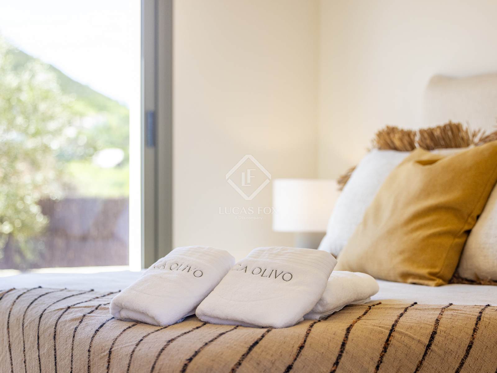 The construction of Ca Los Olivos, has a southwest orientation. Inspired by Mediterranean and Ibiza styles, it is characterized by its rounded corners, exposed beams, and vaulted ceilings adorned with beams, echoing the curves of the Mediterranean landscape. Its clay tile roof and large windows equipped with shutters ensure optimal natural light, making this home a haven of tranquillity.
