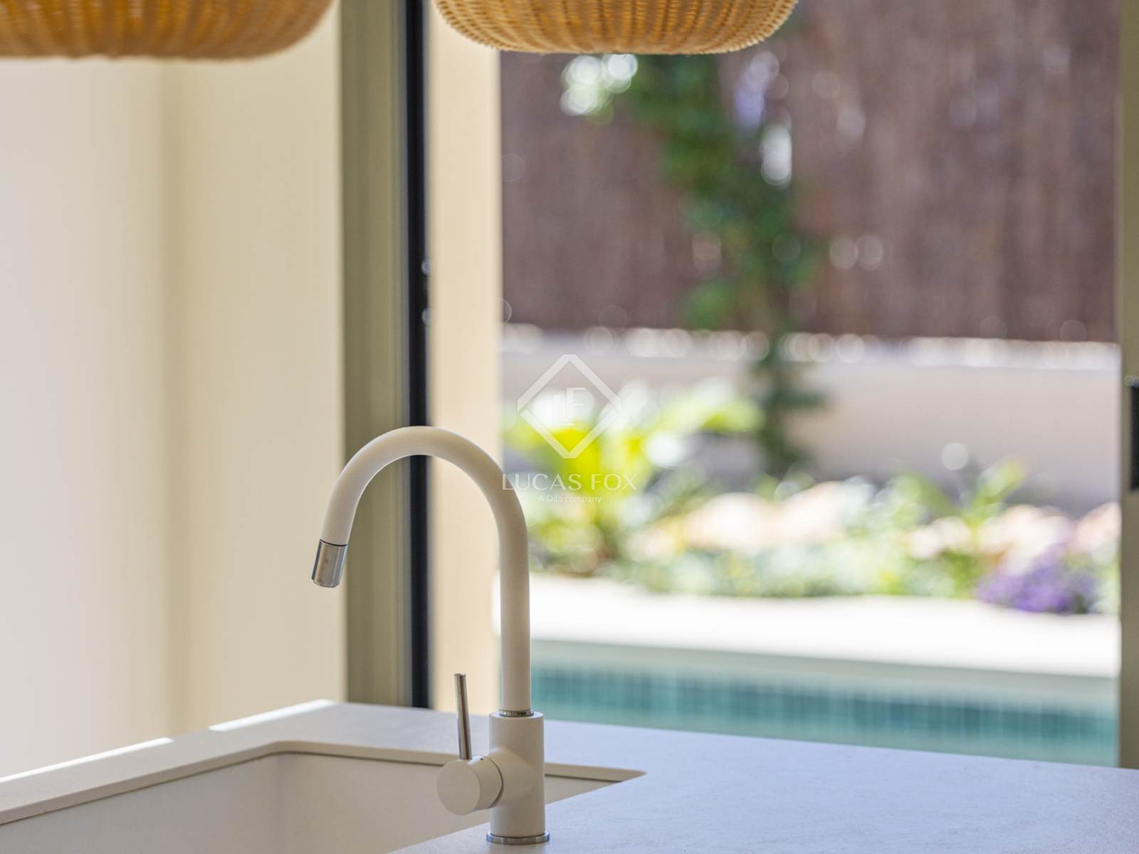 The exterior of the villa is a space designed for relaxation, with its well-kept Mediterranean garden, turquoise water pool, and vast sun-drenched terraces, ideal for family meals under the mild climate of Jávea.