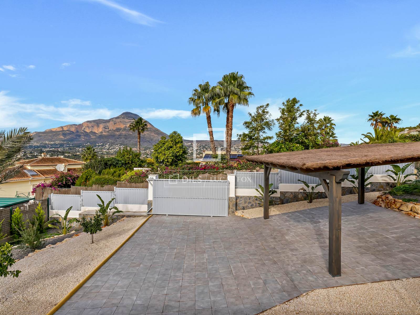 From the entrance hall, the space opens seamlessly into a bright open-plan living and dining area, bathed in sunlight thanks to the large windows that frame the stunning mountain backdrop. Next to the living area is the modern, open-plan, fully equipped kitchen with adjoining laundry room offering practicality, with direct outdoor access, perfect for unloading shopping straight into the home. The flow between indoor and outdoor living is effortless. Sliding doors open onto a partially covered terrace that becomes an extension of the living room, overlooking the private swimming pool and pool deck. This home is designed for long summer days and balmy evenings, where you can dine al fresco, entertain friends, or simply unwind while gazing at the ever-changing colours of the sunset over the majestic Montgo Mountain.