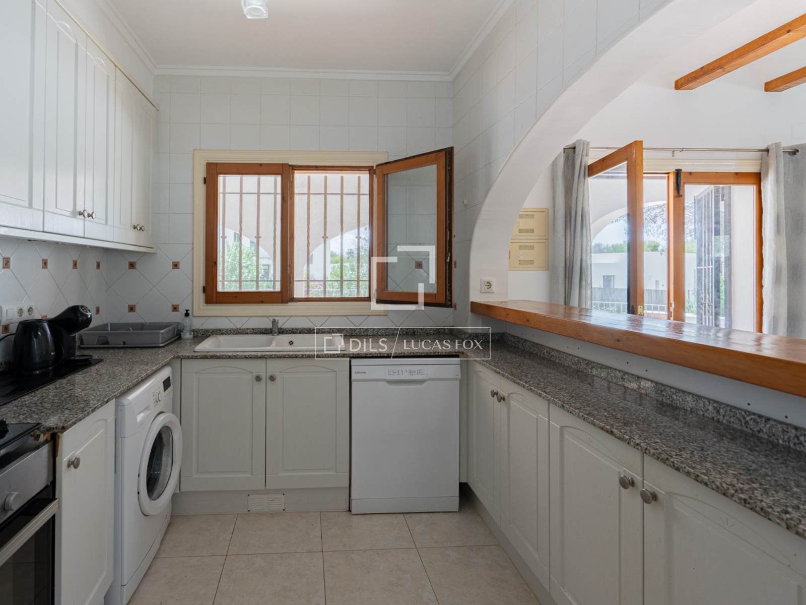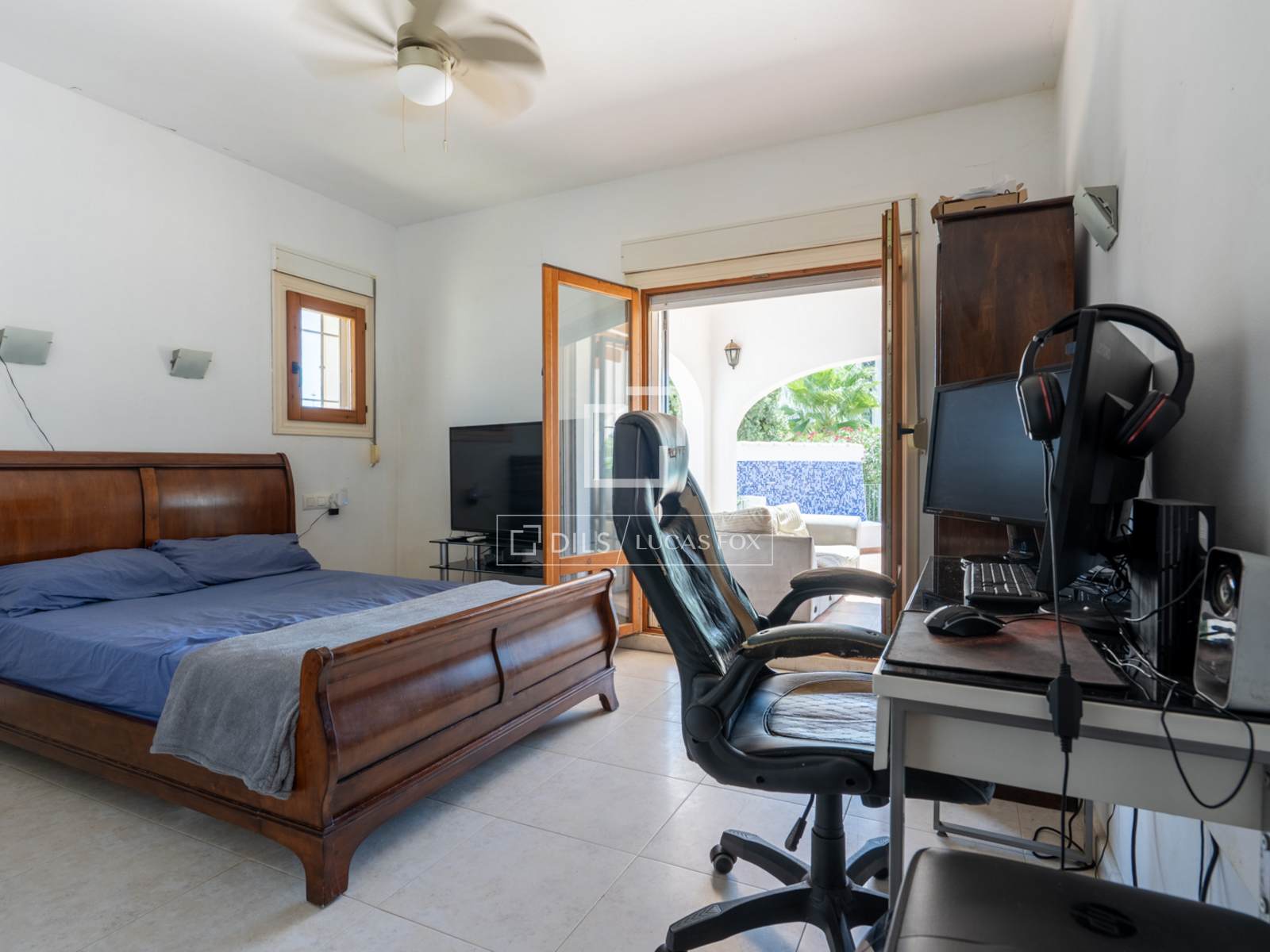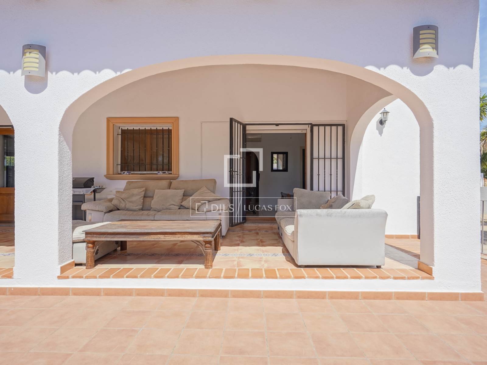 The property is entirely on one level and features a cozy living-dining room with a fireplace and an adjoining semi-open kitchen. There are three double bedrooms in total, one of which has an en-suite bathroom, plus a separate bathroom. Both the living room and the master bedroom have direct access to a spacious covered terrace by the pool, the perfect place to relax and enjoy the Mediterranean climate. A few steps down is a sunny uncovered terrace with a barbecue. The villa also has a low-maintenance Mediterranean garden with palm trees, flowering shrubs, and a pomegranate tree.