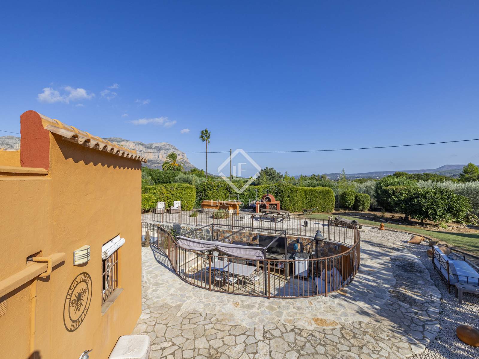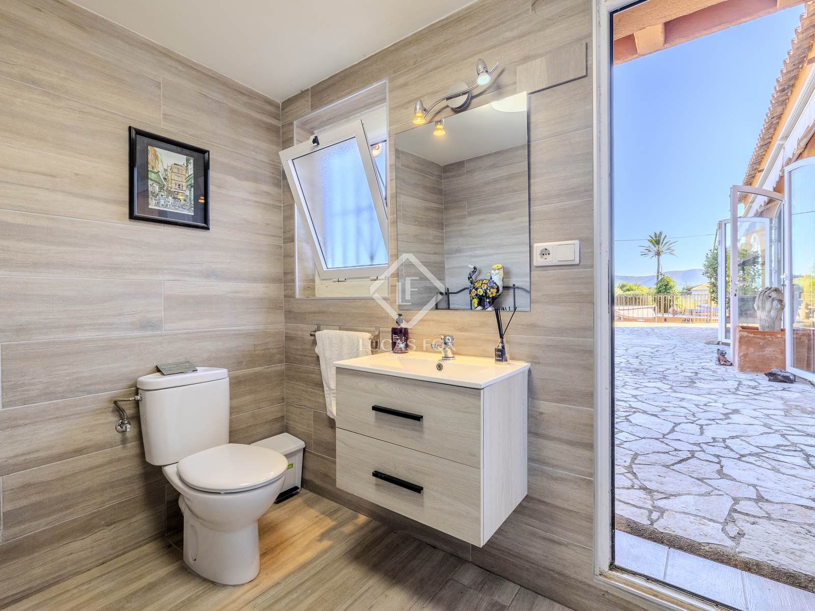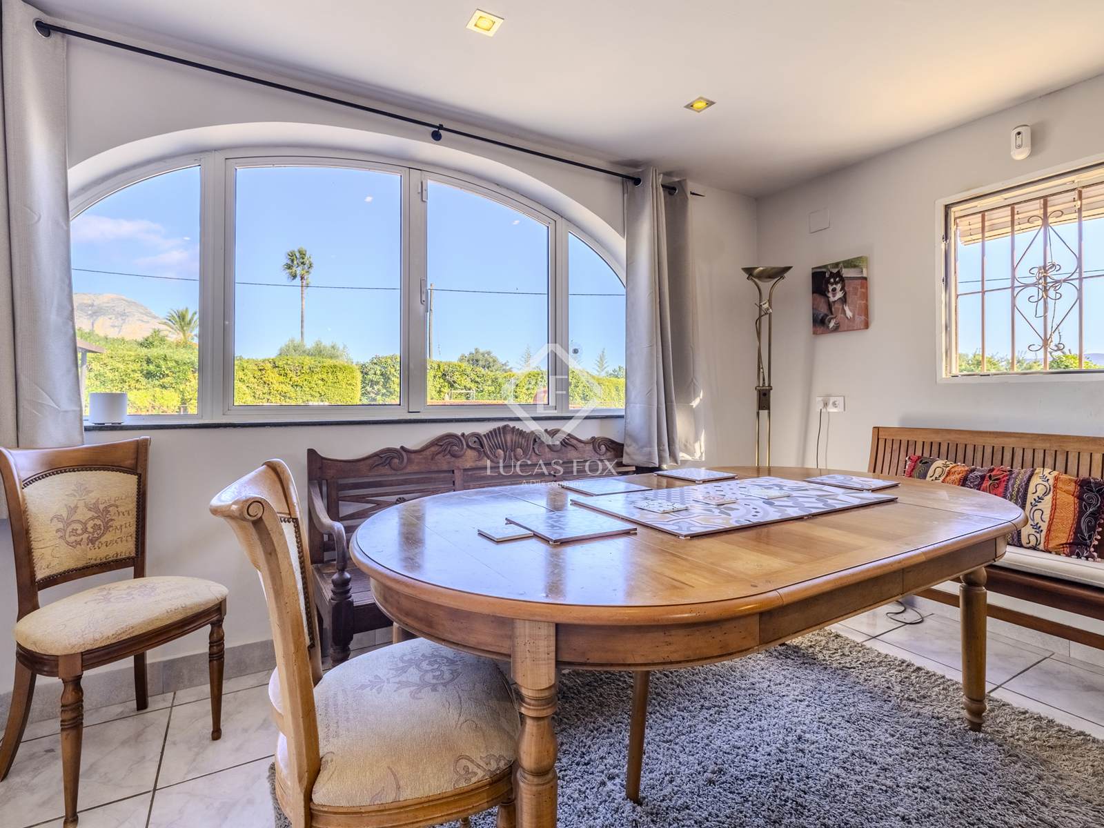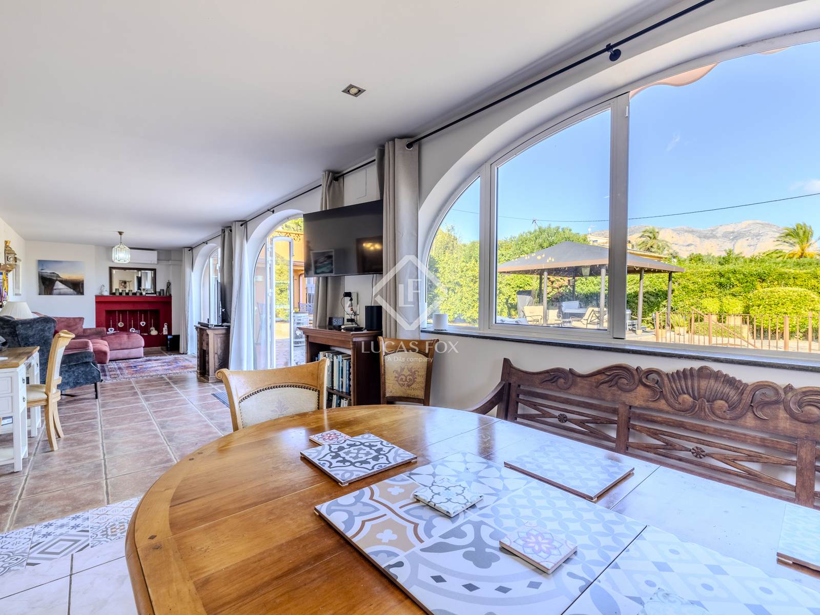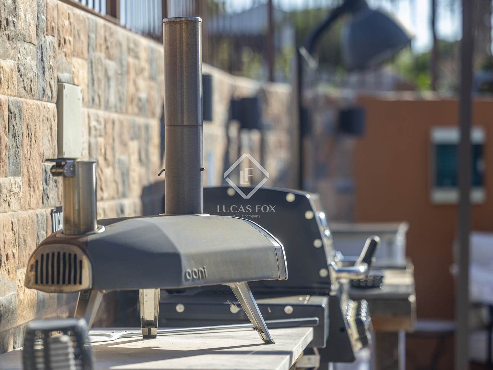 The west-facing porch, the perfect spot for evening apéritifs, sets the tone. Inside, the living room impresses with high ceilings and a pellet burner, onto the spacious open-plan kitchen, dining, and living area boasts expansive windows framing Montgó mountain, while the professionally equipped kitchen and large utility room cater to both home chefs and entertainers.
