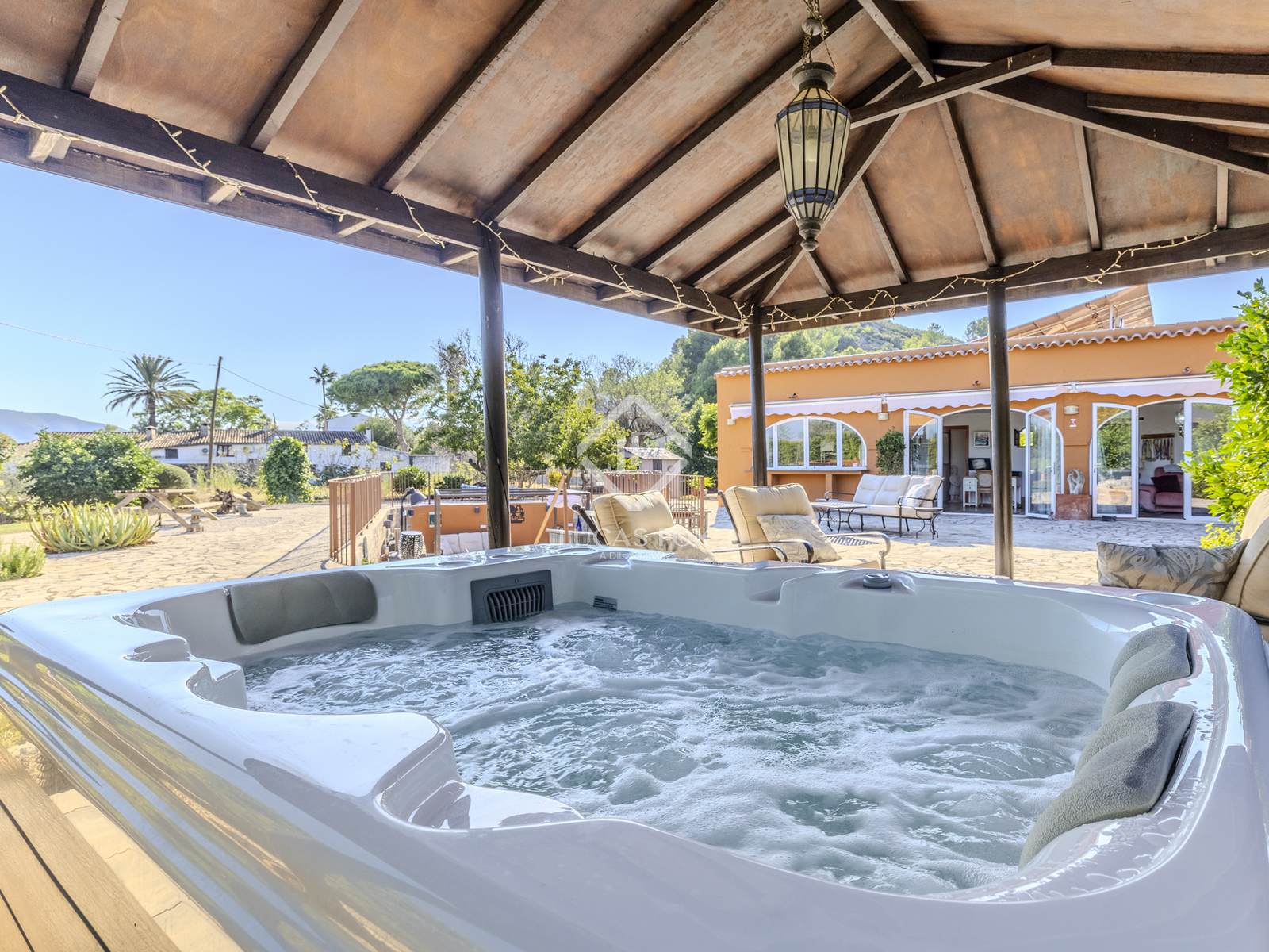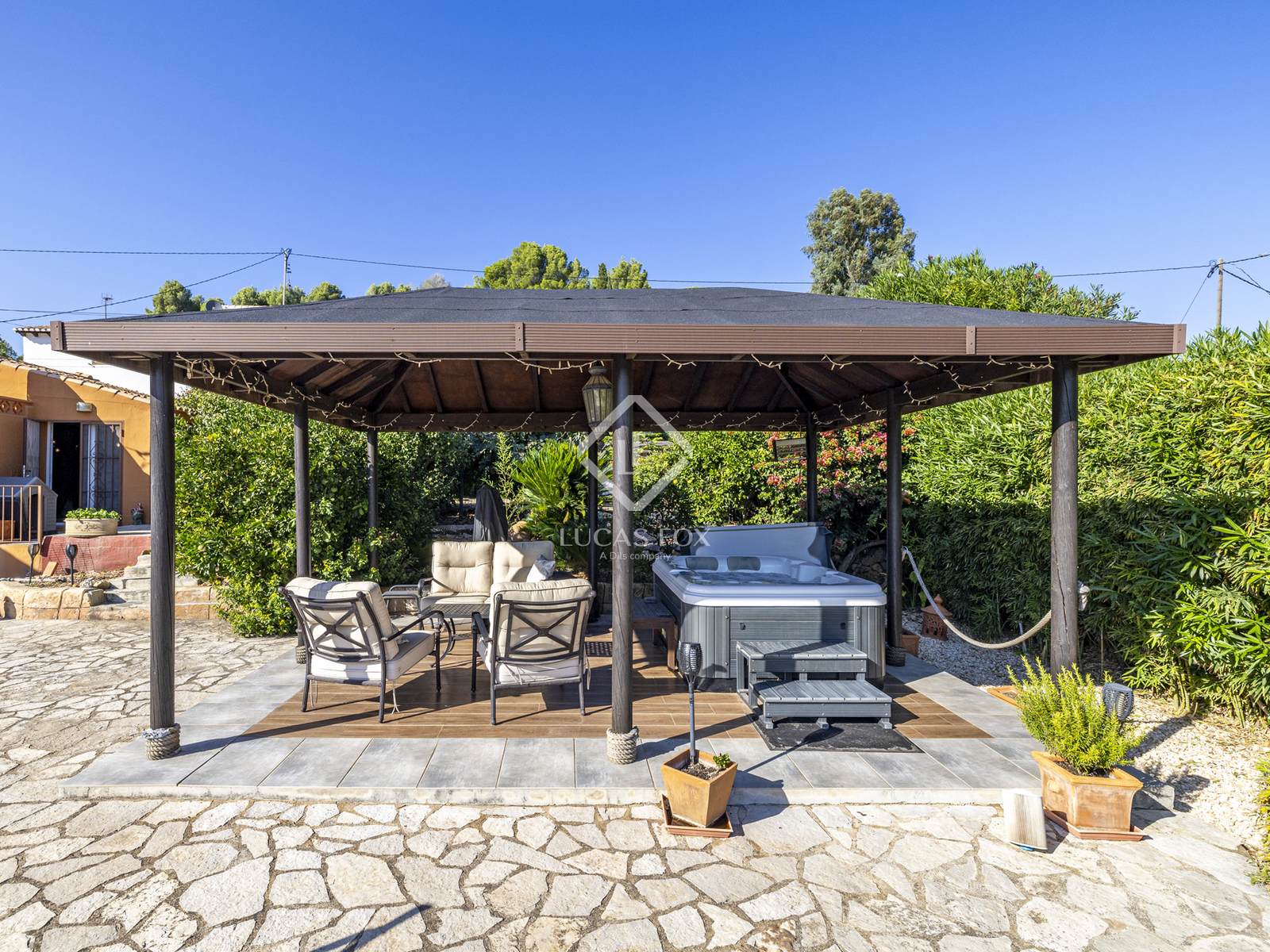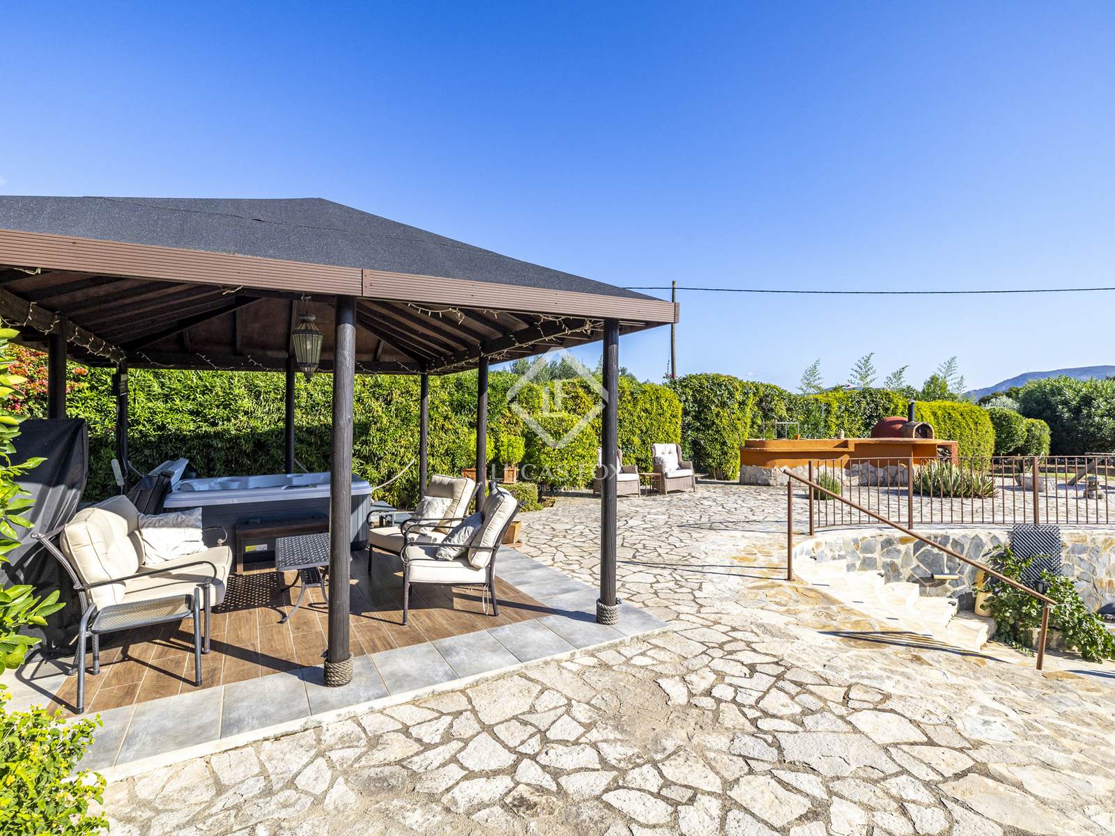Outdoors, the finca is a paradise for garden lovers. A sunken dining terrace, summer kitchen with BBQ, paellero, and pizza oven, shaded pergola with jacuzzi, and even a chicken coop complement the thriving orchard. Fruit trees abound—avocado, fig, orange, lime, grapefruit, walnut, peach, and pomegranate—alongside a flourishing vegetable patch.