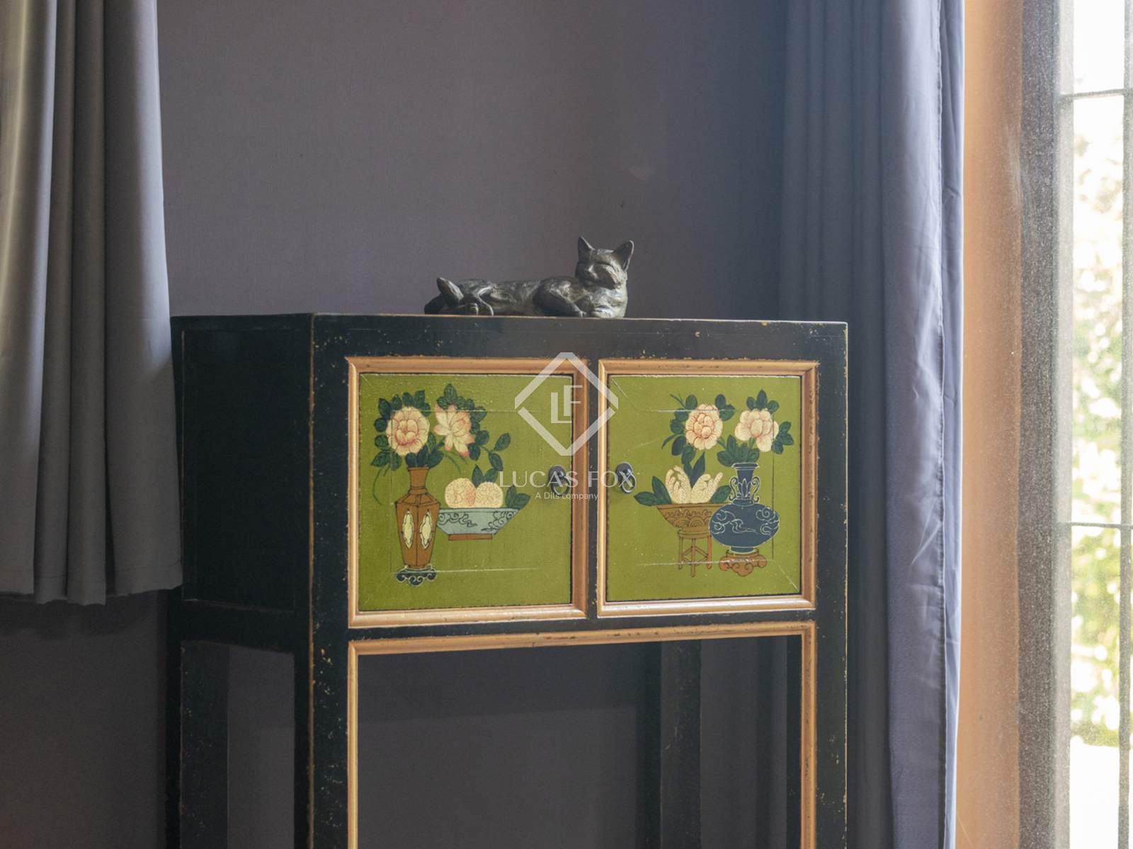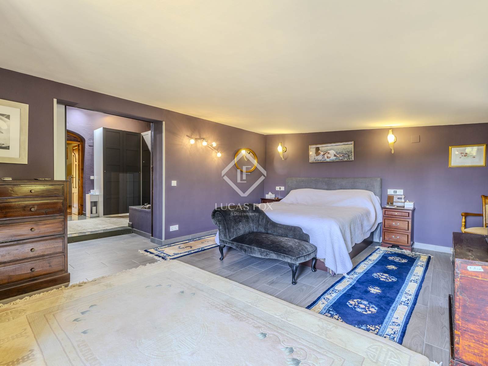 Just a few steps up, a cozy library snug with woodburner provides a quiet retreat. This level also features a double bedroom with ensuite shower, dressing room/office, and private terrace. The master suite is a true sanctuary, with a luxurious bathroom, dressing room, and garden access. Upstairs, a guest suite includes its own shower room and a spectacular roof terrace—ideal for sunset views.