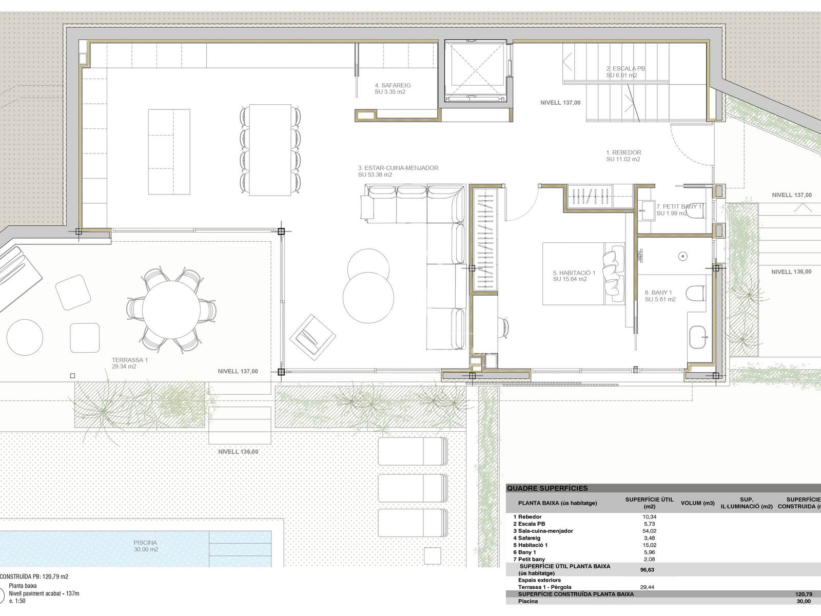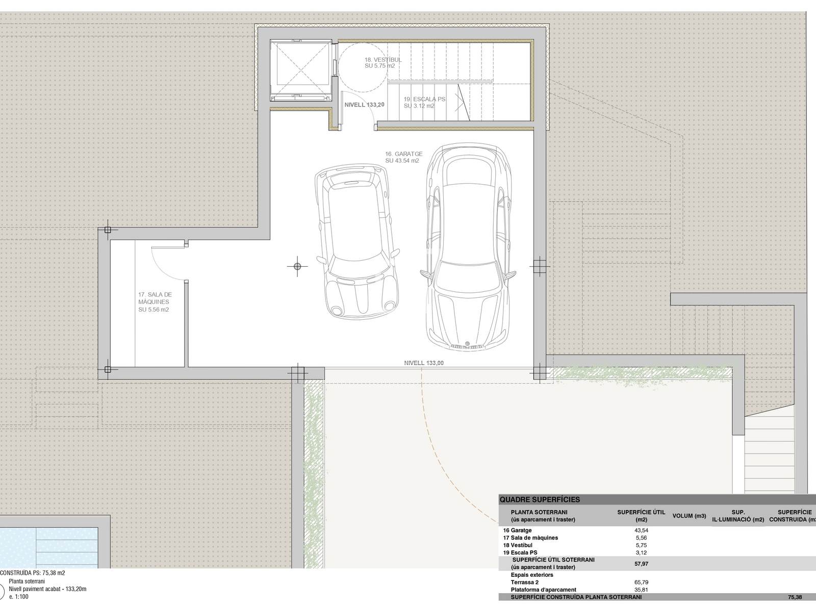 On the lower floor there is a garage with capacity for two vehicles and the machine room.