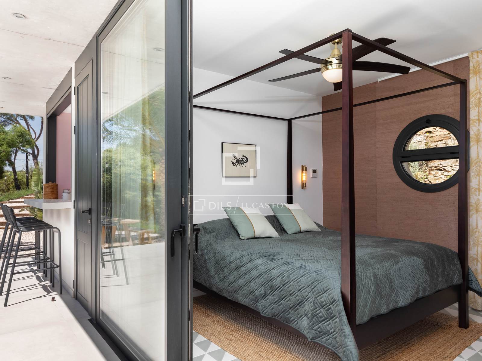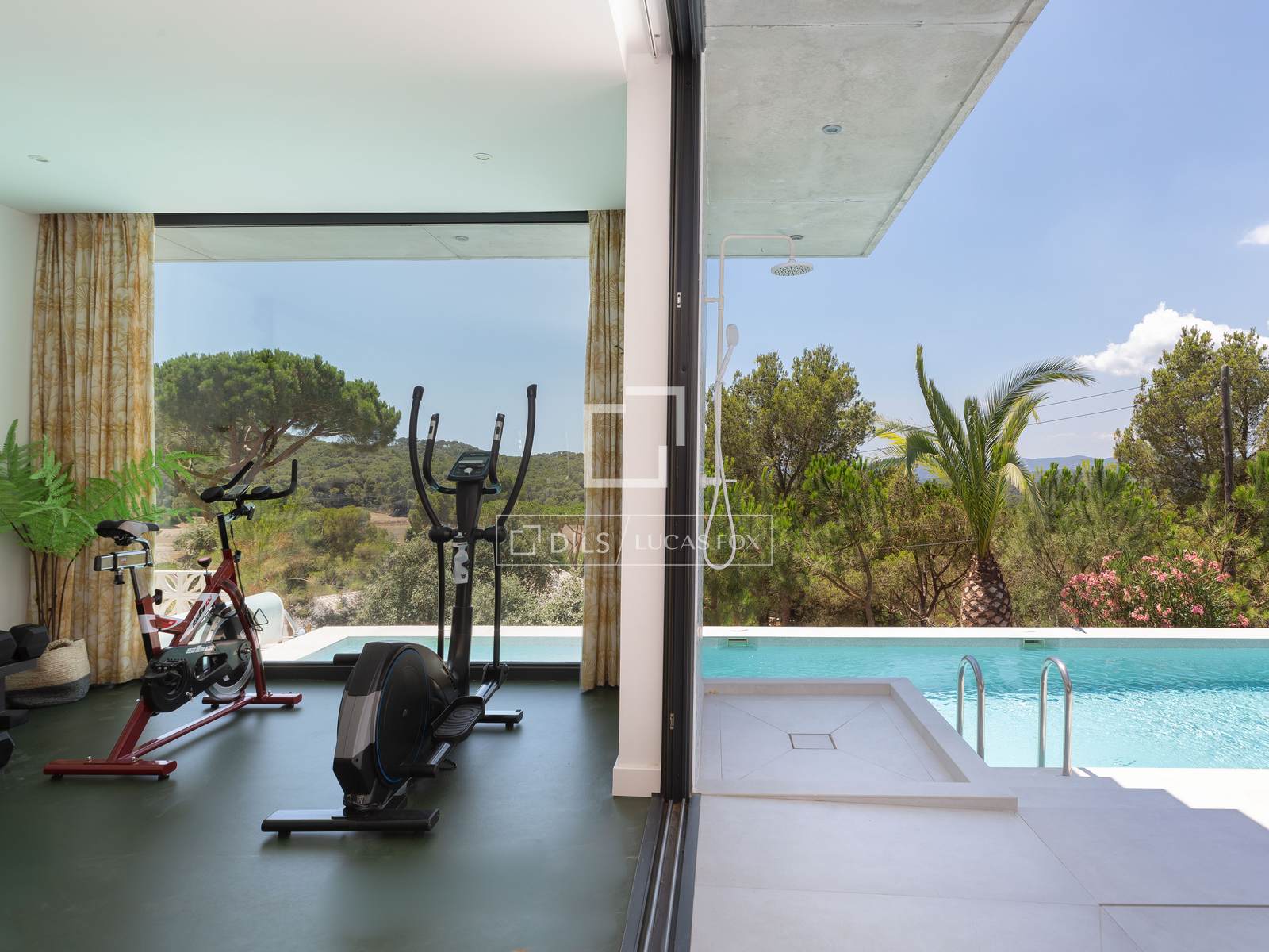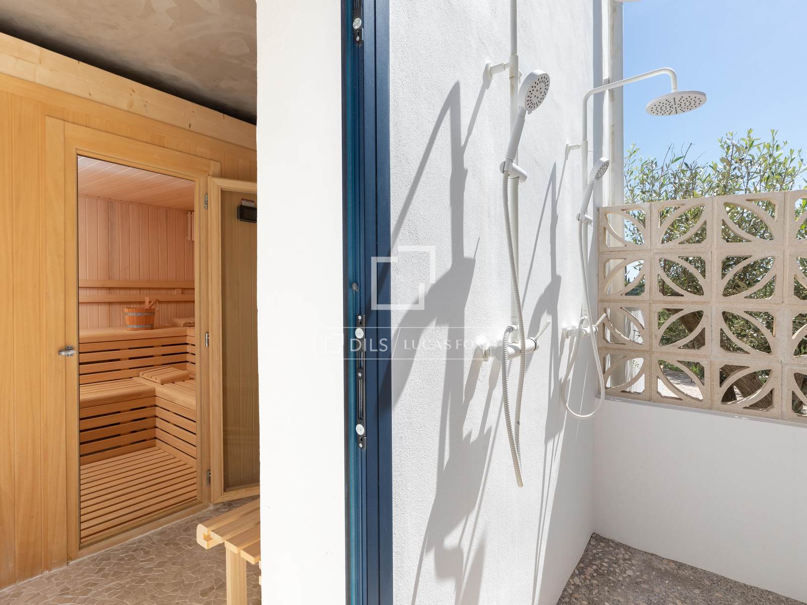The exterior has been designed to make the most of the Mediterranean climate, with over 300 m² of terraces and multiple relaxation areas . Highlights include an impressive 18 x 3.5 m heated pool , along with a dry sauna, jacuzzi, exterior bar area, summer kitchen with an Argentinian barbecue, and a pétanque court. In addition, the property features a fully equipped gym, a TV room, and several outdoor showers.