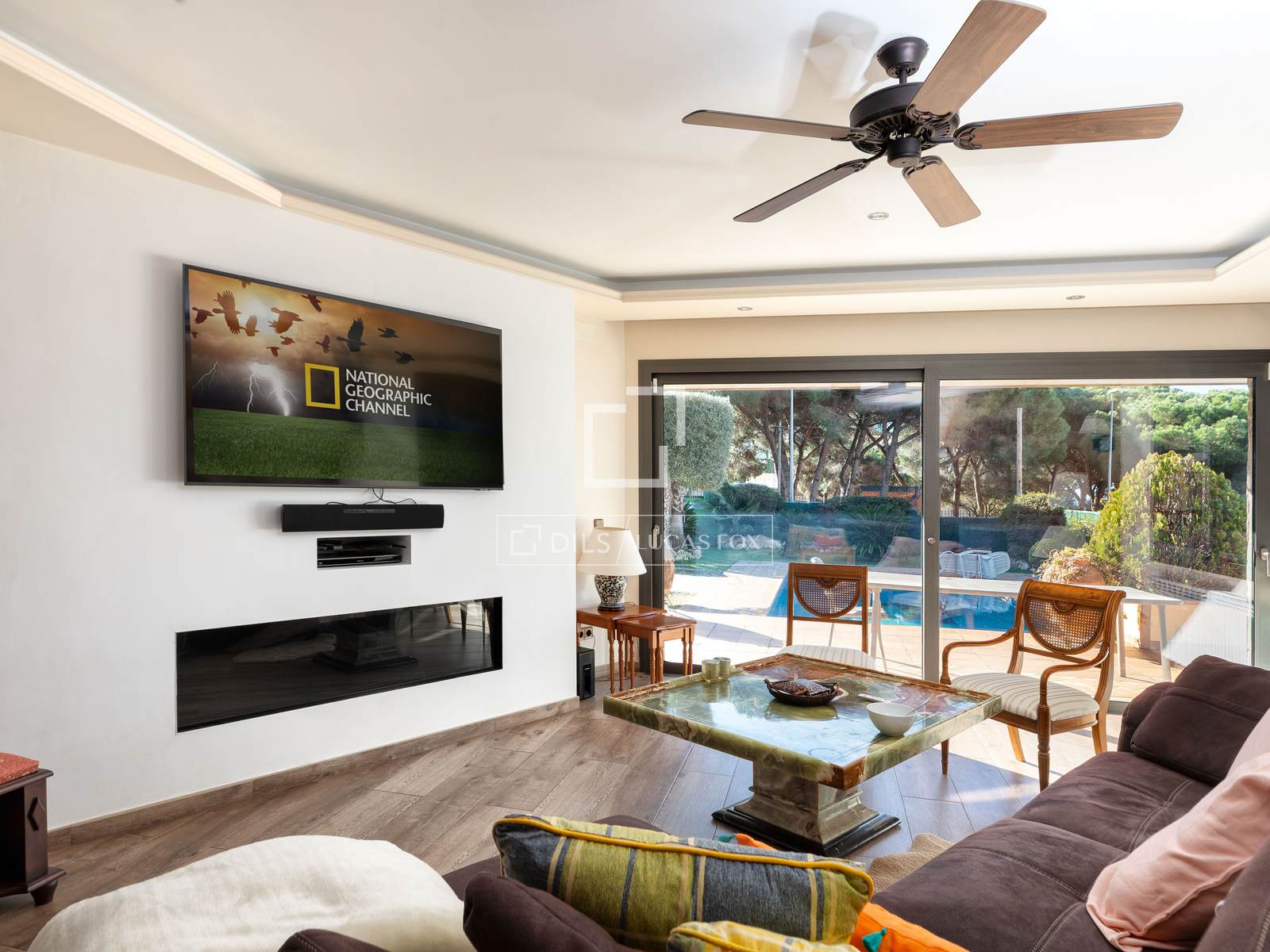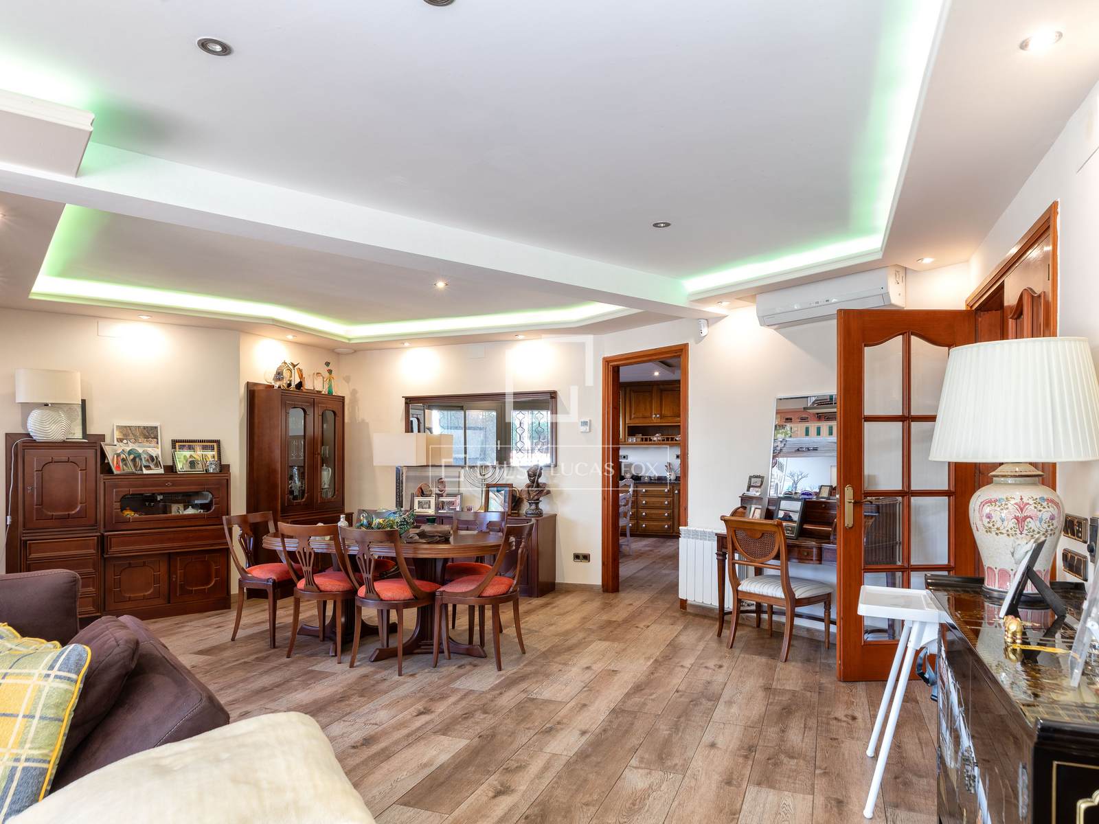 The property is equipped with air conditioning and central heating powered by mains gas, as well as built-in wardrobes and a storage room.