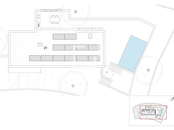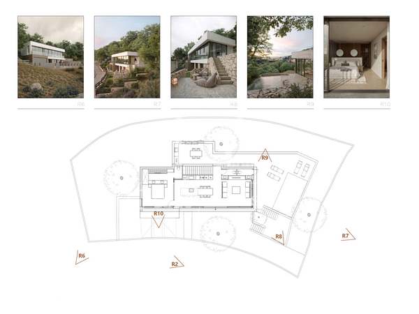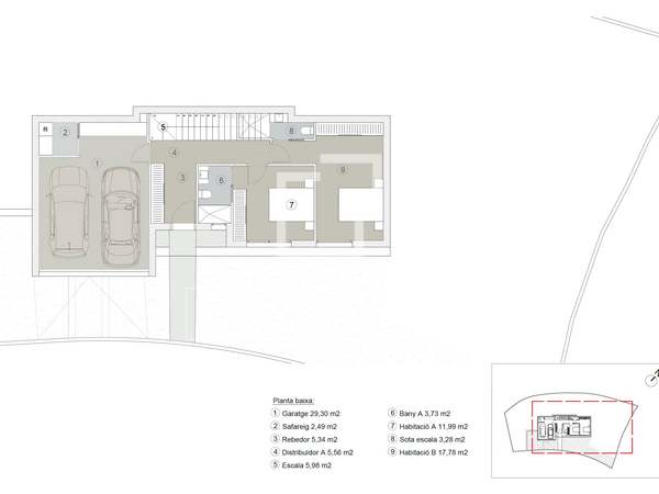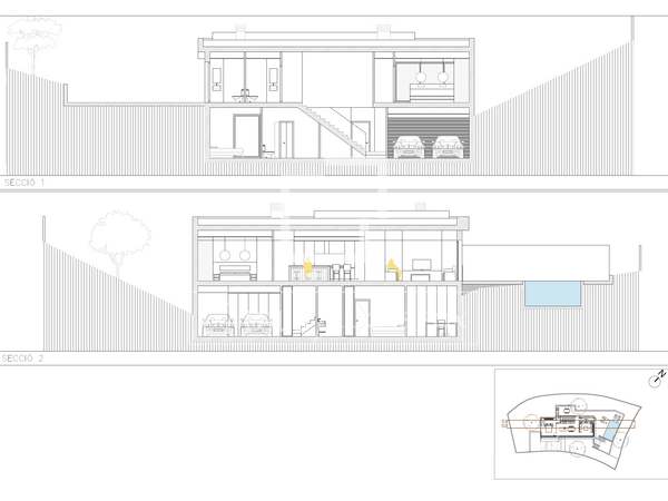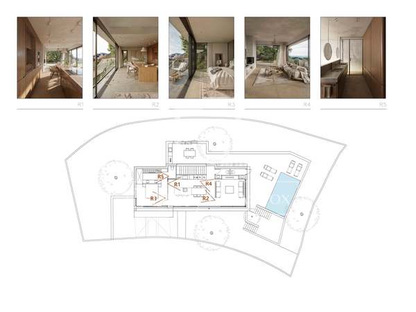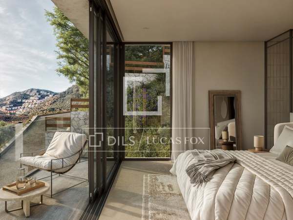 The villa is distributed over three floors and has 357 m² built on a plot of 1,034 m². On the main floor there is a living-dining room with large windows that offer beautiful views and access to the covered terrace with a dining and chill-out area and to the garden with an infinity pool. This floor is completed with a fully equipped kitchen with access to the garden and barbecue area, a courtesy toilet, two bedrooms and a bathroom.
