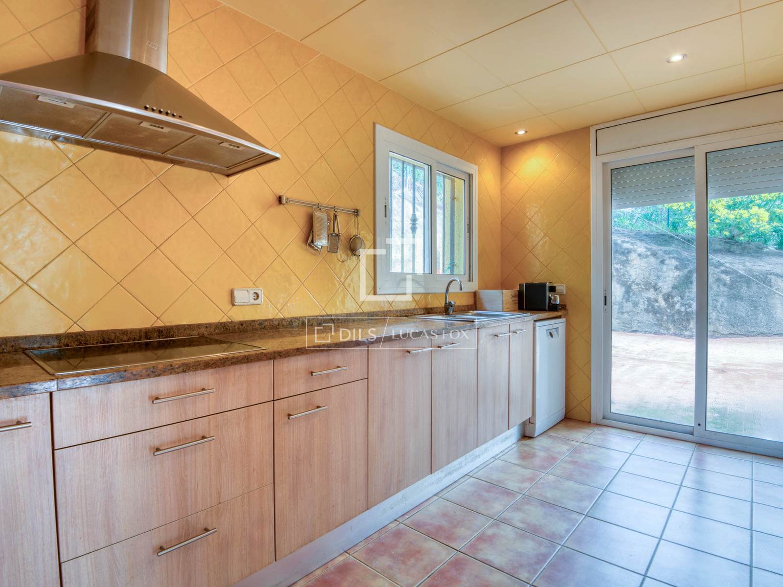 From the main entrance hall, we access a bright, south-facing living-dining room , equipped with a fireplace and air conditioning, as are the rest of the rooms. The separate kitchen connects directly to the exterior terrace, where we find a pleasant chill-out area with a barbecue and access to the 30 m² private swimming pool.