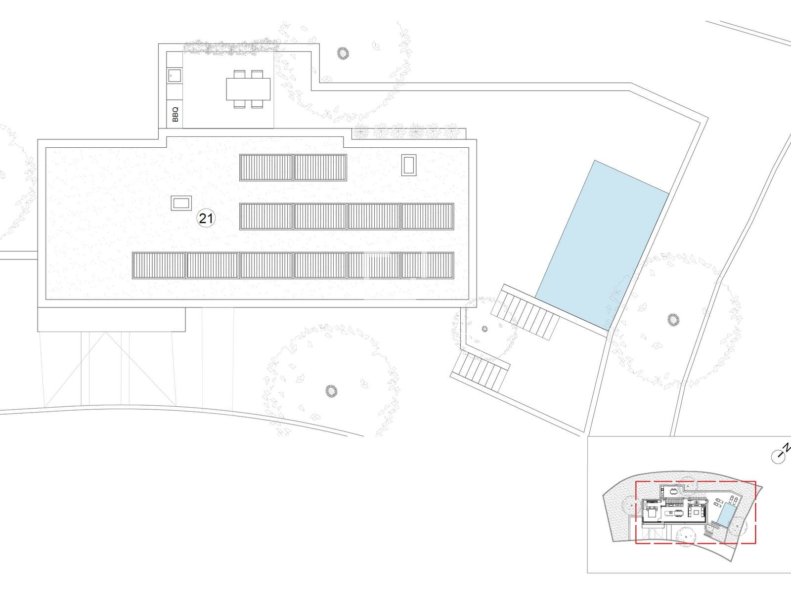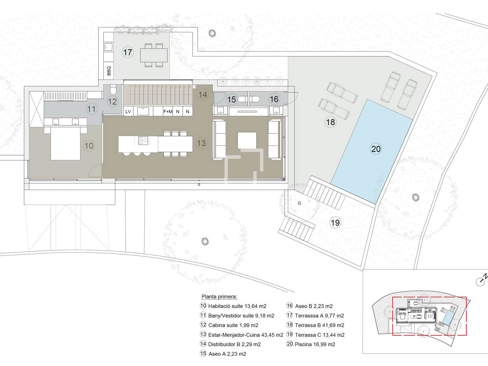 The exterior features a private swimming pool of approximately 17 m², seamlessly integrated into the design, ideal for enjoying the Mediterranean climate with open views. There is also an exterior kitchen to fully appreciate the exterior space and a toilet to ensure convenient use of the pool and exterior area.