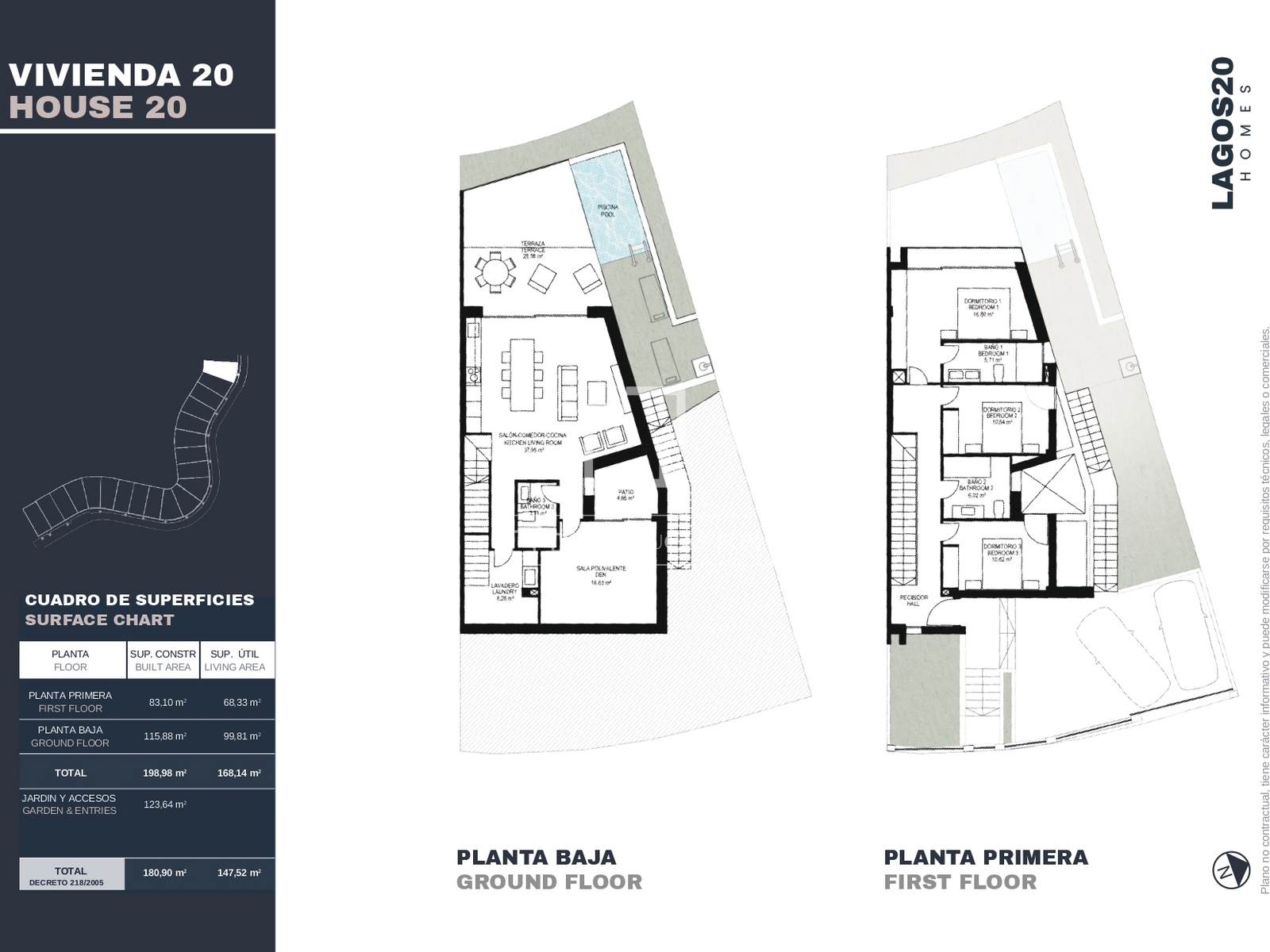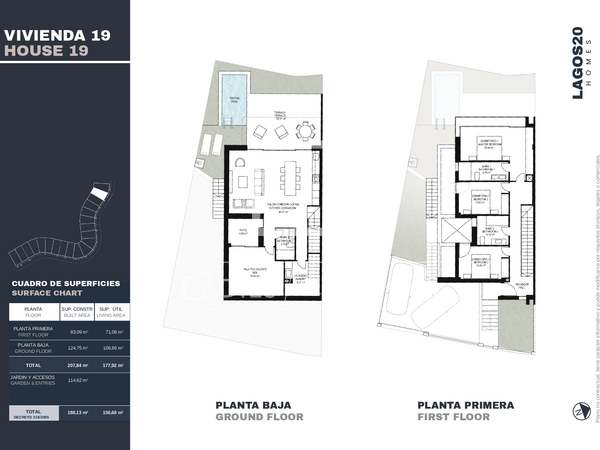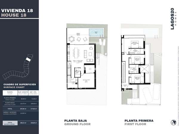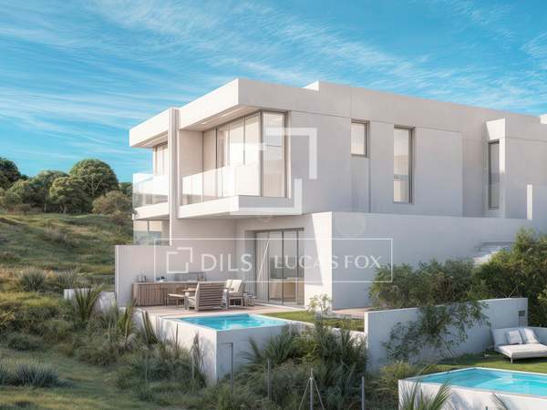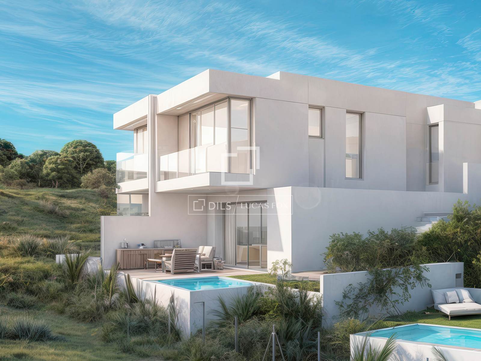 This semi-detached two-storey home has an ideal layout for family life. On the ground floor, we find an open-plan living, dining, kitchen area which leads out to a private garden and pool. Also on this level is a laundry area, a bathroom and a room that can be used as a study or fourth bedroom for example. The first floor provides three more bedrooms and two bathrooms. Clean architectural lines, abundant natural light and seamless integration with the outdoor environment define these properties, creating a relaxed Mediterranean lifestyle throughout the year.