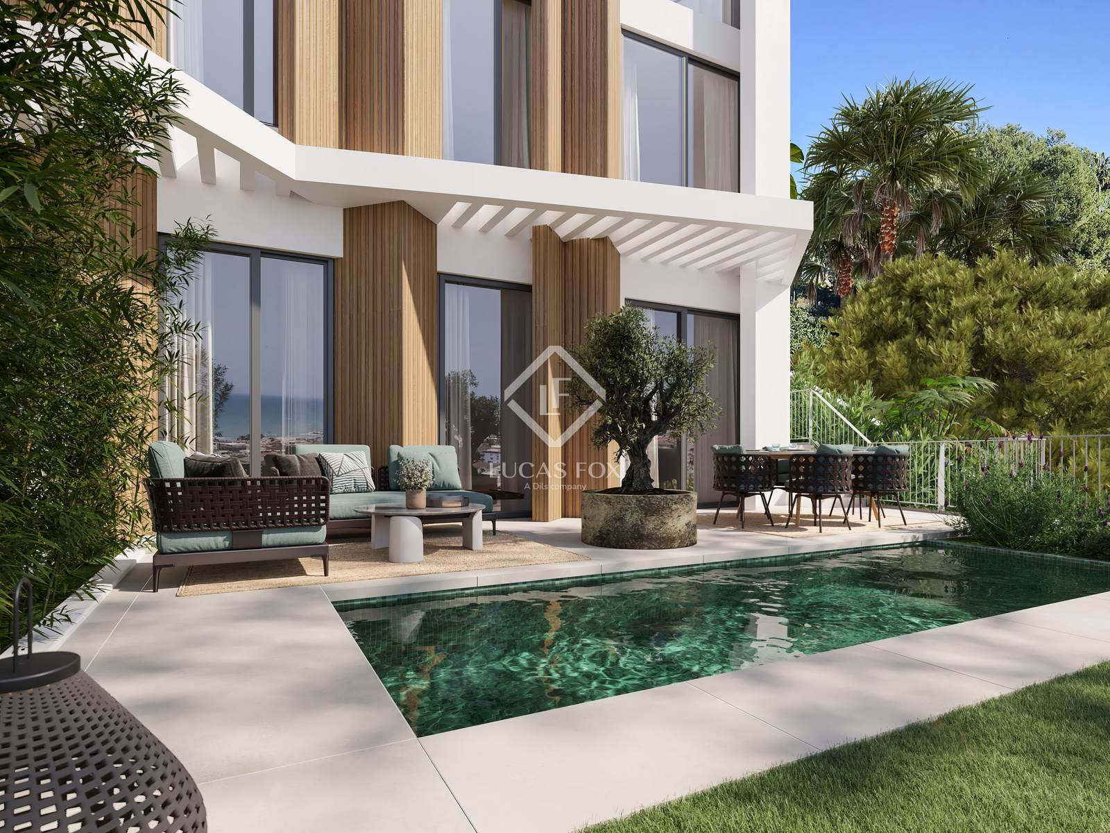 3-bedroom ground floor apartment with a garden and pool for sale in a new development in Pedregalejo, Malaga.