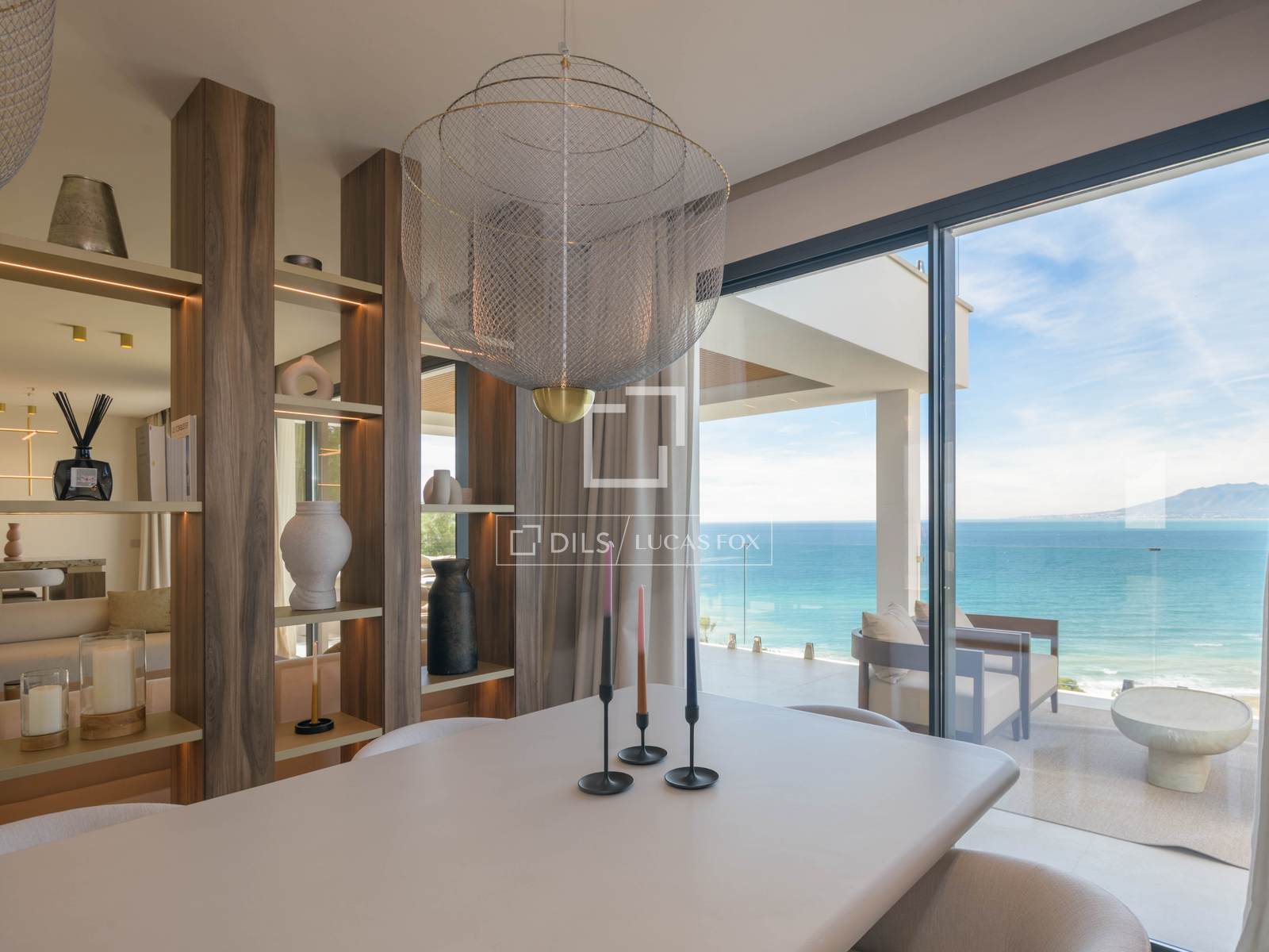 La planta central es completamente diáfana y representa el corazón social de la vivienda. Integra comedor, salón y cocina abierta en un único espacio de grandes dimensiones, todo ello orientado hacia el Mediterráneo mediante ventanales de suelo a techo que enmarcan las vistas y permiten una conexión fluida entre interior y exterior. En esta planta también se ubica el apartamento de servicio.