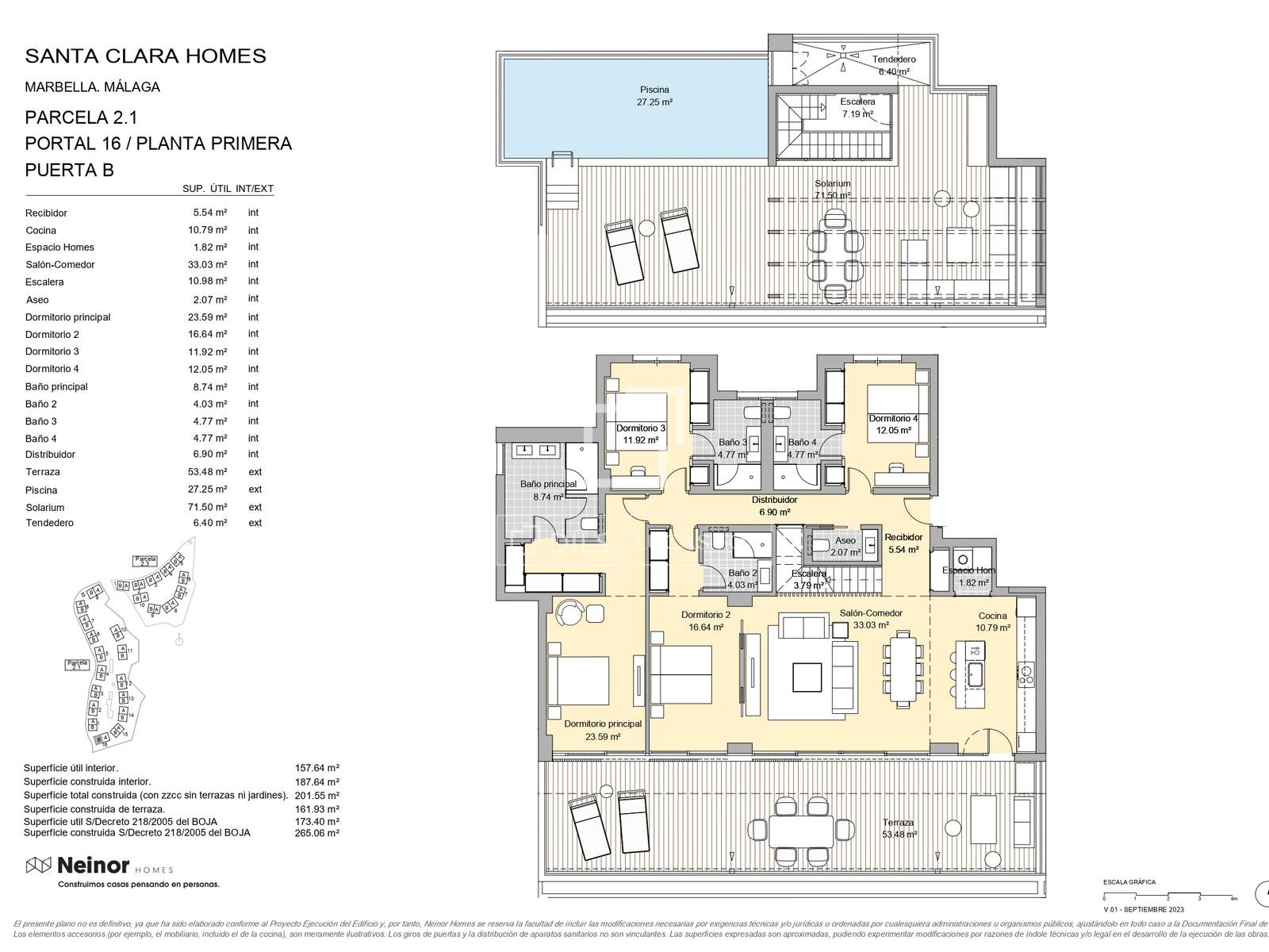 The building has been constructed to the highest standards. The foundation was laid according to the geotechnical study, the reinforced concrete structure complies with all current regulations, and the flat roofs incorporate a double layer of asphalt shingles and thermal insulation to guarantee efficiency and waterproofing. The exterior finishes combine plaster, ceramic cladding, and wood-textured composite elements that enhance the overall architecture.