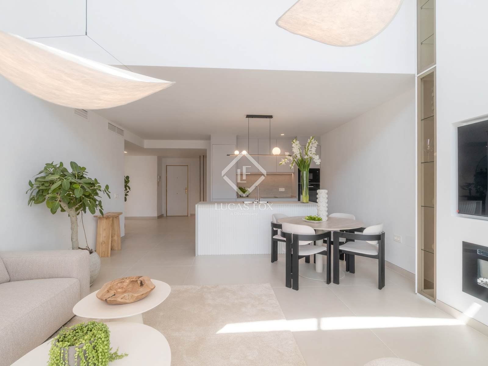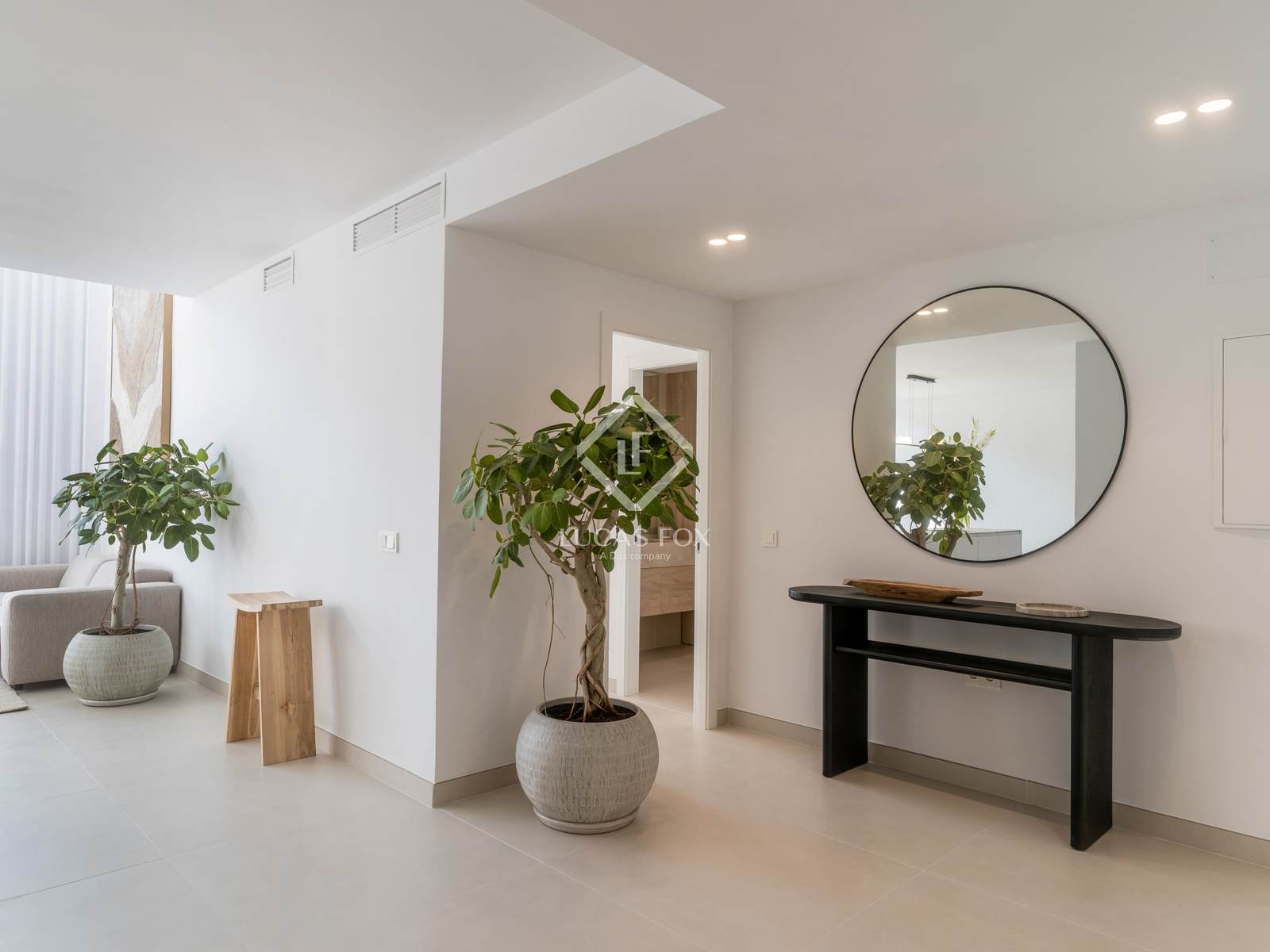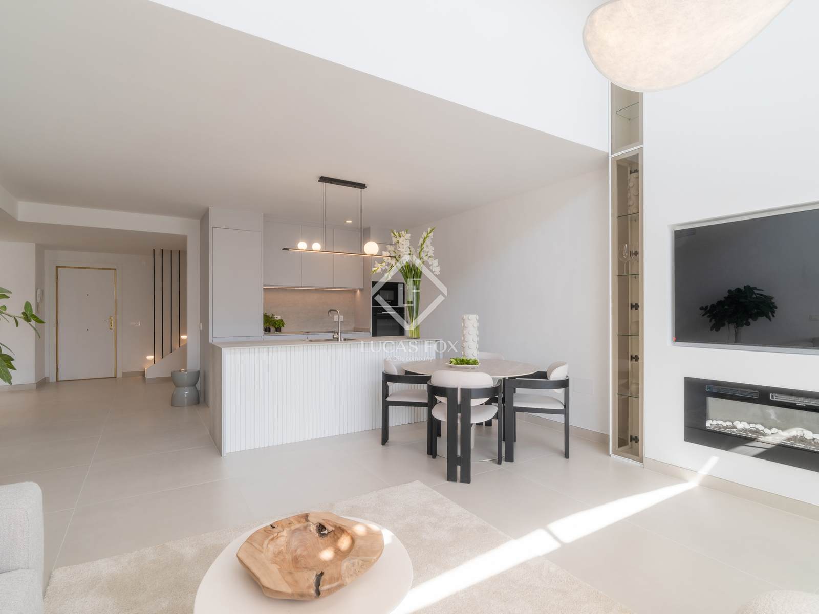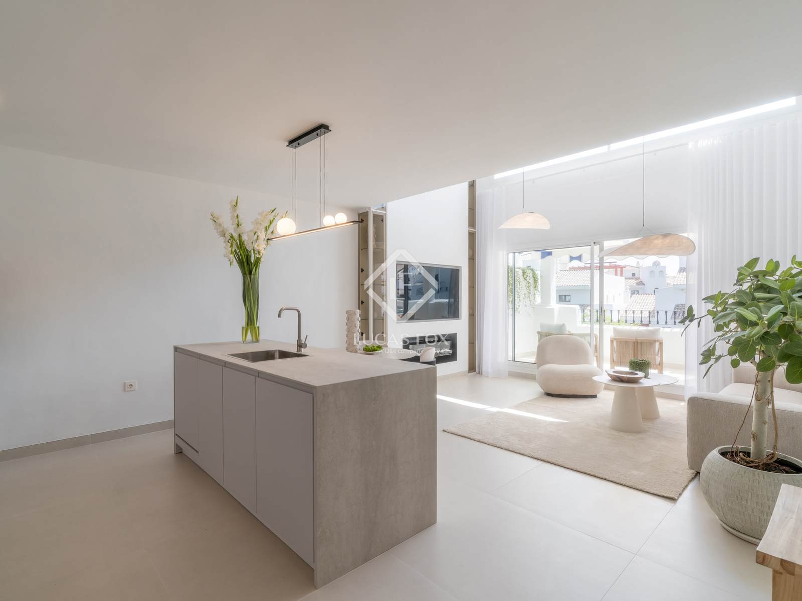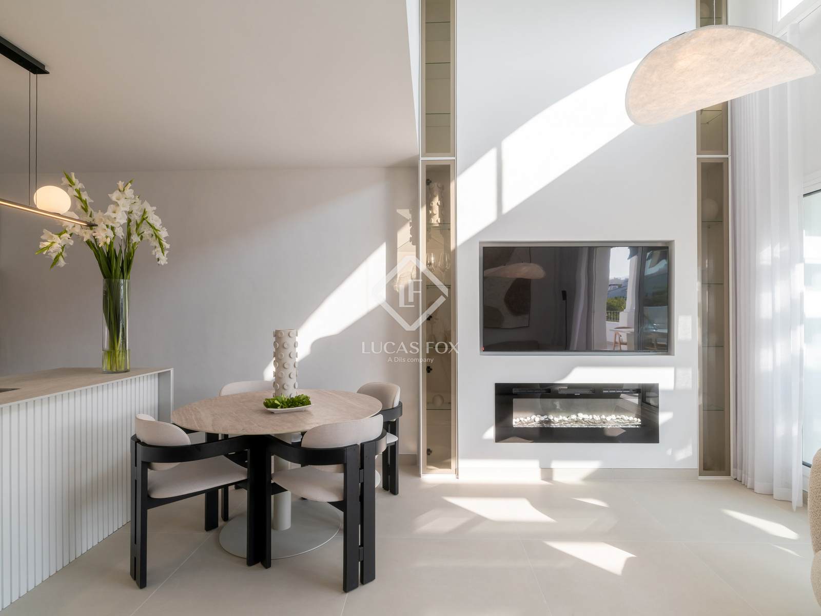 Spanning 180 m² of thoughtfully designed interiors and an impressive 141 m² of outdoor terraces, the penthouse has been fully renovated in a chic Scandinavian style, blending elegance with modern comfort. The main level features a bright open-plan kitchen, seamlessly connected to a spacious living and dining area crowned by a striking vaulted ceiling. Floor-to-ceiling glass doors flood the space with natural light and open directly to a private terrace, perfect for al fresco dining or simply embracing the Mediterranean breeze.