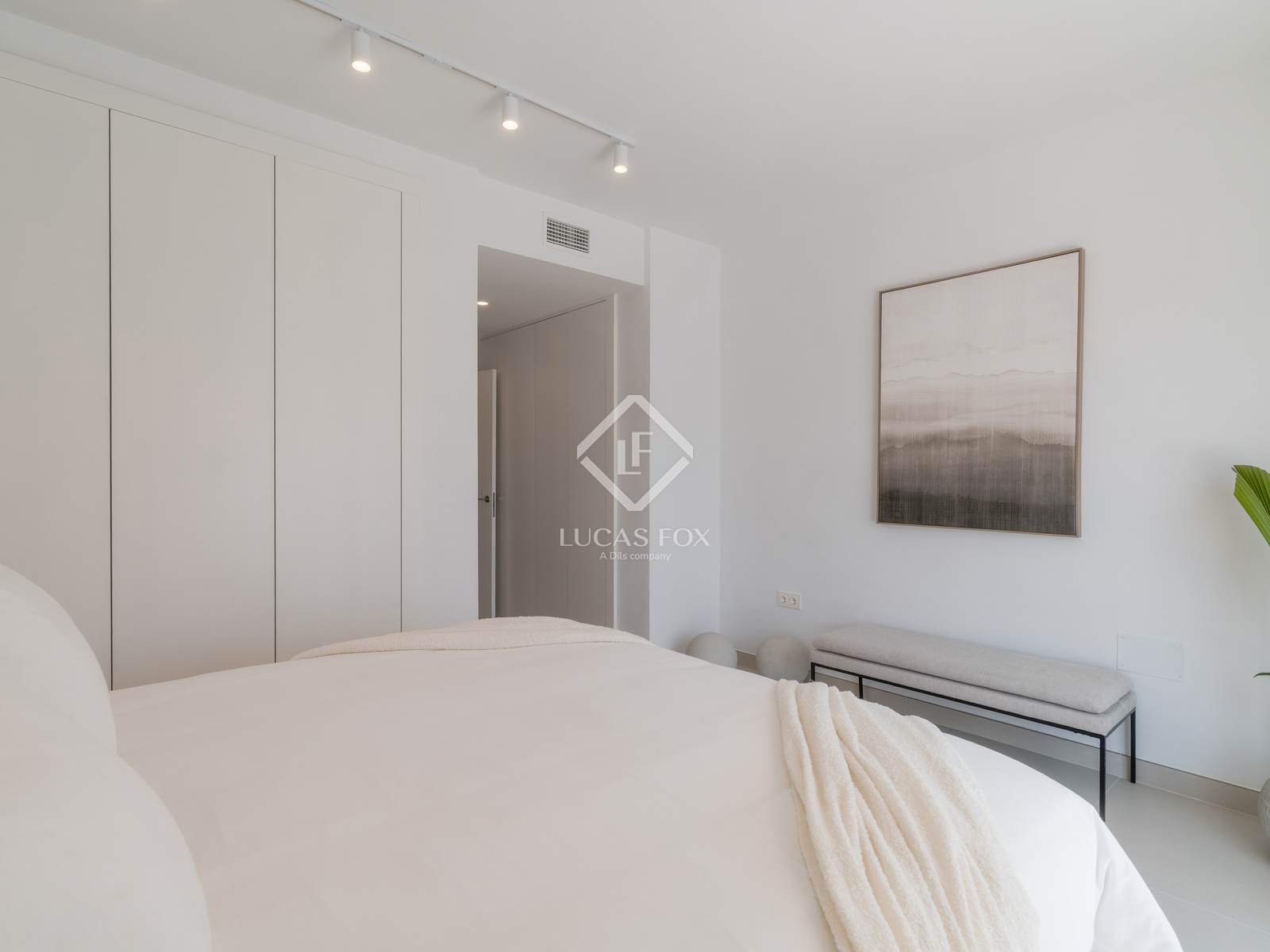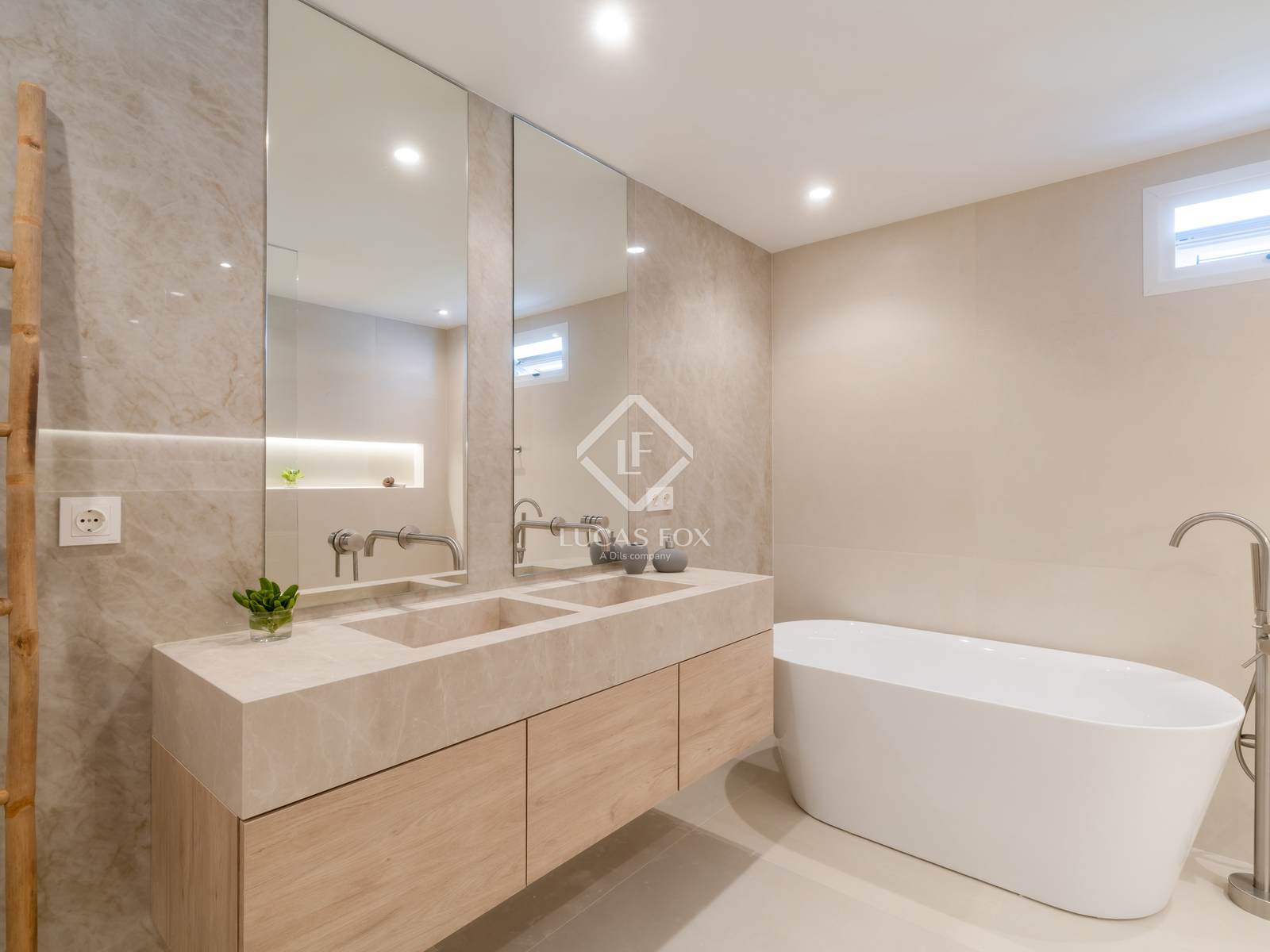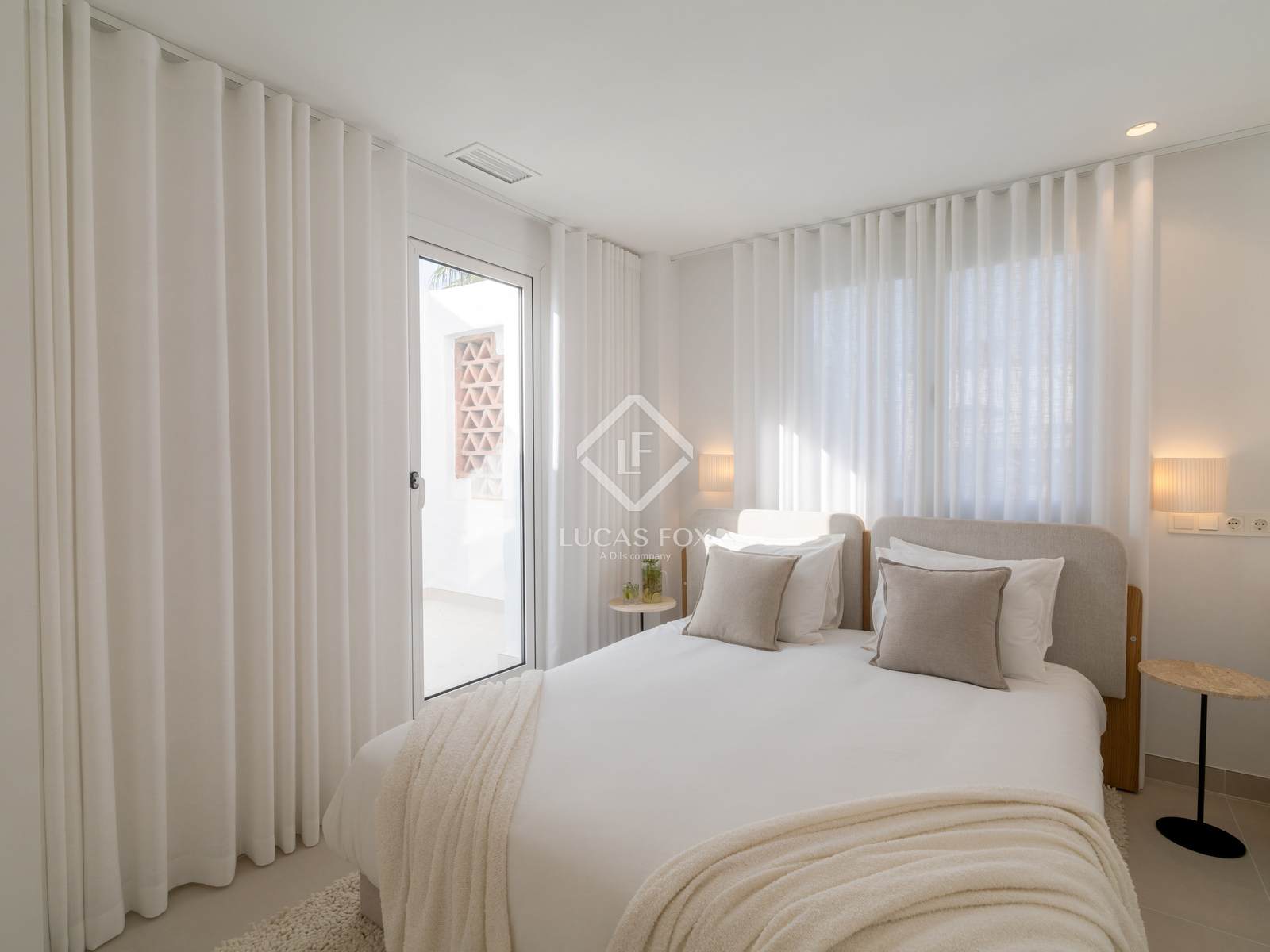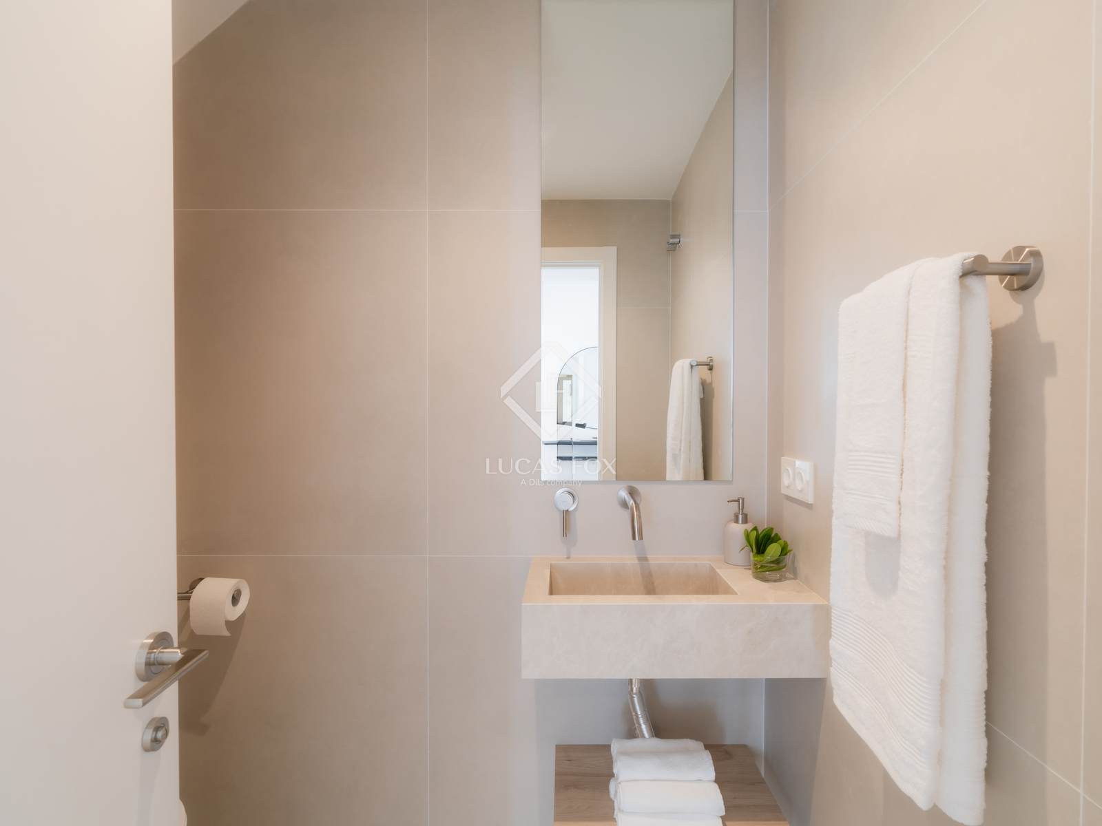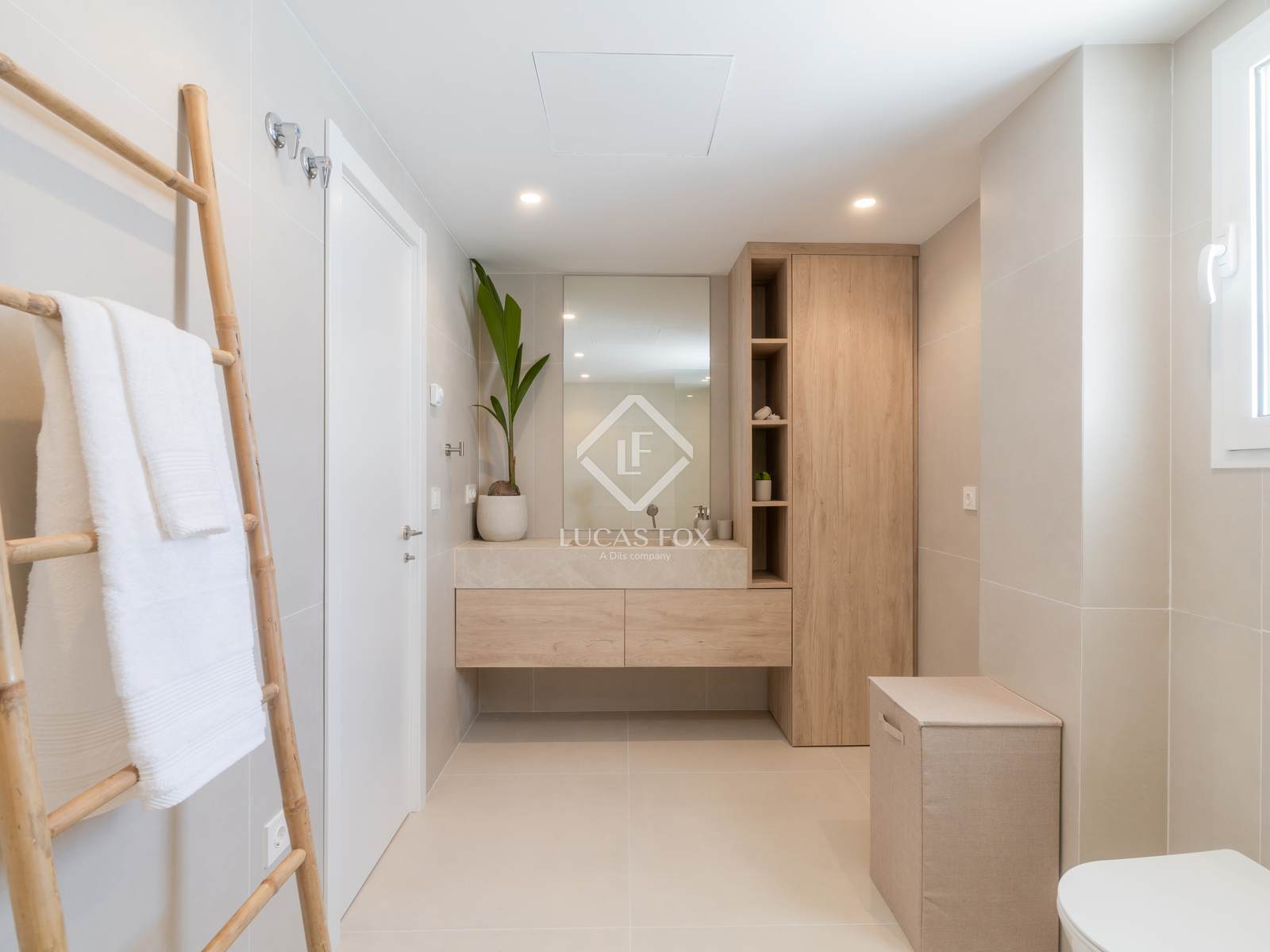 Spanning 180 m² of thoughtfully designed interiors and an impressive 141 m² of outdoor terraces, the penthouse has been fully renovated in a chic Scandinavian style, blending elegance with modern comfort. The main level features a bright open-plan kitchen, seamlessly connected to a spacious living and dining area crowned by a striking vaulted ceiling. Floor-to-ceiling glass doors flood the space with natural light and open directly to a private terrace, perfect for al fresco dining or simply embracing the Mediterranean breeze.
