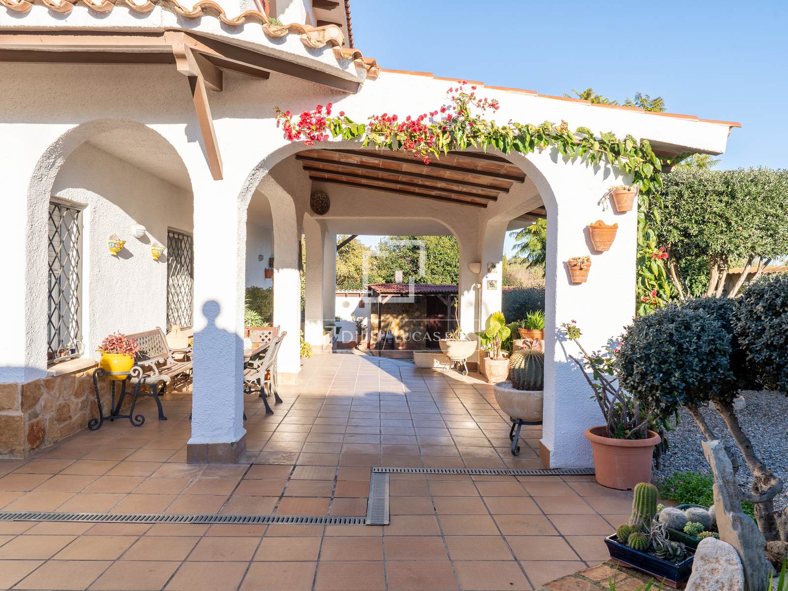 Upon arrival, you are greeted by a beautifully maintained private garden with established vegetation, low-maintenance gravel areas , and secluded spots for relaxation. The house opens to the exterior through a spacious covered porch with arches and a traditional-style roof, ideal as a summer dining room or chill-out area.