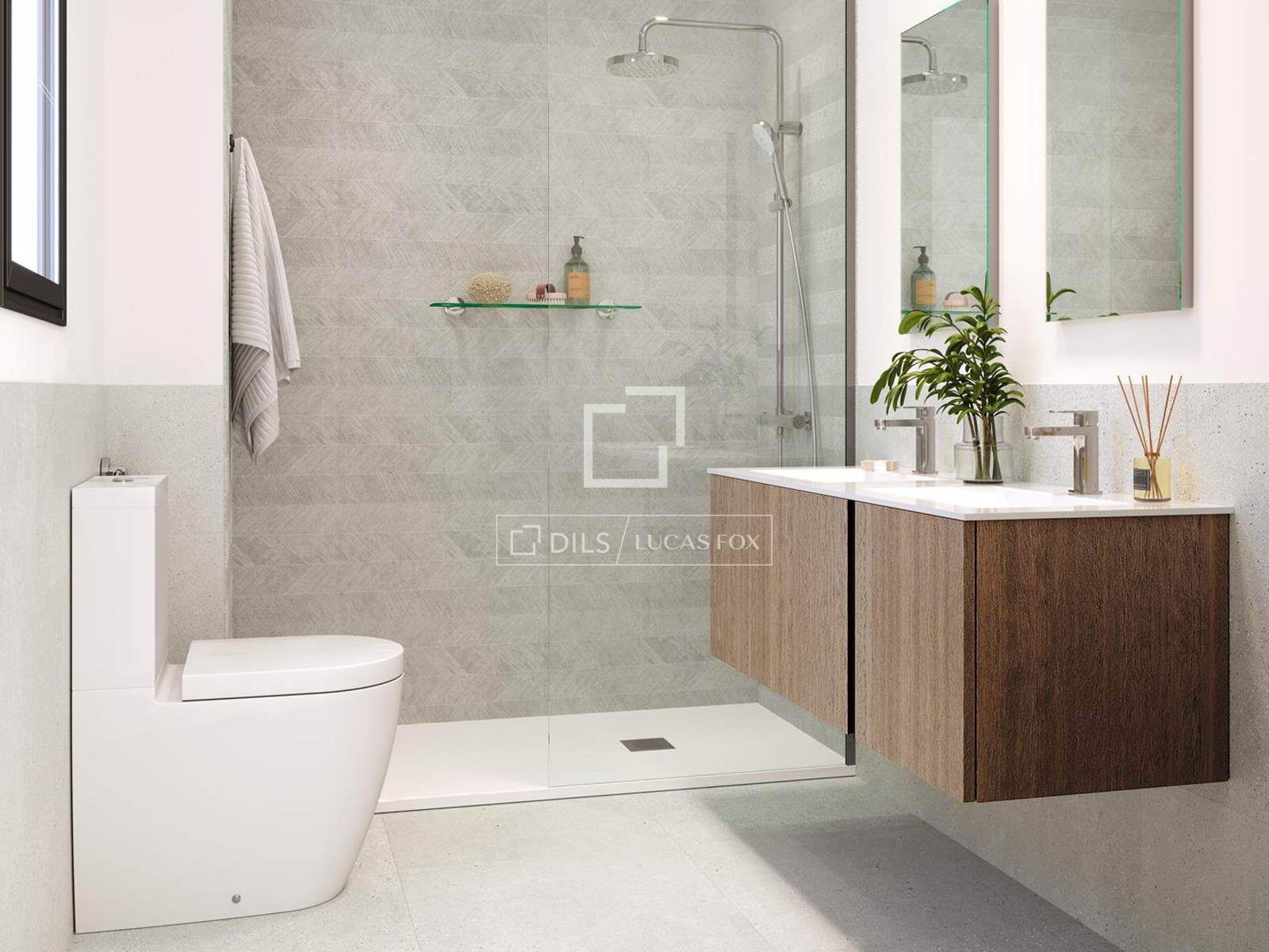 The ground floor offers an open plan layout that integrates a fitted kitchen with a peninsula connected to the living-dining room. Large windows access the beautiful garden and allow abundant natural light to enter. The staircase is integrated as a decorative element between the different floors. The kitchen is equipped with wall and base units, with color options from those presented by the developer, and a countertop and fronts in customizable colors. It also includes high-quality appliances , such as an induction cooktop, electric oven, microwave, and decorative extractor hood. A toilet and space for a lift complete this floor.