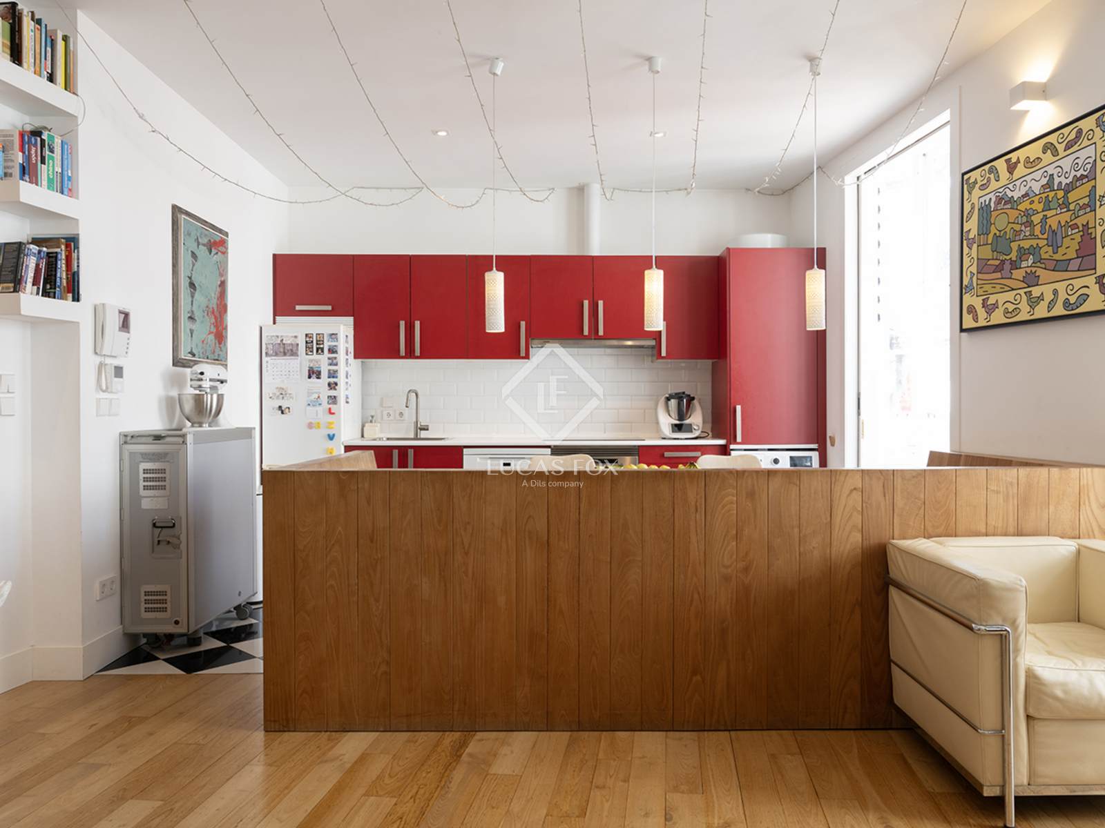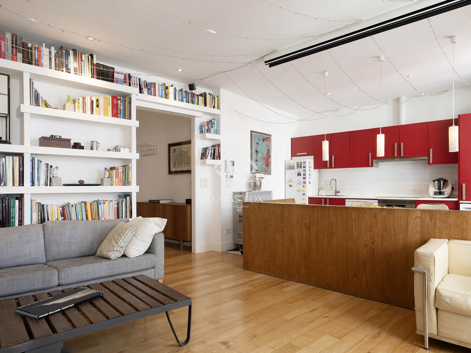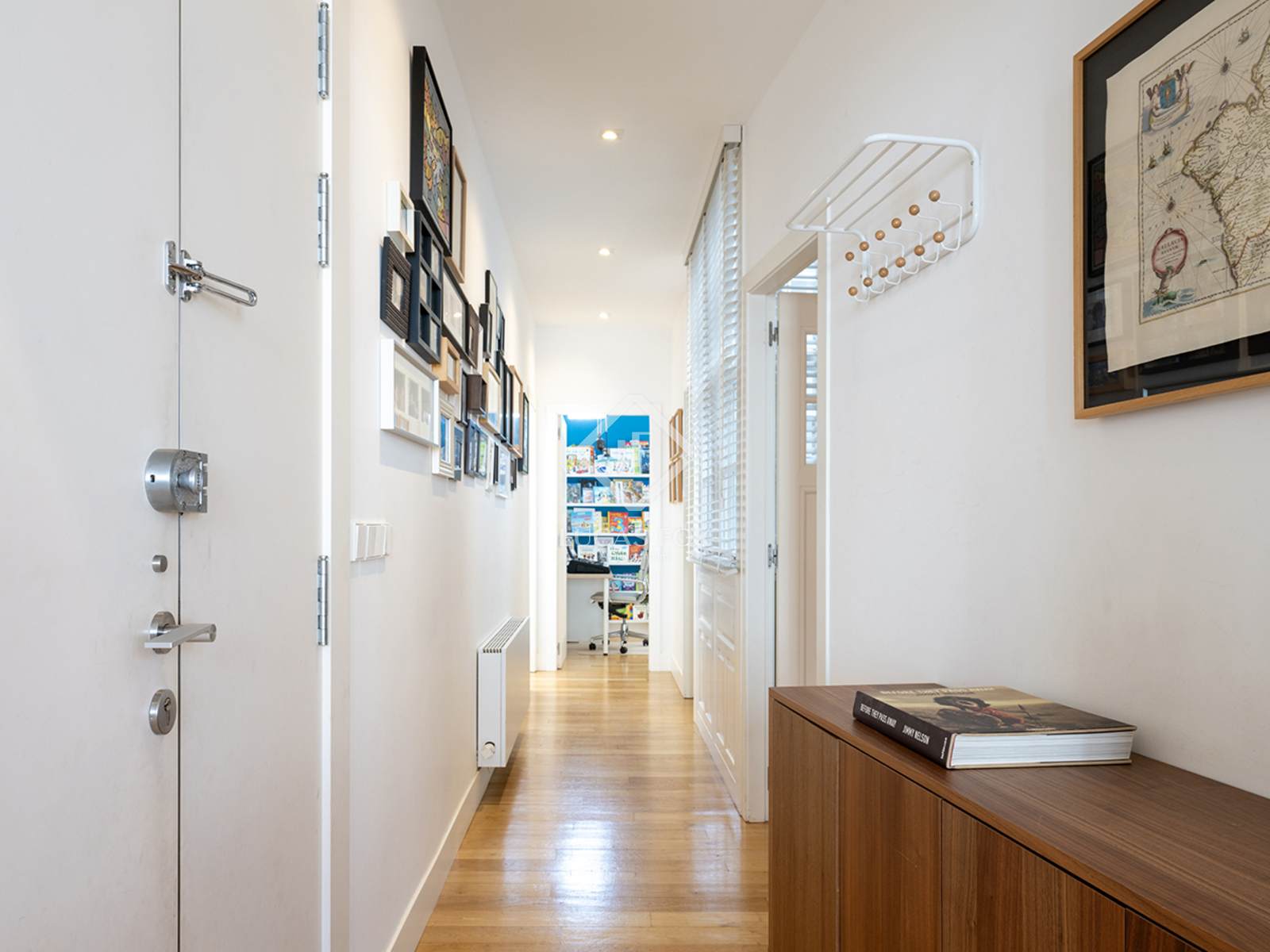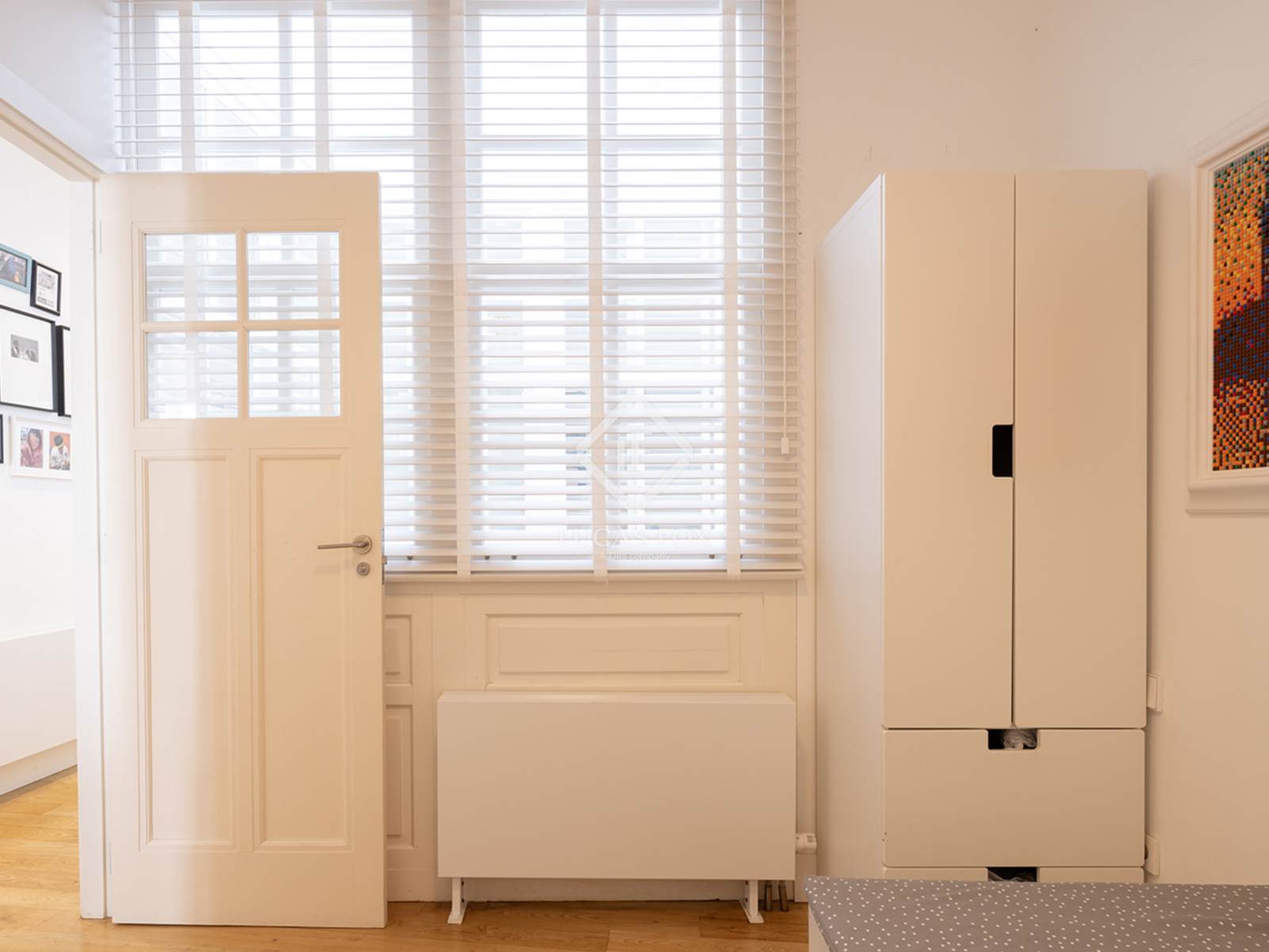 Climbing the antique staircase, we enter through the main door into the centre of the apartment. To the right, the current owners have opened up the property to provide a single open kitchen, dining room, and lounge. The gallery has two entrances, with antique sliding doors brought in from Sweden, one of the little touches left by the architects who planned the new layout and design of this attractive home. The gallery faces north and so provides a constant light in the living area throughout the day. The kitchen is stylish and there is a made-to-fit dining table with benches.