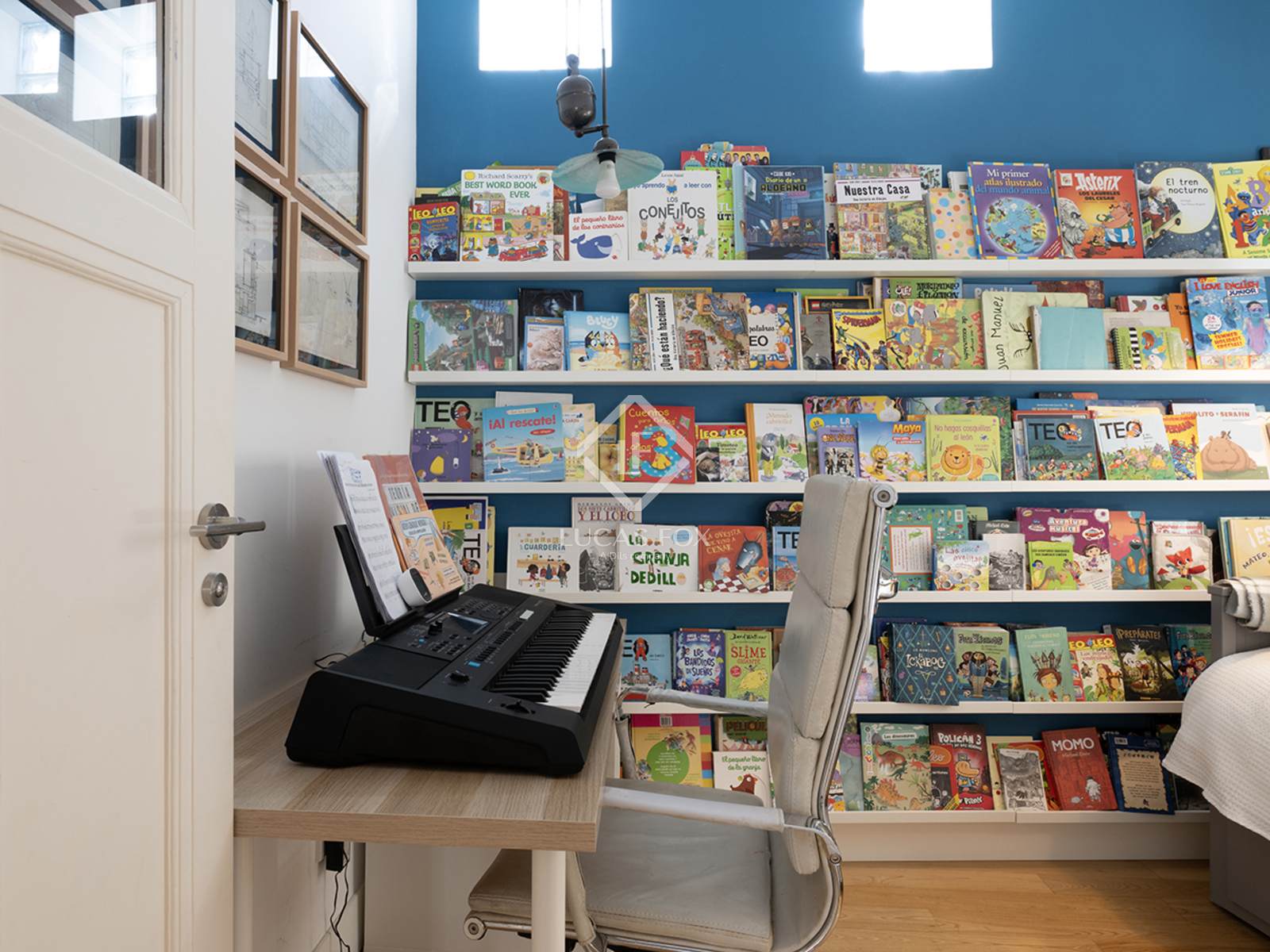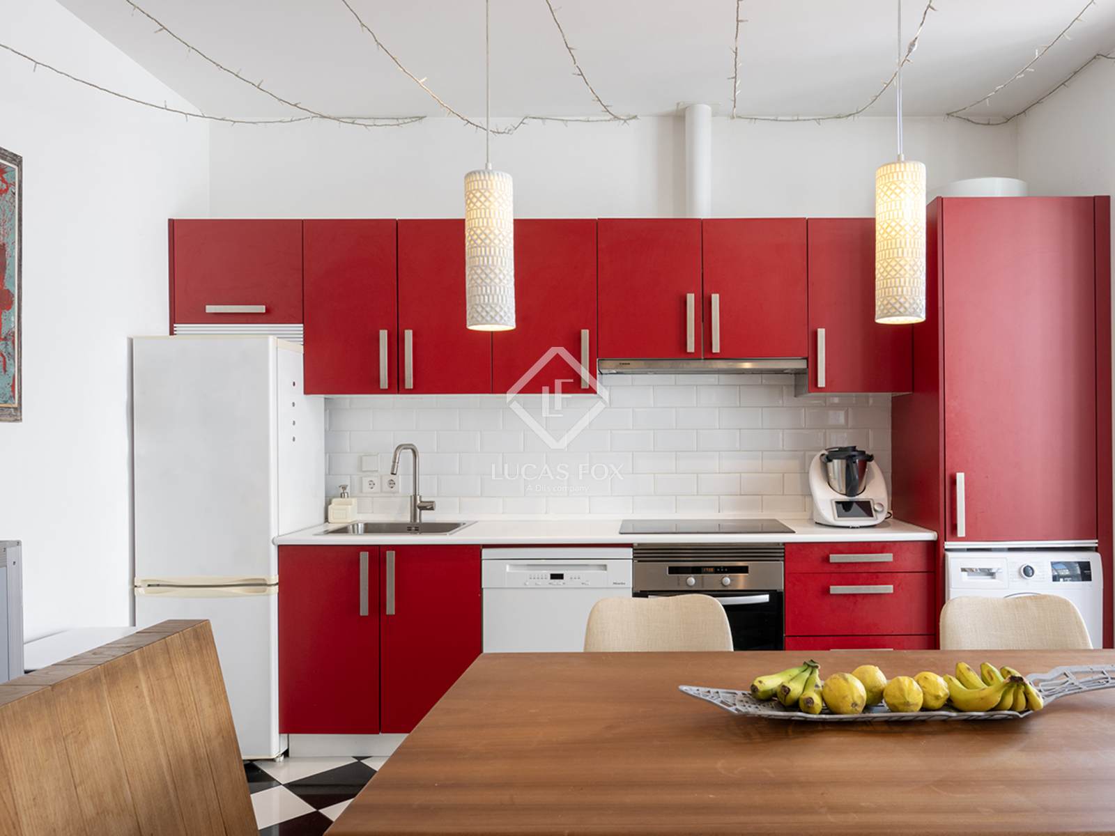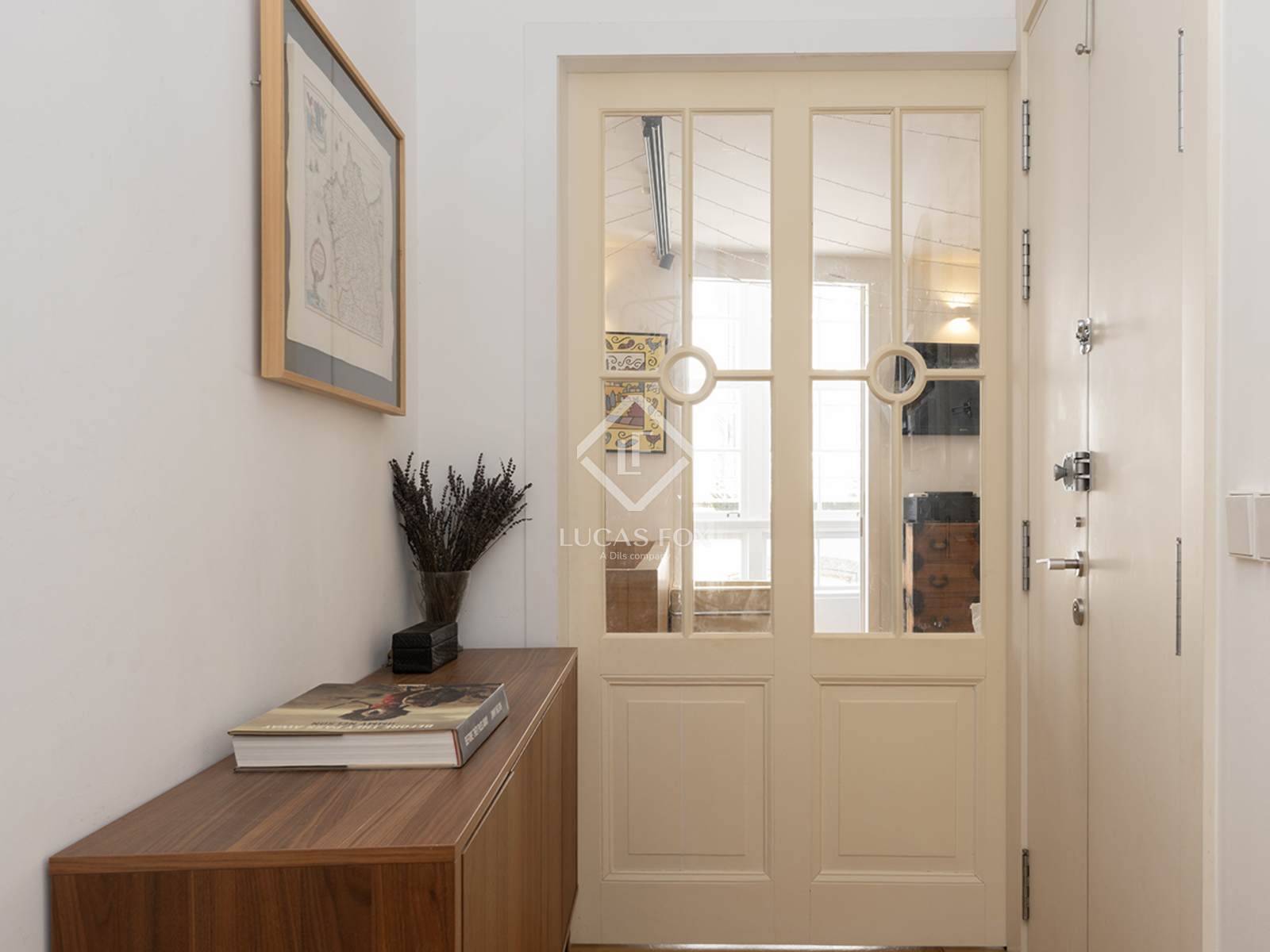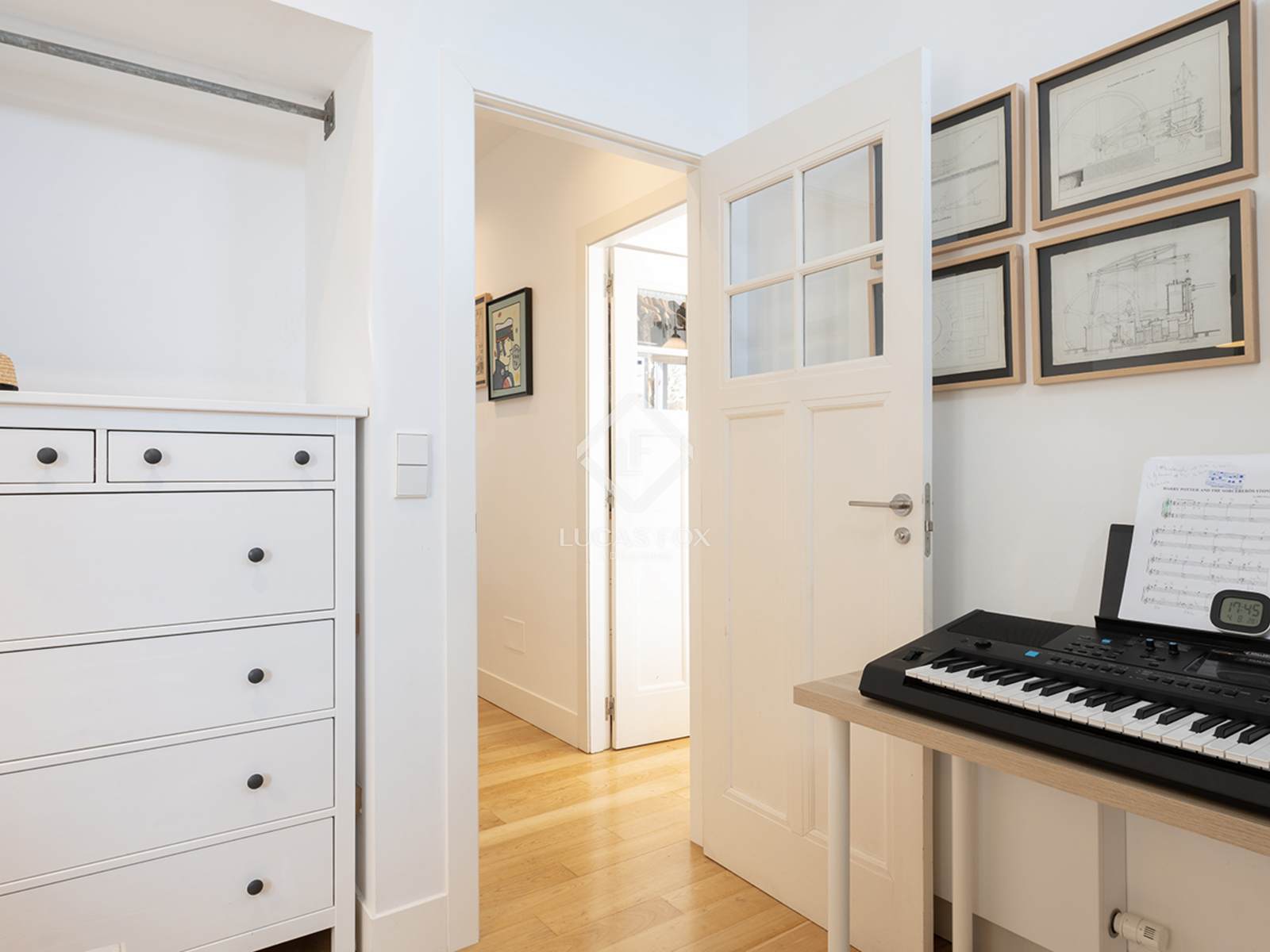 Climbing the antique staircase, we enter through the main door into the centre of the apartment. To the right, the current owners have opened up the property to provide a single open kitchen, dining room, and lounge. The gallery has two entrances, with antique sliding doors brought in from Sweden, one of the little touches left by the architects who planned the new layout and design of this attractive home. The gallery faces north and so provides a constant light in the living area throughout the day. The kitchen is stylish and there is a made-to-fit dining table with benches.