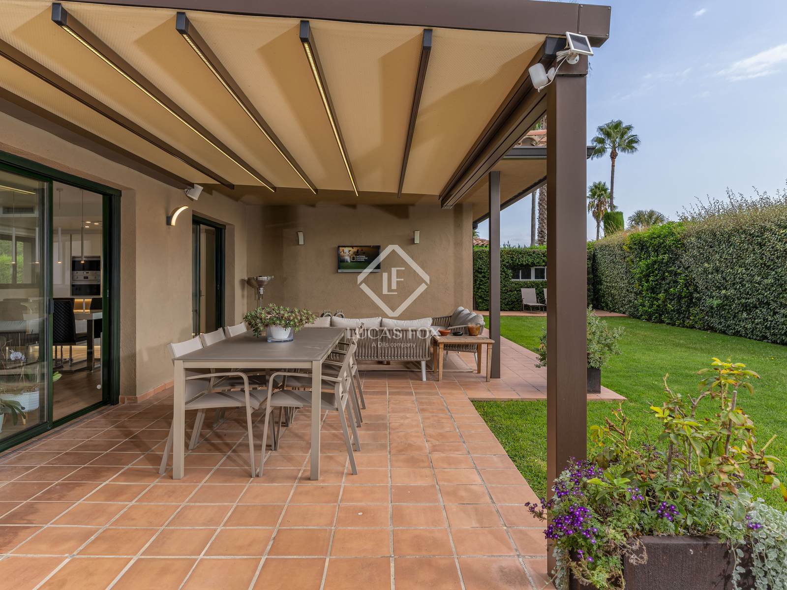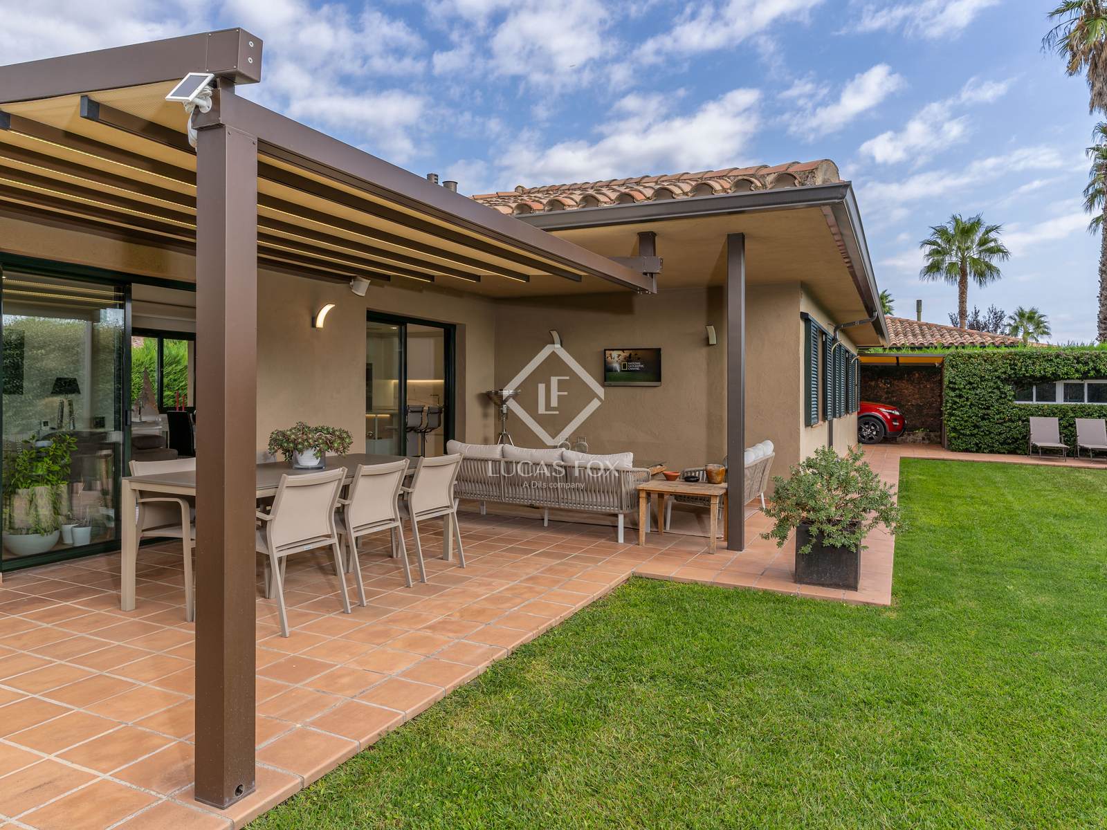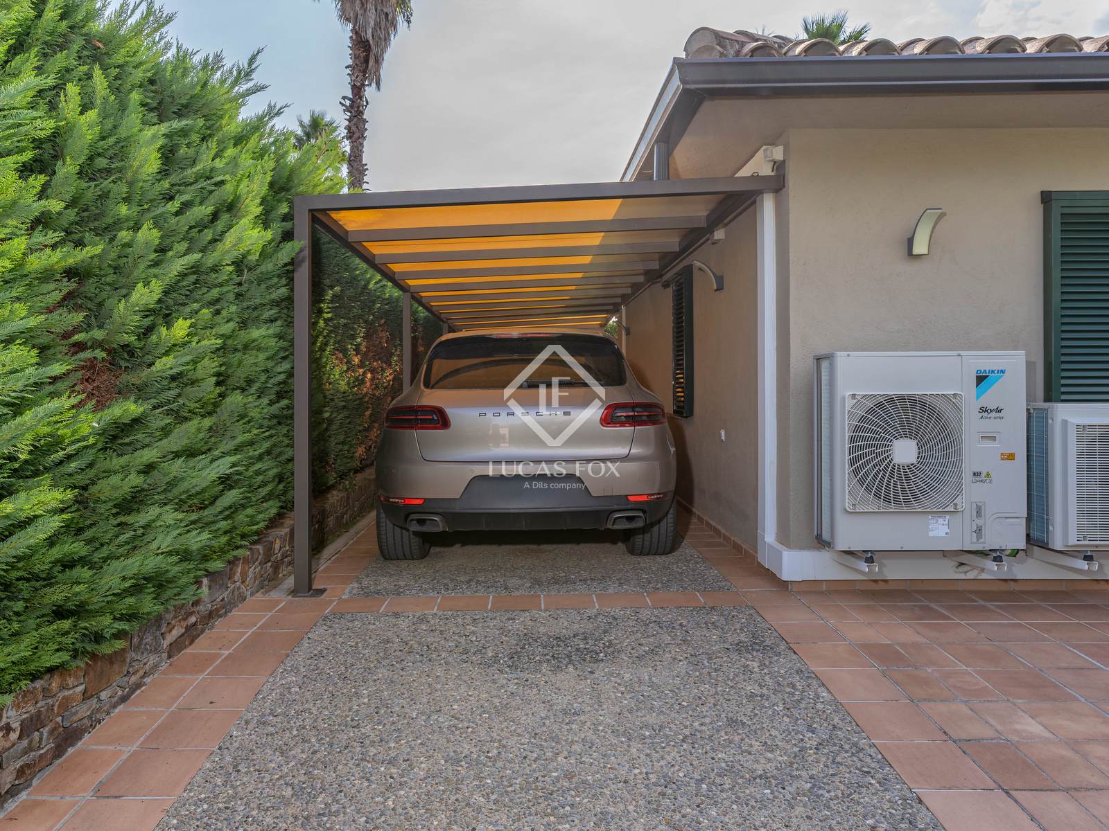 Additional features include a large exterior storage room, a covered parking area for two vehicles with an automatic gate, and practical smart-home elements such as Wi-Fi-controlled irrigation and climate systems. The house also benefits from ducted air conditioning and heating, propane-powered central heating, and double-glazed windows that ensure thermal and acoustic efficiency.