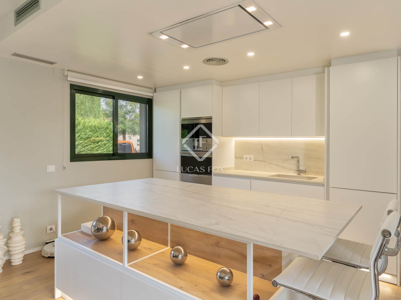 The interior layout is welcoming and well-balanced. Upon entering, a light-filled entrance hall opens into a spacious living and dining area, designed in an open-plan configuration that encourages connection and ease of movement. A bioethanol fireplace adds subtle warmth and a focal point to the room. Adjacent to the living space, the modern kitchen is integrated seamlessly, functional and well-appointed, ideal for everyday cooking and entertaining alike.