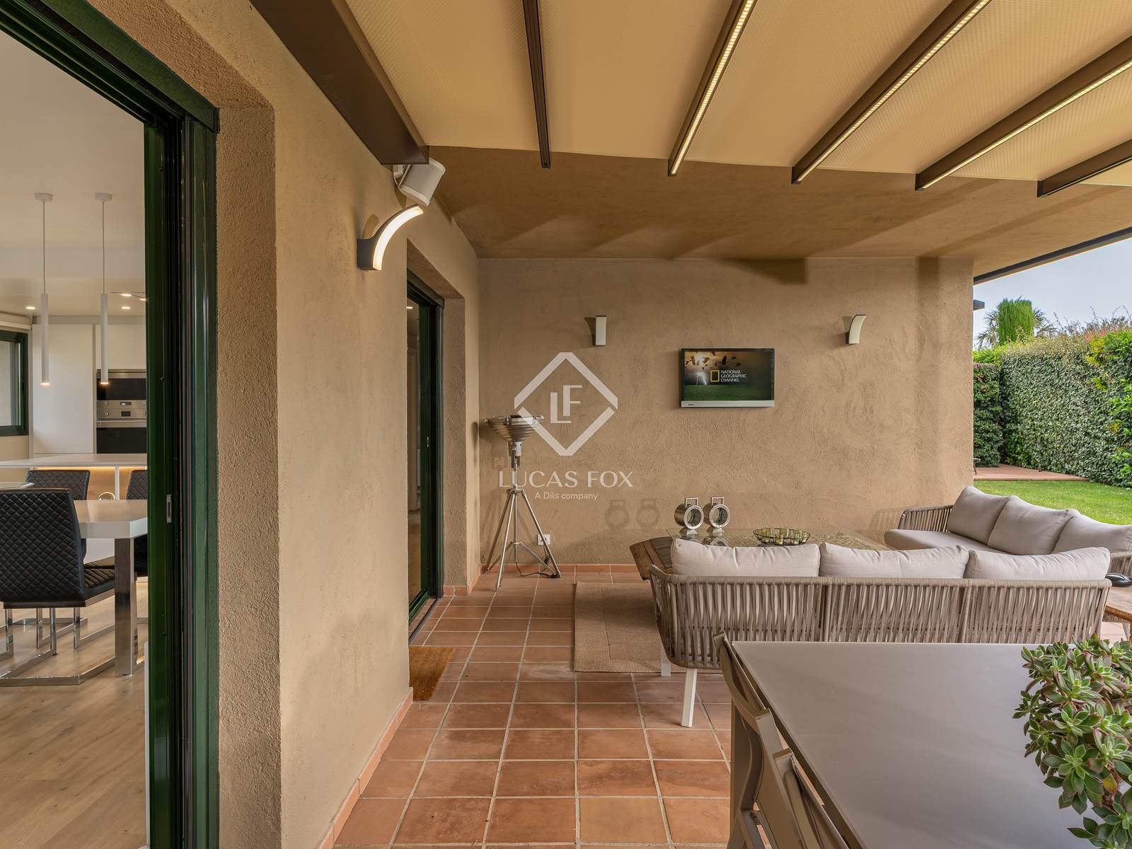 Outside, the property continues to impress with a covered porch that provides a sheltered space for outdoor meals or quiet afternoons. The garden is spacious and well-maintained, with carefully placed lighting that allows it to be enjoyed well into the evening. A dedicated barbecue area makes this space especially suited for informal gatherings or relaxed weekends at home.